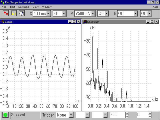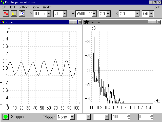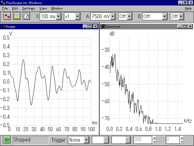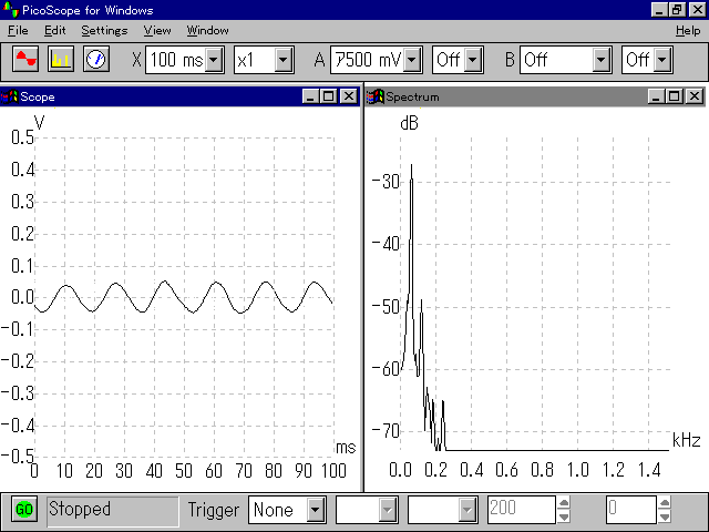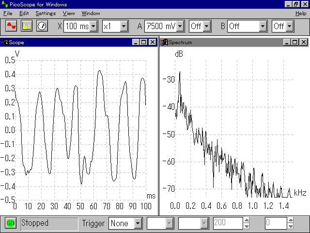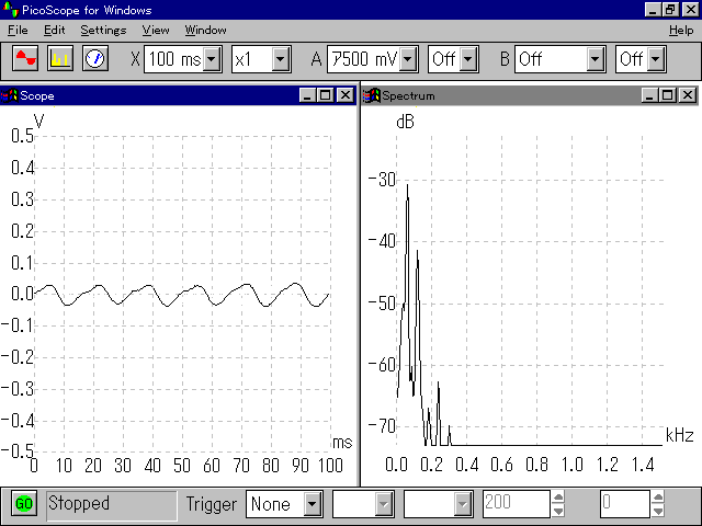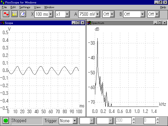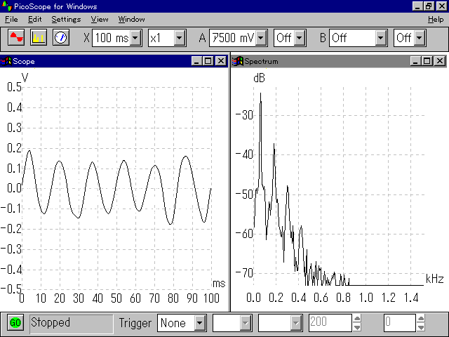 電極からのアナログ信号とDSP処理によるハム除去後信号