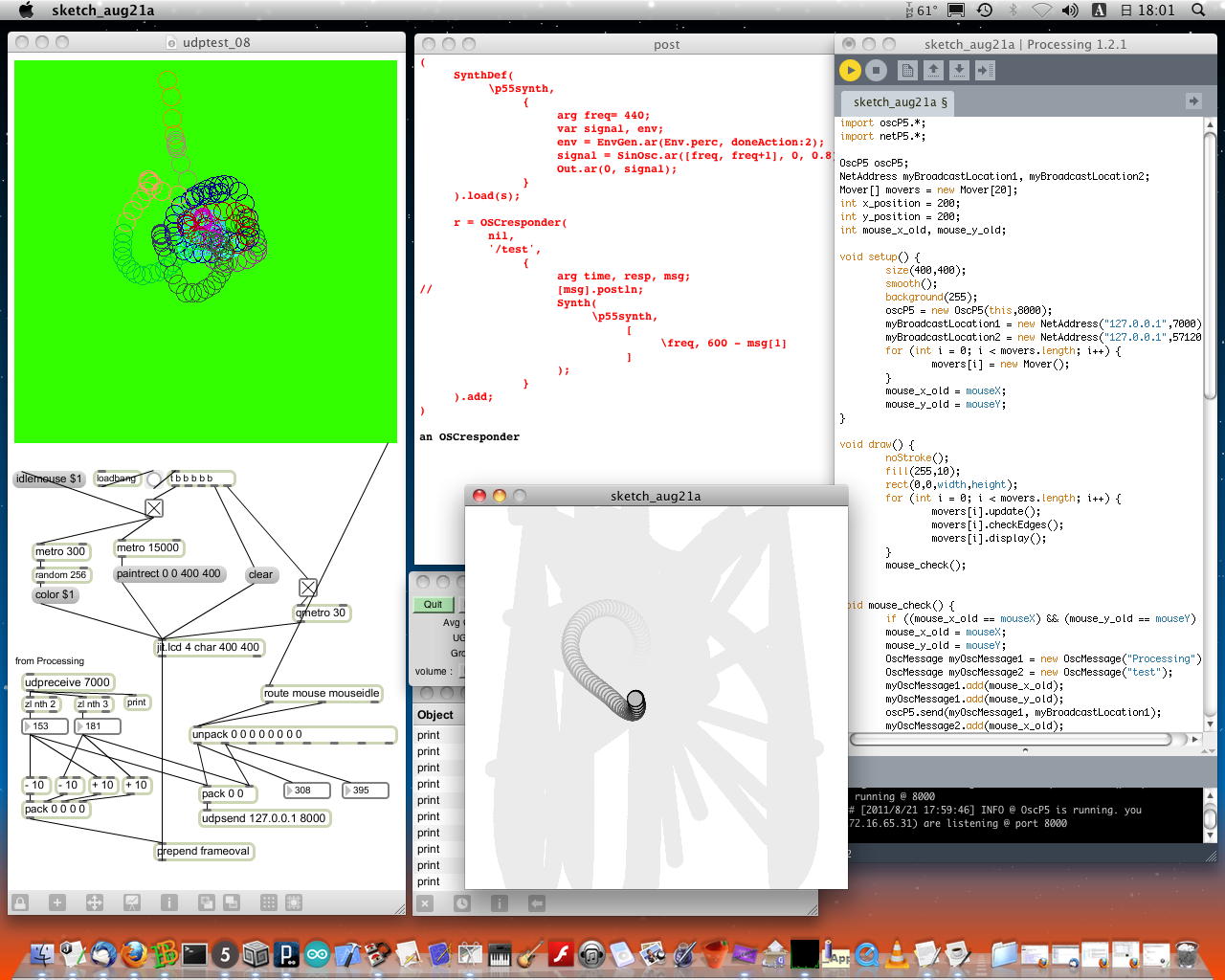 昨日は朝06:55に院生の杉浦さんとSUACを出発して、東名高速を走行中にカーナビのTV音声(走行中は映像は出ない)でなでしこジャパンの決勝進出を聞き、首都高速を抜けるのに1時間半ほどかかったものの、なんとか予定の13時ほぼちょうどに筑波大に到着して、上の写真のようにワークショップ初日を終えた。 その後、大学近くの中華料理屋での夕食会、そしてホテルに戻ってデジカメ写真をアップしたところで爆睡したが、身体時計はちゃんと午前5時に起床となり、コーヒーとともに出発前に 筑波大ワークショップ のページを改訂した。 昨夜は下のような情報が金箱さんから届いたりして、夜中から今日に繋がっている。 このところ、京都芸大と筑波大のワークショップに比重を置き、さらに新楽器(まだ名前ナシ)を作ったりしていて、気付いてみればopenFrameworksに触っていなかった。 どこまでやったかも忘れていたので探してみると、「6月20日」の新潟から帰る新幹線の中で作った CVのモーション検出 までだったと判明した。 映っている僕が何も着ていないのは、出張族のお父さんは皆んな部屋では全裸、というだけの事なので気にしないで欲しい(^_^;)。 そして、まだ出かけるまで1時間ほどあるので、またまた「思い出し」として、Denisの本のPDFを見ながら、ちょっとだけでも進めることにした。