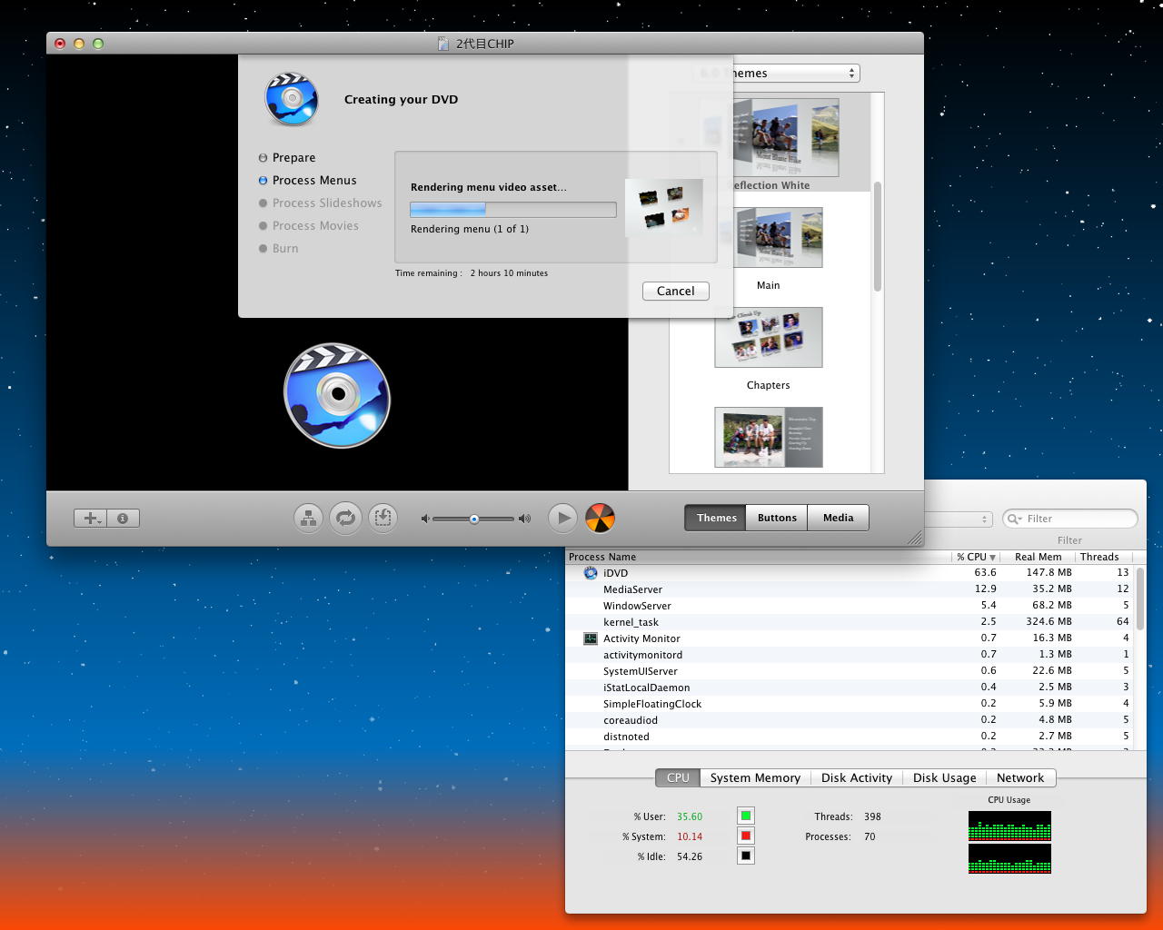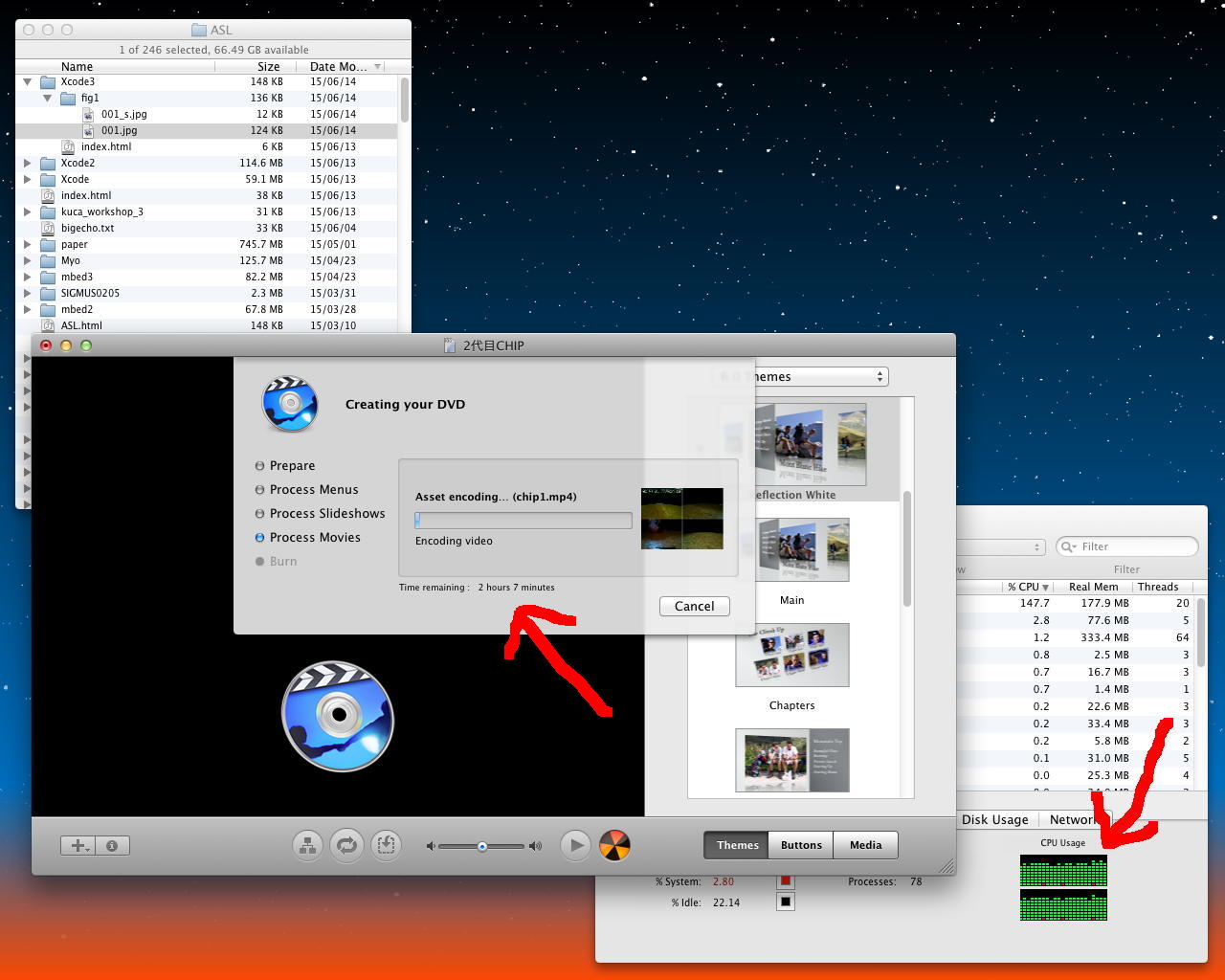 そして天寿を全うして100日が経過した2代目の記録Movie ★ ★ ★ ★ を、自宅でいつでも見れるようにDVD化して欲しい、という奥さんからのリクエストに応えて、朝イチのお仕事は上のように、iDVDでのレンダリング・エンコーディングである。 2.26GHz Intel Core2DuoのCPU使用率がほぼ200%一杯、CPU温度は75℃で2時間以上(これが4本のMovieの全てなのか1本目の事なのか不明(^_^;))、というなかなかのハードワークである。 マスターDVDが出来てしまえば、研究室のDELLノート(WindowsXP)での複製作業に移行することになる。