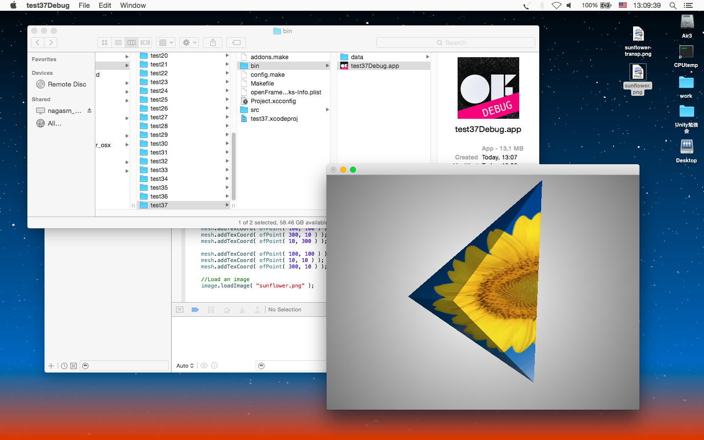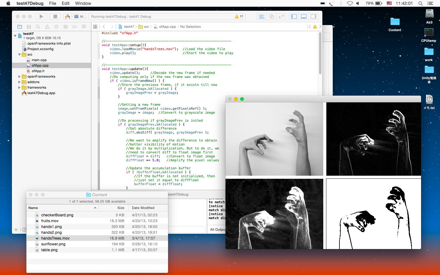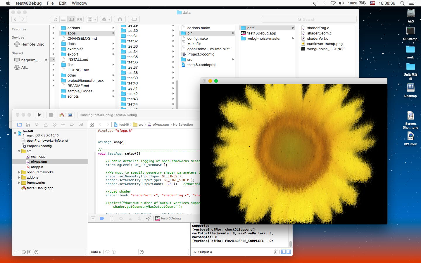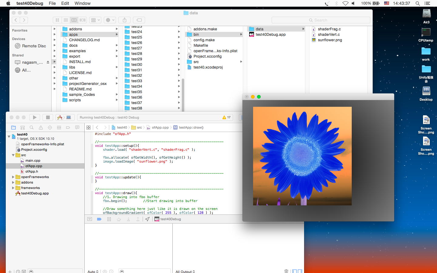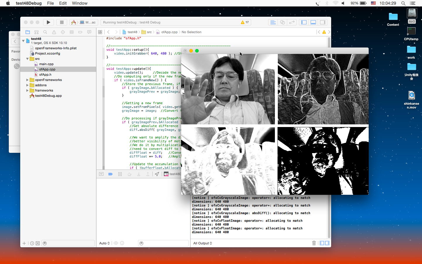 とりあえずこれまでの方法で実験用のプロジェクトを作って、サンプルにあるように「src」ディレクトリの横並びで「data」ディレクトリを置いて中身をコピーしてみたところ、上の右のように、エラーメッセージとともに何も出なかった。 そこであれこれ試行錯誤して、以下のように出てきたのは、「data」ディレクトリを「bin」ディレクトリの直下に置く、というものだった。 このあたり、Denisの本が出た2013年から、openFrameworksもXcodeもバージョンが進展するなかで生まれた不整合だろう。
