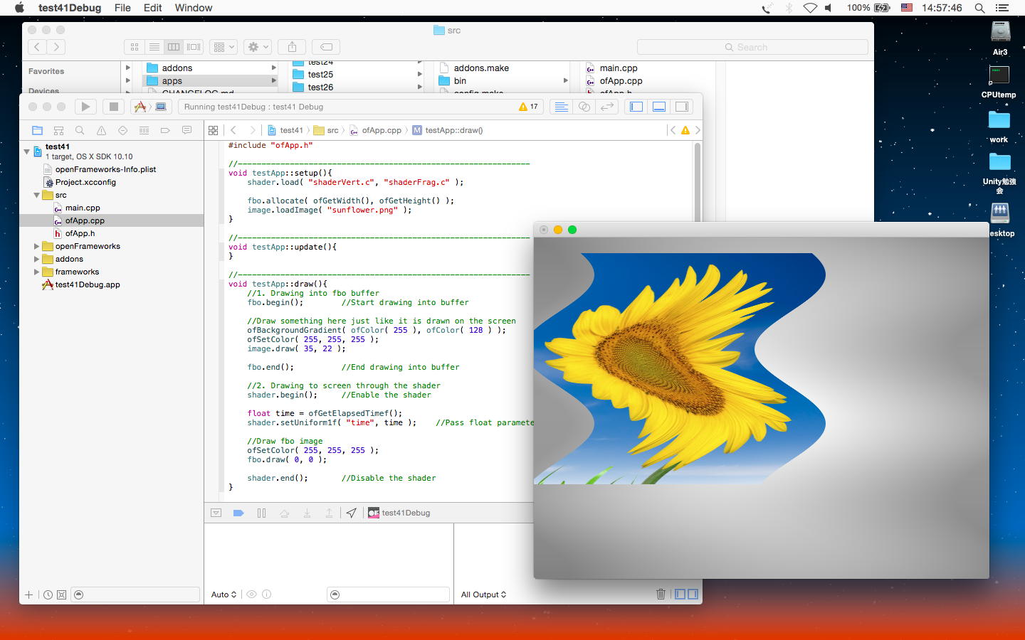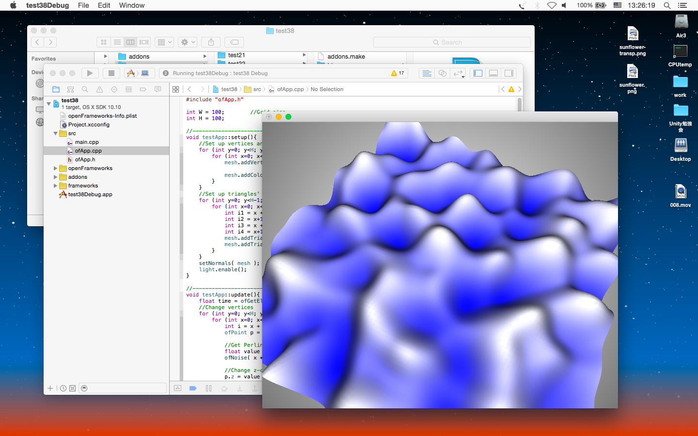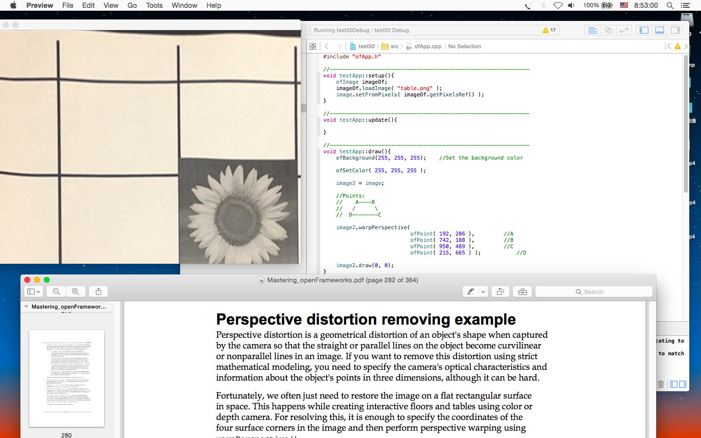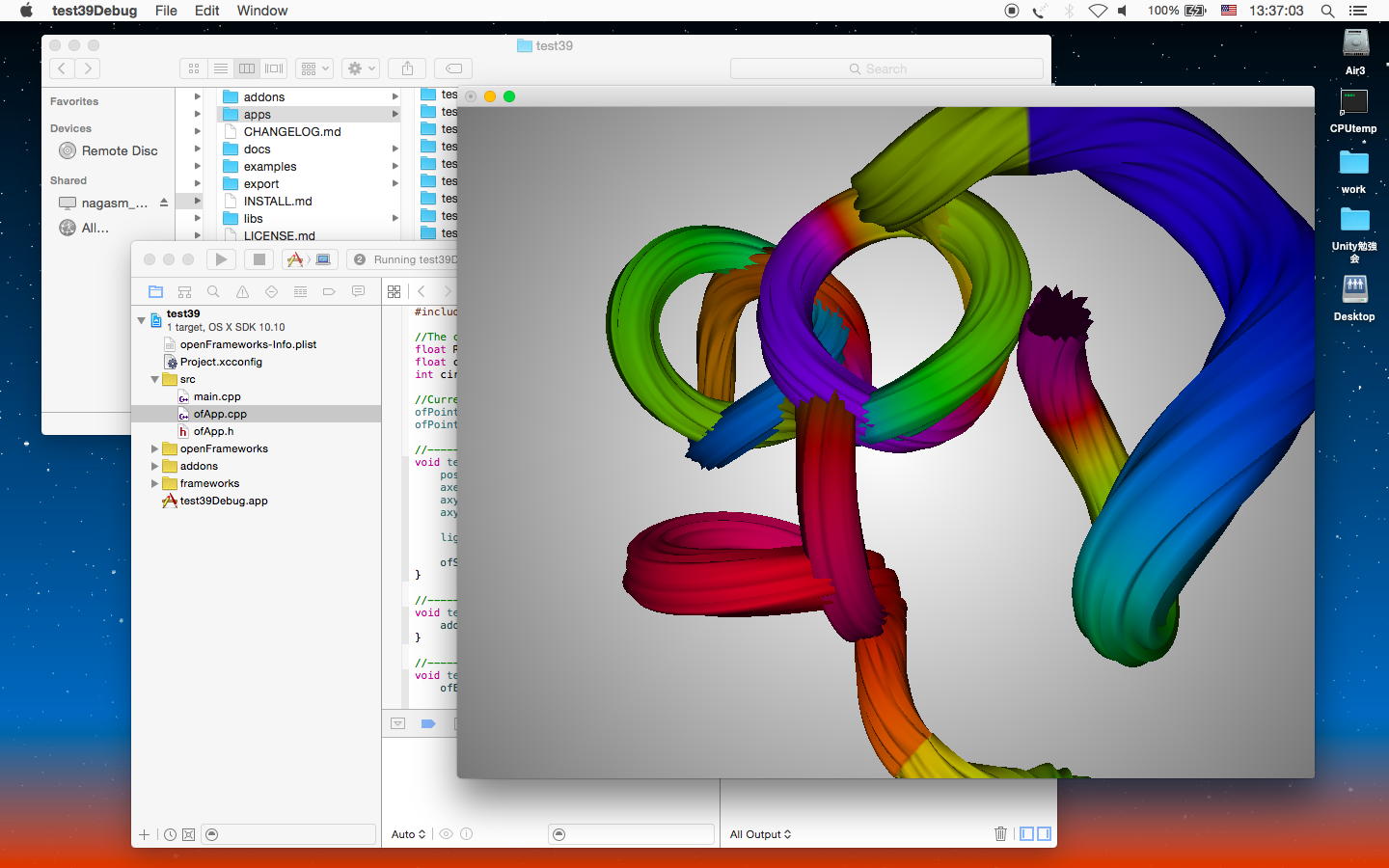 とりあえずこれまでの方法で実験用のプロジェクトを作って、サンプルにあるように「src」ディレクトリの横並びで「data」ディレクトリを置いて中身をコピーしてみたところ、上の右のように、エラーメッセージとともに何も出なかった。 そこであれこれ試行錯誤して、以下のように出てきたのは、「data」ディレクトリを「bin」ディレクトリの直下に置く、というものだった。 このあたり、Denisの本が出た2013年から、openFrameworksもXcodeもバージョンが進展するなかで生まれた不整合だろう。