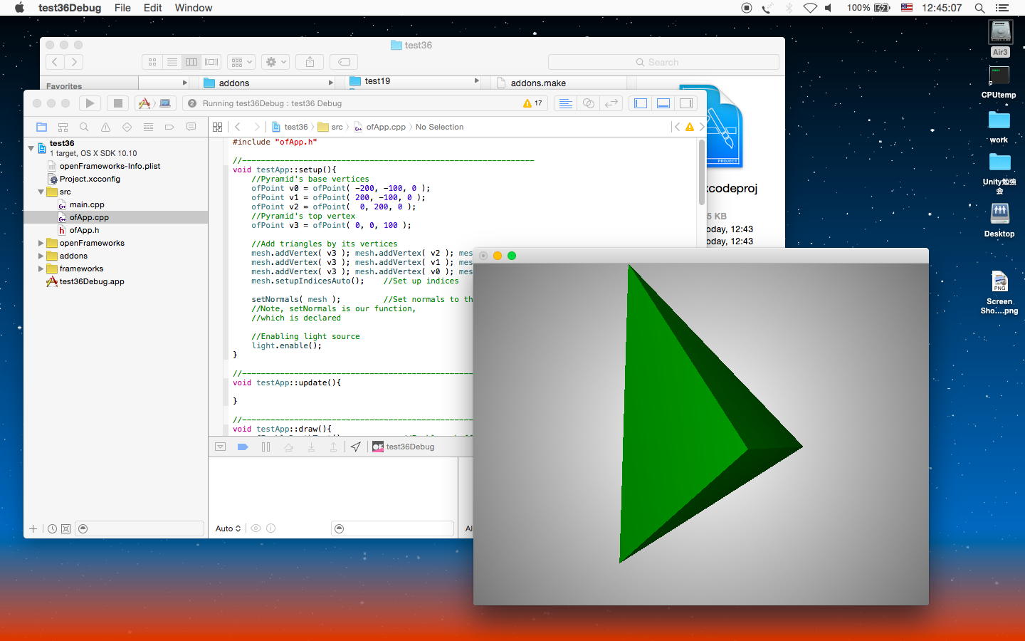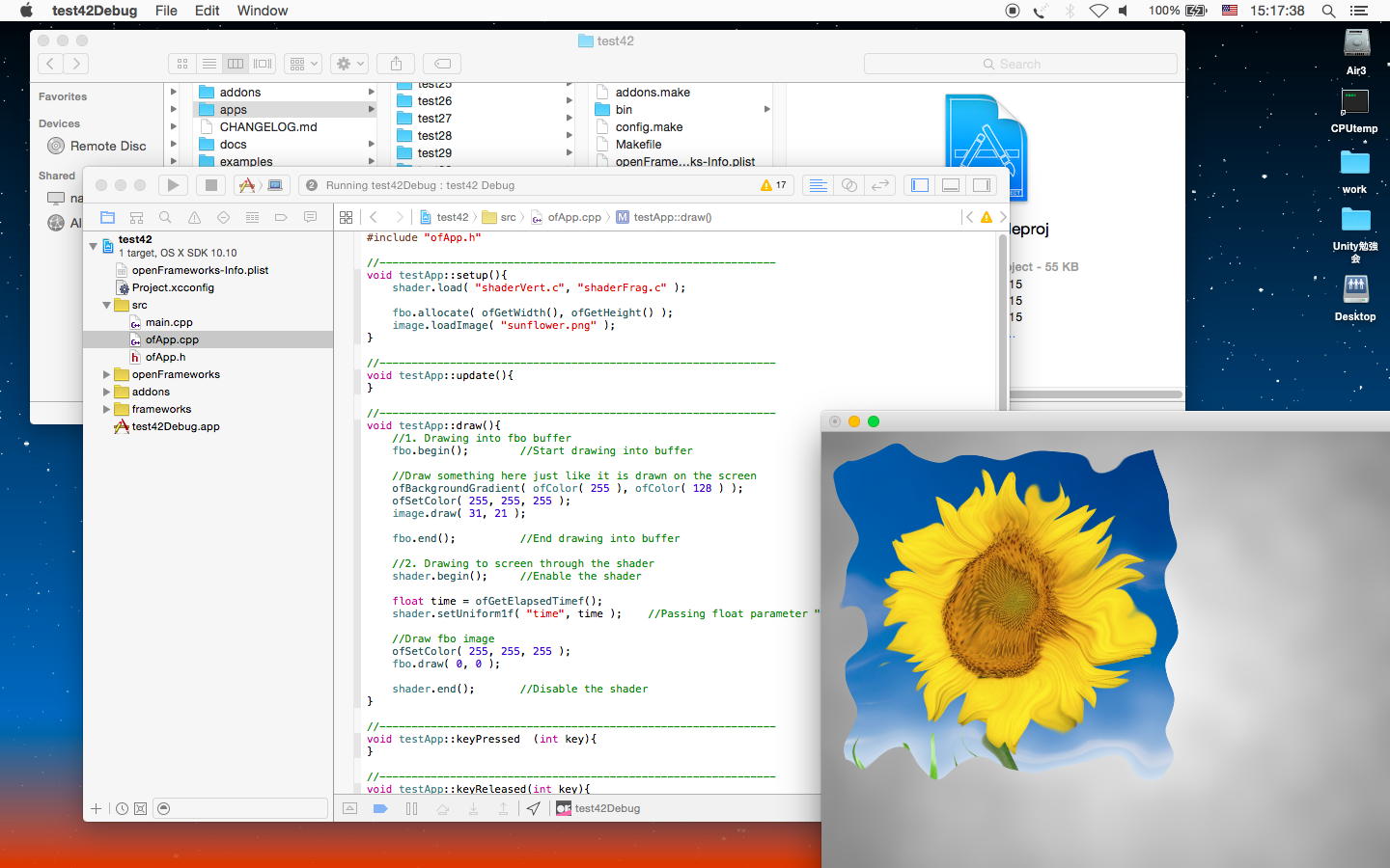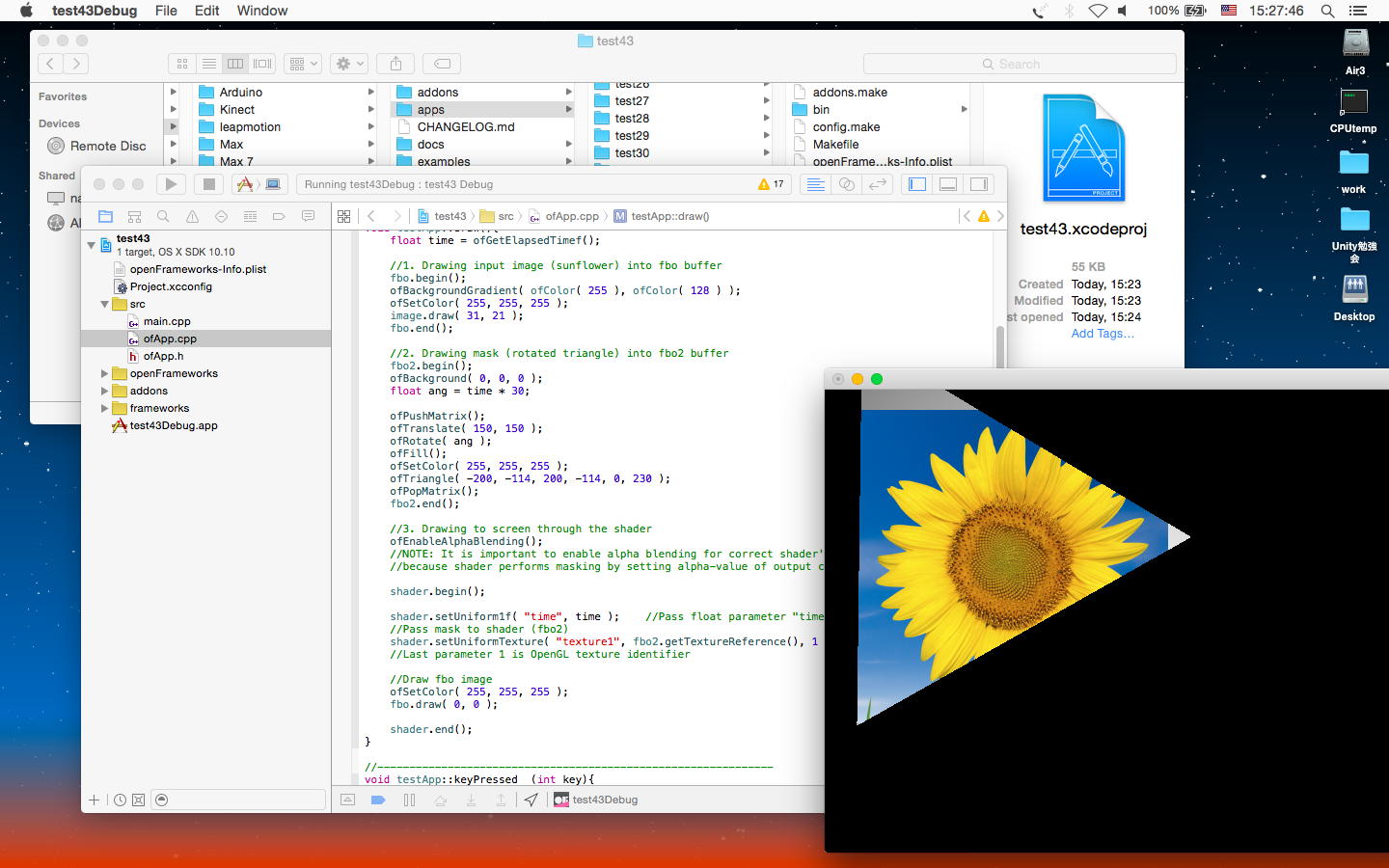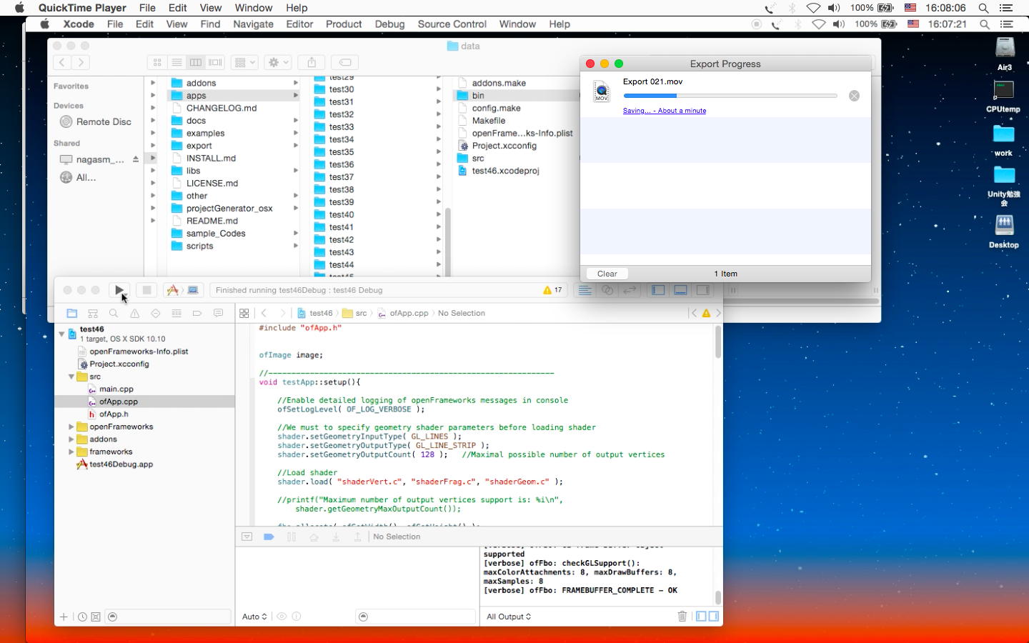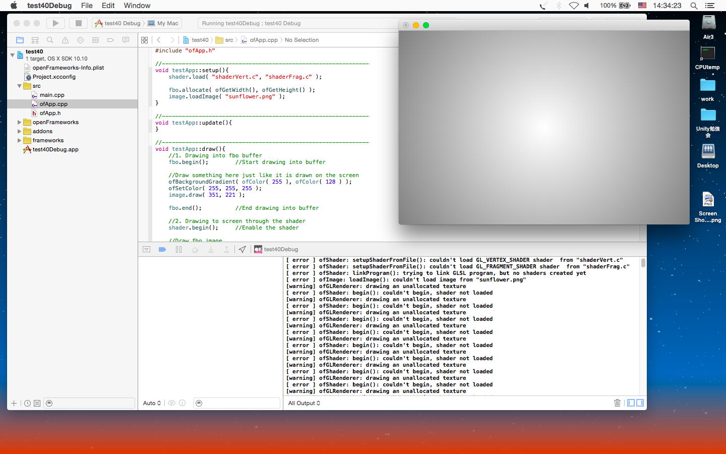 とりあえずこれまでの方法で実験用のプロジェクトを作って、サンプルにあるように「src」ディレクトリの横並びで「data」ディレクトリを置いて中身をコピーしてみたところ、上の右のように、エラーメッセージとともに何も出なかった。 そこであれこれ試行錯誤して、以下のように出てきたのは、「data」ディレクトリを「bin」ディレクトリの直下に置く、というものだった。 このあたり、Denisの本が出た2013年から、openFrameworksもXcodeもバージョンが進展するなかで生まれた不整合だろう。