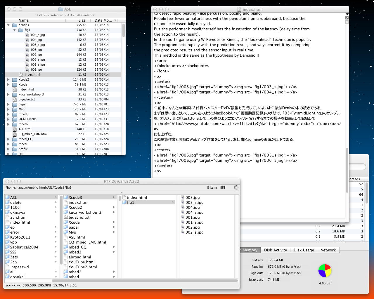 あいかわらずネットは 中国バブル崩壊? で盛り上がっているが、この日はXcodeもopenFrameworksも進めることなく、いろいろと「仕込み」に没頭した。 音楽情報科学研究会・夏シンポ(8月下旬・名古屋大)については、まだまだ平田さんとの「オーガナイズドセッション」の企画についてやりとりしている。 秋のバイオフィードバック・セミナーに関しては、甲南女子大の辻下先生が、来週月曜日の夕方に僕の研究室に寄ってくれることになったので、ここでアウトラインが決まりそうである。 明日には某研究所の研究員がまた1106に来て、共同研究がいよいよ動き始める。そして今日の最大の進展は、 2nd International Symposium on Sound and Interactivity のペーパーの最終原稿について、レフェリーのアドバイスを受けて。国際文化学科のnativeのRyan先生にチェックしてもらうために、やや原稿に加筆して完成させた。 これで「赤」を入れてもらったら、最終版を完成させて送付して、とりあえずの準備が完了する。 この後に、EC2015の原稿を出して、さらに音情研・夏シンポの予稿を書く・・・という流れである。