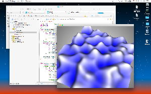 以下の「06-OscillatingPlane」は、Denisの本の巻末に詳しく解説されている「Perlin Noise」という、ジャンプしないで滑らかに、しかしランダムを生成するという関数を使って、mesh平面をランダムにうねうねさせているもので、その平面全体が このように 3次元空間内で回転する。