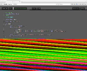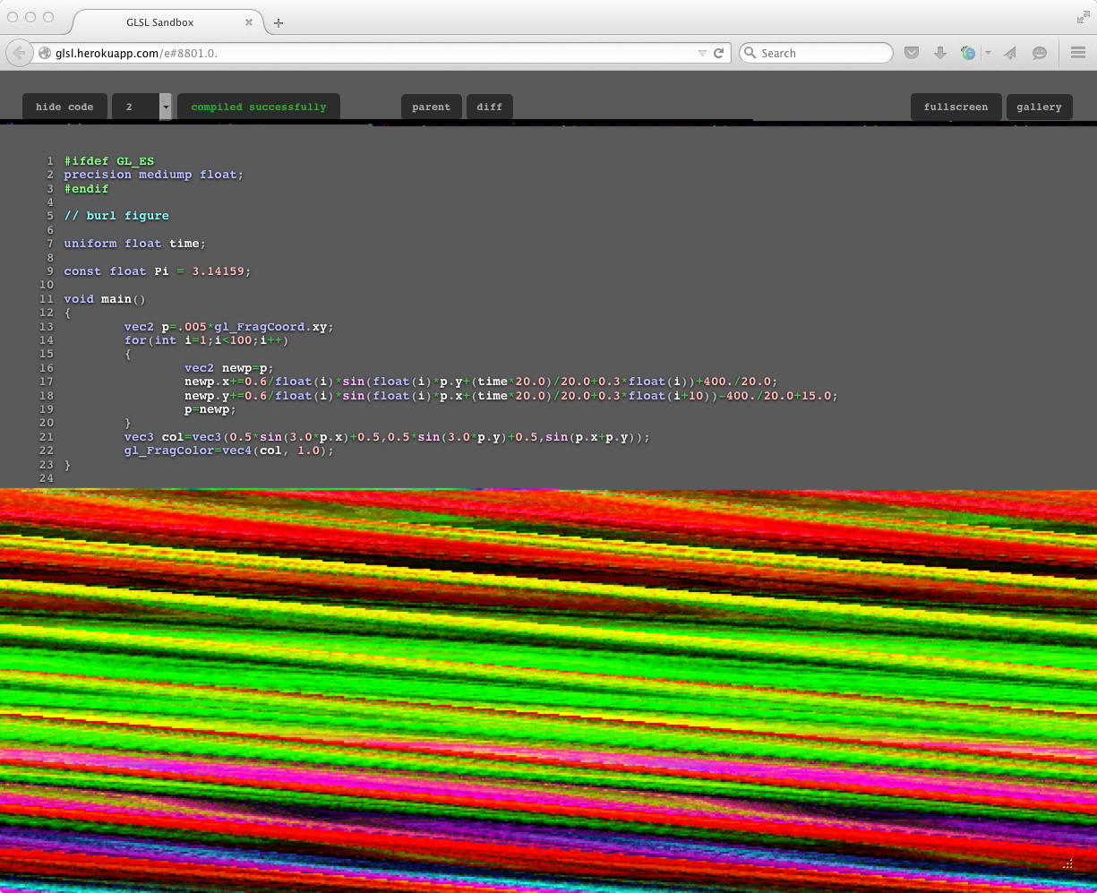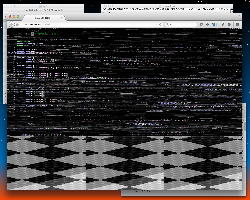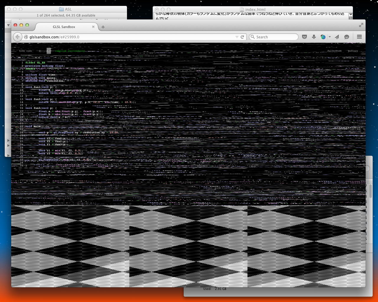 Denisの本には「ここにオンラインのShaderのサンプルがたくさんある」として、 ここ が紹介されていたが、URLも変更になっていたし、上のように何故か画面が乱れて、個々のサンプルは見れず、さらには最新のFirefox38.0.5がハングアップして、散々な目に遭った。 Denisの本に「They contain galleries with examples of great shaders which you can learn and use in your projects. For example, try...」と載っていた ここ も、以下のように駄目だった。 何かワラワラと動いているのだが、スクリーンの画面情報との整合が取れていない。 これはFirefoxとの相性(バグ)の可能性もある。