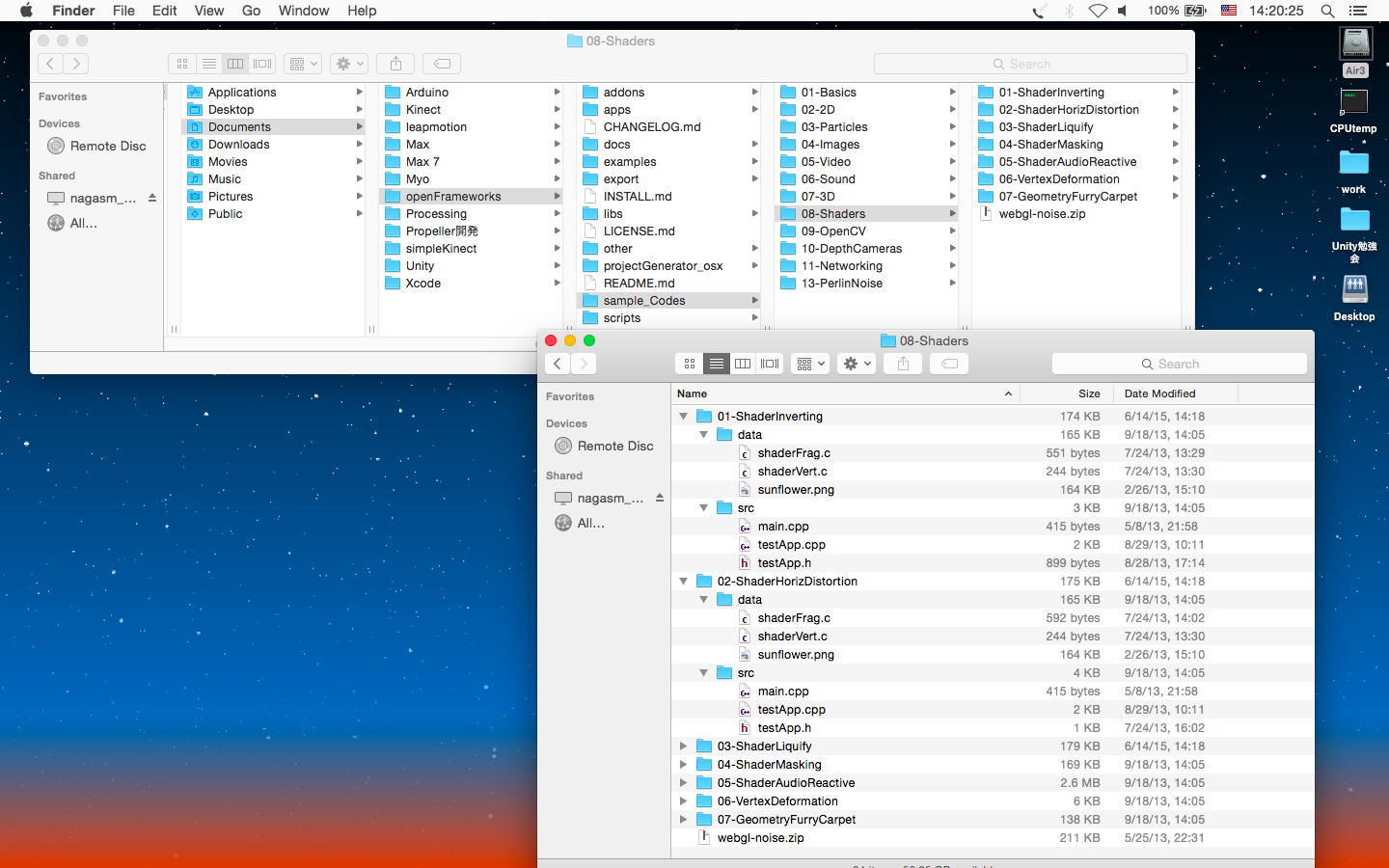 まだあれこれ解説はあったが、とりあえずサンプルを見てみよう・・・と探していくと、これまでの章とはサンプルデータの構造が異なっていた。 下の左のように、例えば最初の「01-ShaderInverting」の直下に、これまでは3つのソースが置かれていたのに対して、ここでは「data」と「src」という2つのディレクトリがあり、これまでのXcodeソースが「src」に置かれて、一方「data」には素材の静止画ファイルに加えて、いずれも中身が「main()」である2つのCソースが置かれている。 これをコンパイル時に使うとしたら、ちょっと謎である。