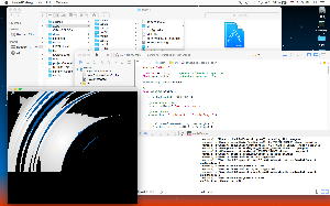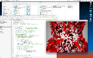 以下の「05-ShaderAudioReactive」は、オーディオ入力(ここではwavファイルを単純に再生したサウンド)によって、リアルタイム生成3次元CGのエフェクトをかけていて、つまりはiTunesなどによくある「ビジュアライザ」で、 このように なっているが、この動画はデスクトップ動画でサウンドが無いので、音は確認できない。