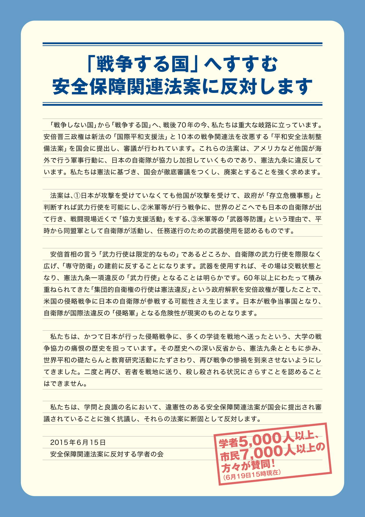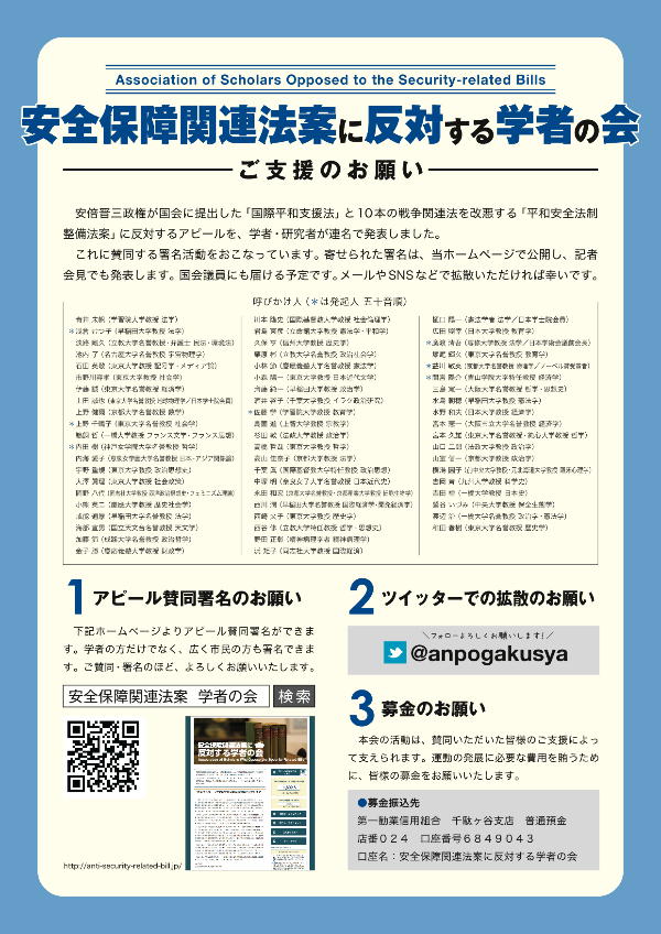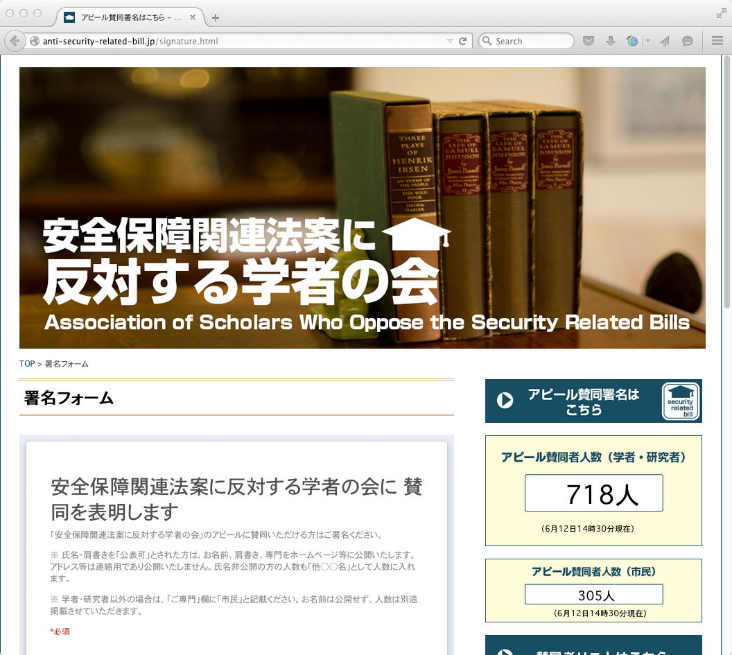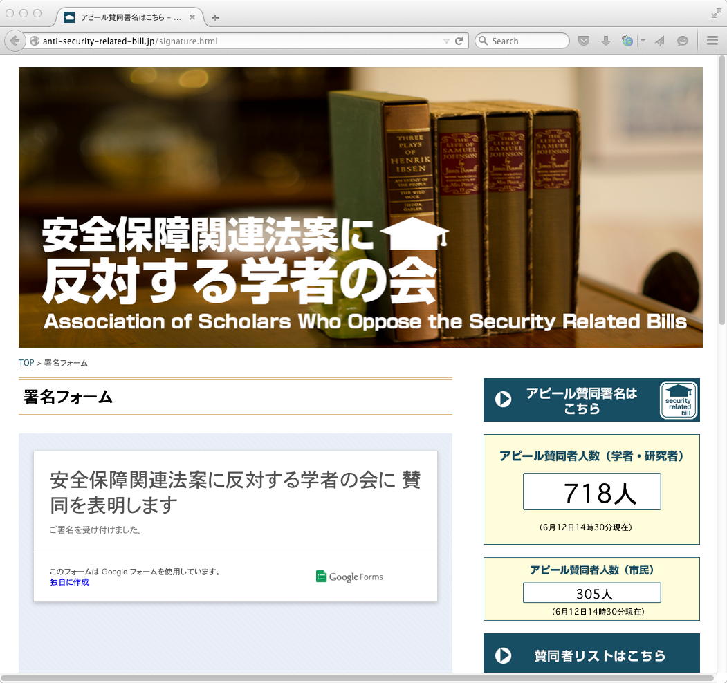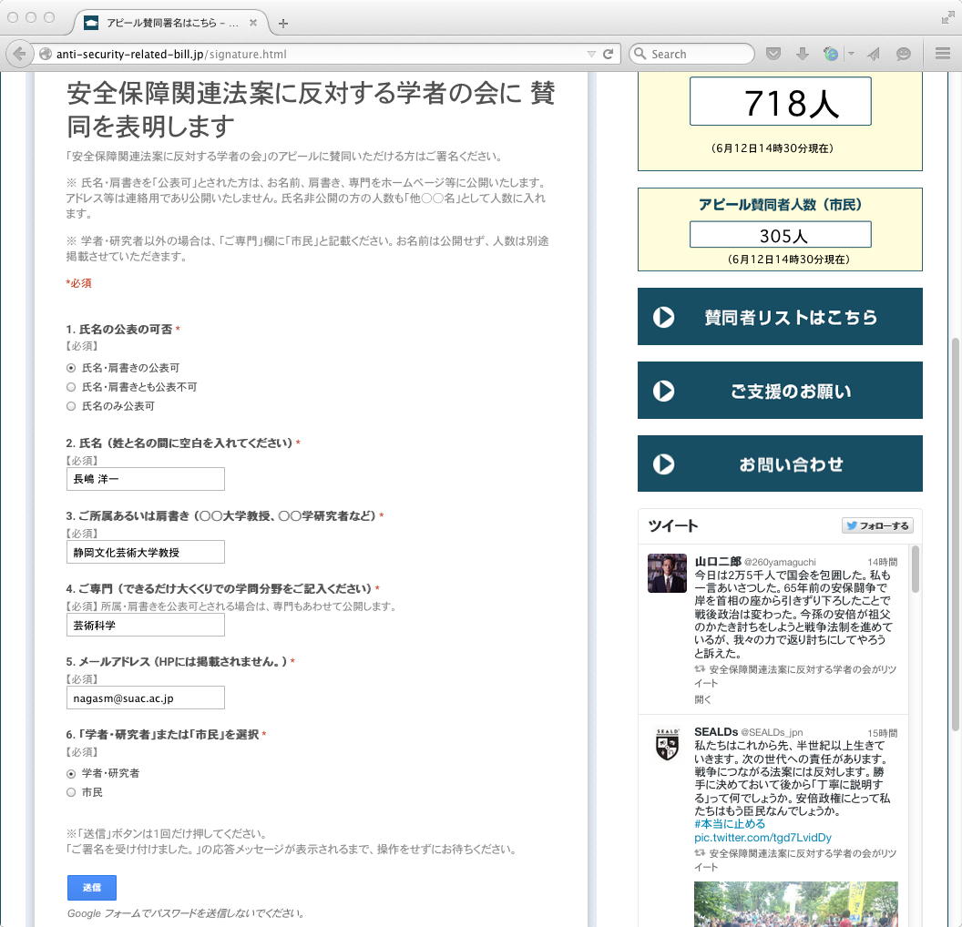 特定秘密保護法に反対する学者の会の皆様へ 特定秘密保護法に反対する運動へのご参加に感謝しています。 安倍政権が「戦争法」といえる違憲立法を国会提出しましたので、このたび「安全保障関連法案に反対する 学者の会」を約60人の呼びかけ人で立ち上げました。以下のURLのホームページで賛同人を募っています。 ホームページの賛同署名フォームから、賛同人になっていただくよう、お願いします。 安全保障関連法案に反対する学者の会ホームページ http://anti-security-related-bill.jp/ 佐藤学(学習院大学教授)そしてもう1本は、上のようなメイルである。 迷わず以下のように賛同署名したので、たぶん明日か明後日には、 安全保障関連法案に反対する学者の会 にも僕の名前が載ることだろう。 今日の段階でこのページを「静岡」で検索すると、静岡大学の先生が3人ヒットしたが、SUACはゼロだった。 ちょっと情けない。(^_^;)