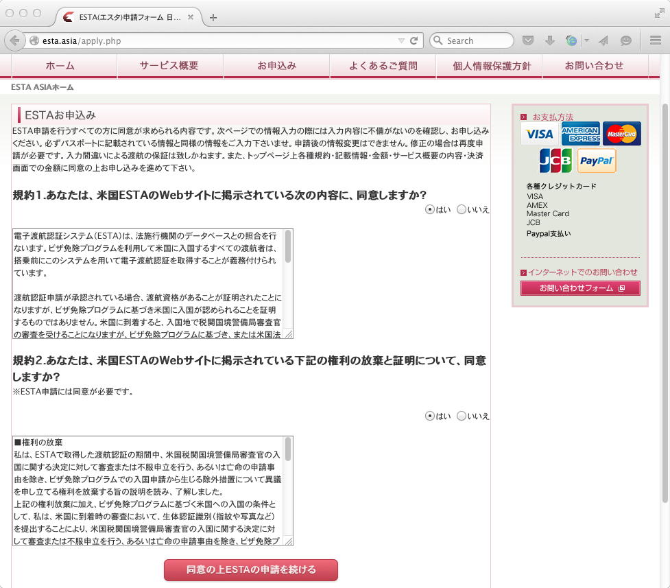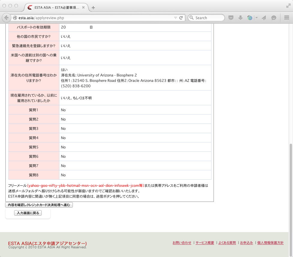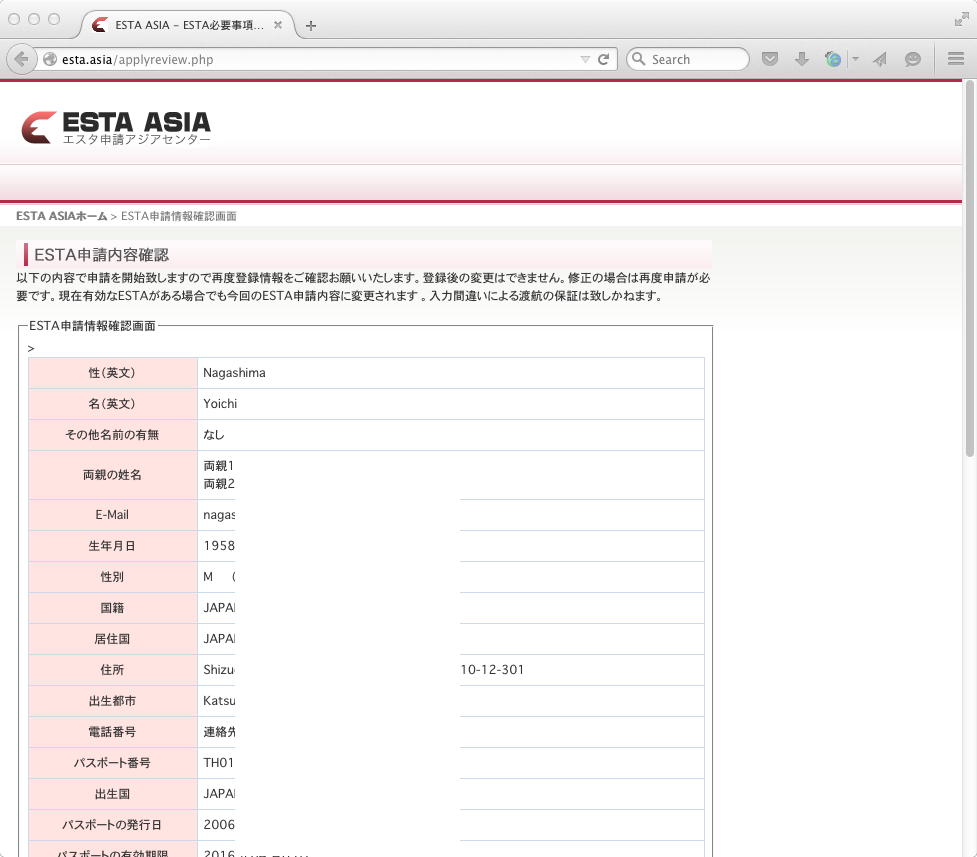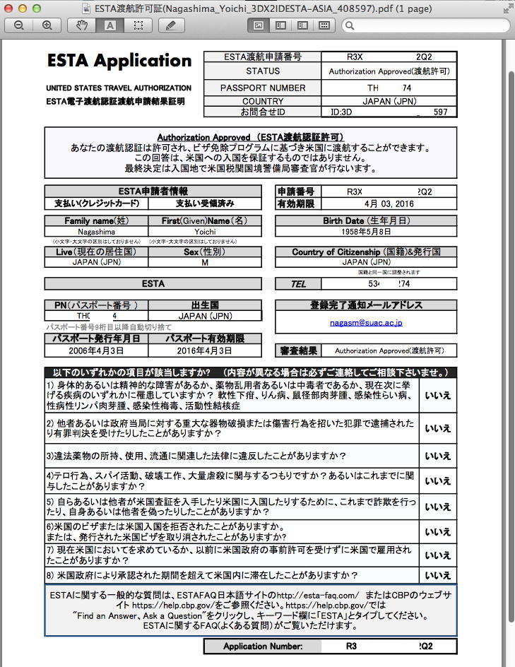 そして午前には、Sketching2015への参加で米国に入国するためのESTAを、以下のように申請した。 世界中でもっとも攻撃対象になっている国・アメリカでは、入国審査の際に指紋と顔写真を撮られるだけでなく、入国前にこんな申請をしないといけないのだが、ちょうど前回の渡米の後で有効期限が切れていて、今回、久しぶりに申請する予定にしていたのだ。 こんなのを出さないといけないし、セキュリティチェックまで通過しているのに搭乗ゲートで外国人だけパスポートを見せて靴まで脱がされる国、それがアメリカなのである。