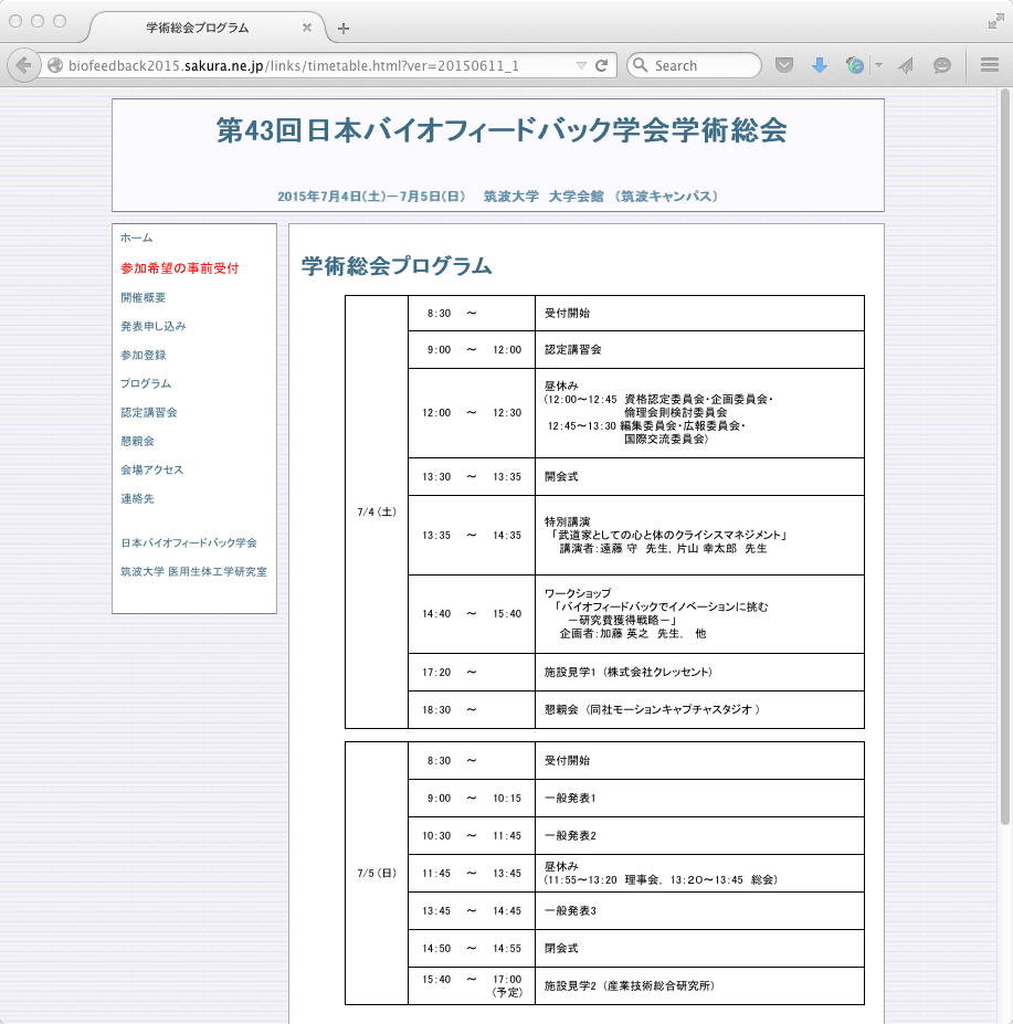 7月の第1週には4泊5日でSUACから筑波大に遠征する。 7/2(木)・7/3(金)の2日間、筑波大学の内山先生のところでワークショップ(特別講義)を行い、ここにはSUACからM2の杉浦さんも同行参加する。 そして7/4(土)・7/5(日)2日間、バイオフィードバック学会総会に参加し、僕は発表参加、そして杉浦さんに加えて藤石さんも合流して聴講参加する。 そのプログラムが、 第43回日本バイオフィードバック学会学術総会 のページが更新されて、上のように掲載されていた。 1日目の夕方の、東京に行っての企業見学と懇親会だけは、僕は筑波に残るので学生2人だけで、その後に筑波の宿に帰ってくる。 夜間の東名高速道路は避けて、浜松に戻るのは7/6(月)である。 そしてこの大会の 一般発表プログラム も公開されていた。 僕は2日目午後のセッションのトップパッターだが、この品揃えを眺めると、なかなかに興味深いタイトルが並んでいて、これは楽しみである(^_^)。