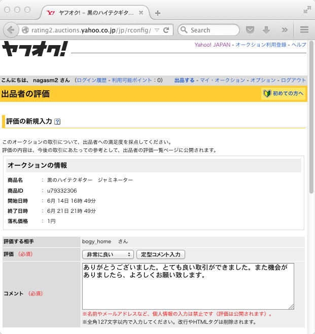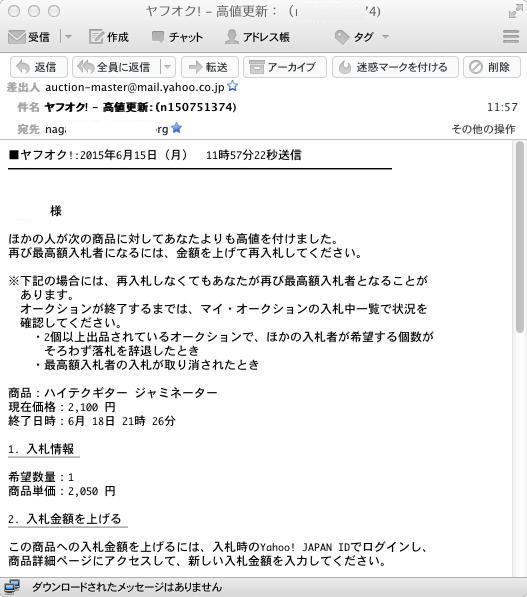 そして書類書きを続けている昼休みには、上のようなメイルが届いた。 ヤフオクで最初に入札したジャミネータの最初のやつが、たぶんぼちぼち締め切り期限らしく、このパターンはおそらく出品者が別アカウントで競り上げて、こちらがさらに入札限度額を上げるのを誘う、という技だろう。 この手法はよく知っているので、暖かく無視することにした。 別に落札できなくても、既に手元に10本以上を確保していて、痛くも痒くもないのである。 ・・・結局、両方の書類を書き上げたのはちょうど13時、昼休みが終ってしまった。 あとは学部長と学科長のハンコ(海外出張)、そして同行学生のサイン捺印(公用車同乗)、という手間だけである。
