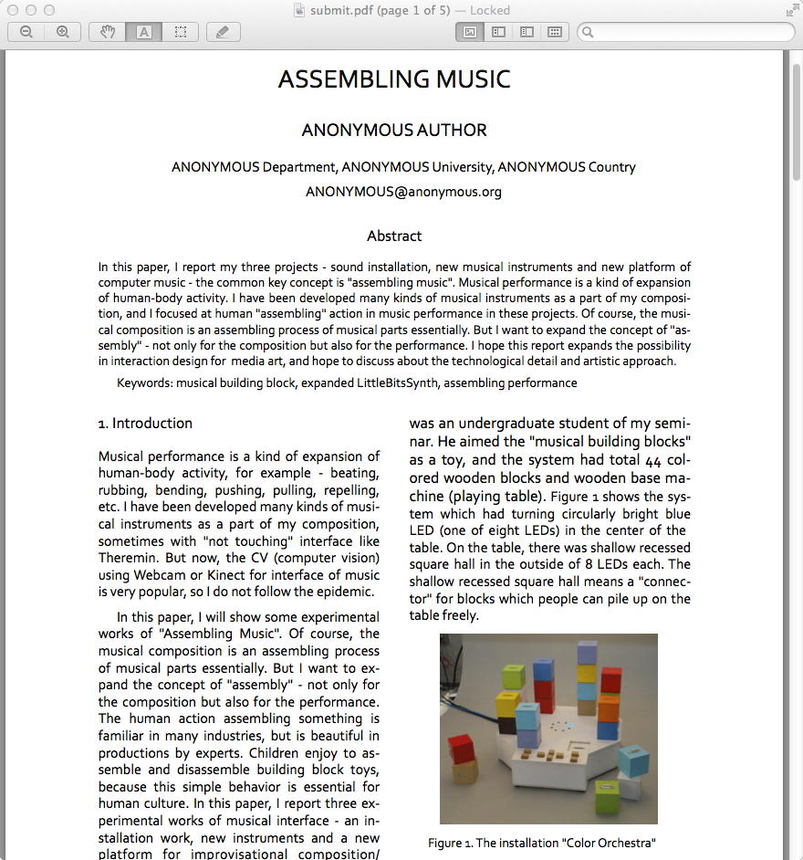 情報処理学会 第108回音楽情報科学研究発表会の発表申込を受領いたしました。 3.講演題名:新楽器へのアプローチ 【著者リスト】 1.姓名/所属:長嶋 洋一:Yoichi Nagashima/静岡文化芸術大学:Shizuoka University of Art and Culture 【和文タイトル】 新楽器へのアプローチ 【英文タイトル】 Toward a new Musical Instrument 【和文アブストラクト】 この領域で多くのアプローチを重ねてきた立場から、音情研2015夏シンポのオーガナイズドセッションの チュートリアルとして、新しくこの分野に挑戦したい方々に,ノウハウや注意点をまとめて伝授することで、 日本発のユニークな新楽器の登場に寄与してみたい。具体的なメニューとして、(1)楽器の定義とは、 (2)新楽器の歴史を技術的な潮流として解説、(3)新楽器と歌声合成の隆盛の原因は音生成技術の 飽和(停滞)、(4)なぜ新楽器の開発が必要で伝統楽器では不十分なのか、(5)新しい音楽と新楽器の 関係(ニーズとシーズ)、(6)新楽器に求められているもの(機能・仕様)、(7)3つの陥穽 - マッピング/ レイテンシ/ユーザビリティ、という7つの項目から考察してみたい。 【事務連絡】 別途に提案しているオーガナイズドセッションの中で、チュートリアルとして発表するものです。オーガナイズド セッションが無くなった場合にはチュートリアル講演となります。分量(予稿と講演時間)は通常の発表の 2倍〜3倍程度を見込んでいます 【研究会への連絡事項】 動画中継・アーカイブを希望しないまぁ、これらの中身については、原稿締め切りがSketching2015から帰国する8月4日なので、出発前には片付けてしまうことになるので、自分で自分の首を締めているのだが、せっかく新楽器が出来たので、自分の尻に火を付けているのだ。 ・・・そして午前中かかって、なんとか原稿をやっつけて、EC2015のEasyChairにupload してしまった。 まだ秘密だが これ である。 新たに音情研の夏シンポに申し込んだので気を抜けないものの、これで明日は安心して歌えるというものだ。