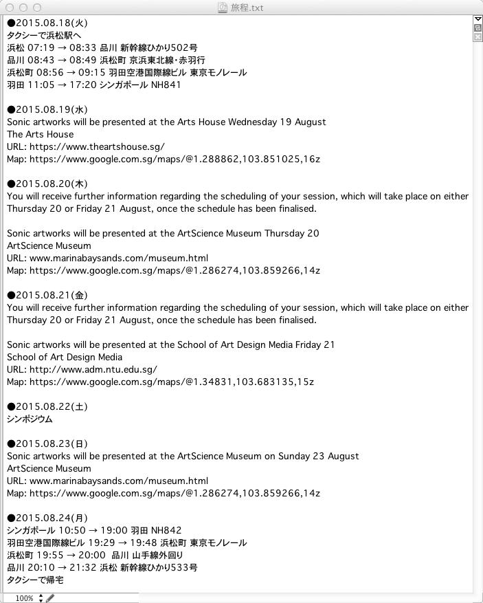これをキチンと読んでいかないと・・・と思っていると、さっき出したメイルにもう速攻で返信が来た。 「Thanks for your confirmation. We'll send more information about the events and registration as soon as possible.」とのことで、大会委員長のPerMagnus Lindborg氏(composer, sound artist, researcher - permagnus.org, assistant professor ADM/NTU)とは、快適にメイルが繋がっているようである。 カメラレディの締め切り(8月1日、ただしSketching2015に行っている最中なので自分としては7月27日)はまだだいぶ先なので、まずはいつものように旅程案を検討してみた。 普段だとANAでフライトチケットを購入して、現地のホテルを検索して予約して・・・と進めるが、今回は一応、同行希望の学生がいる可能性を留保して、実際の予約は週末あたりである。