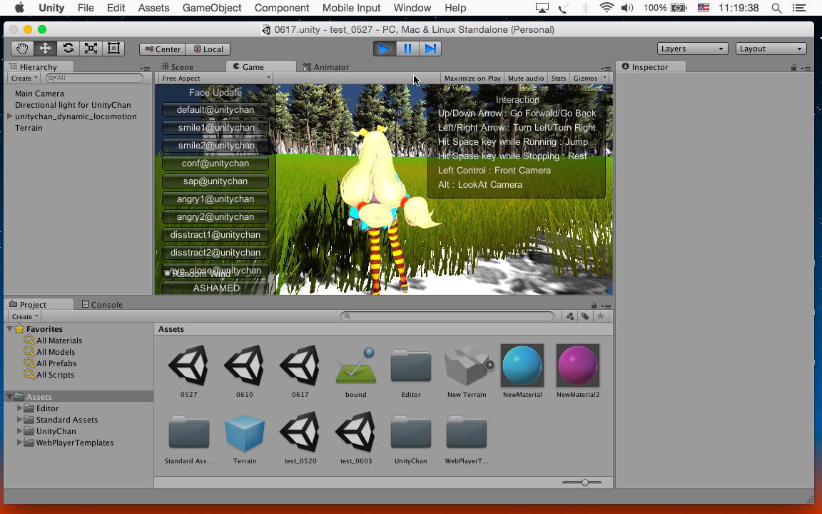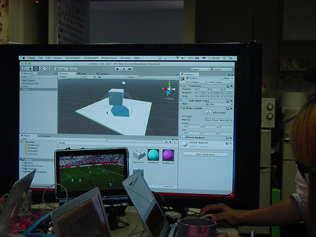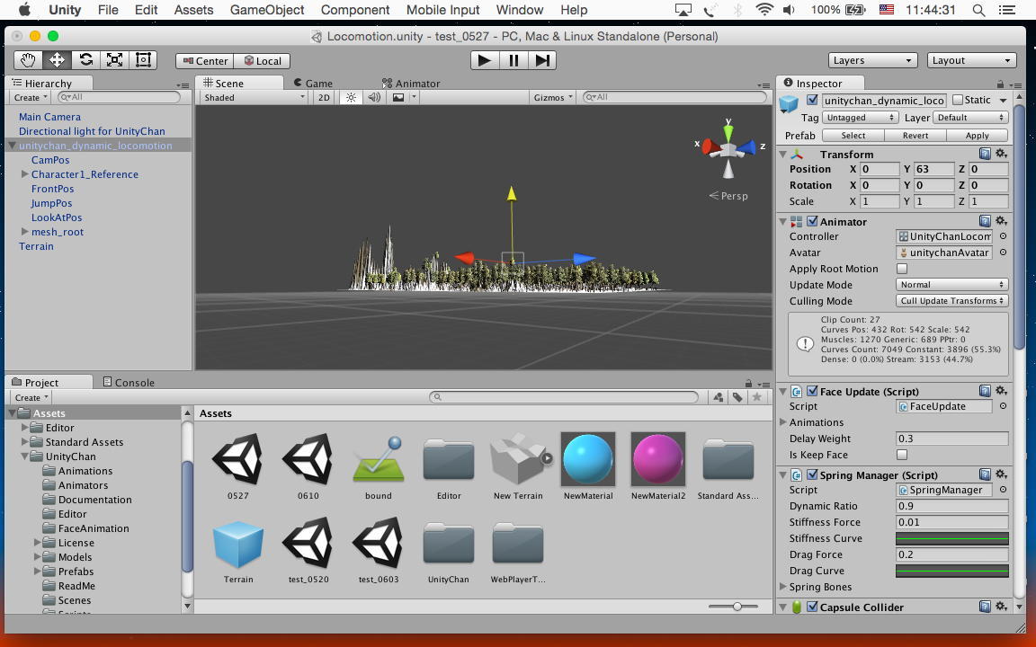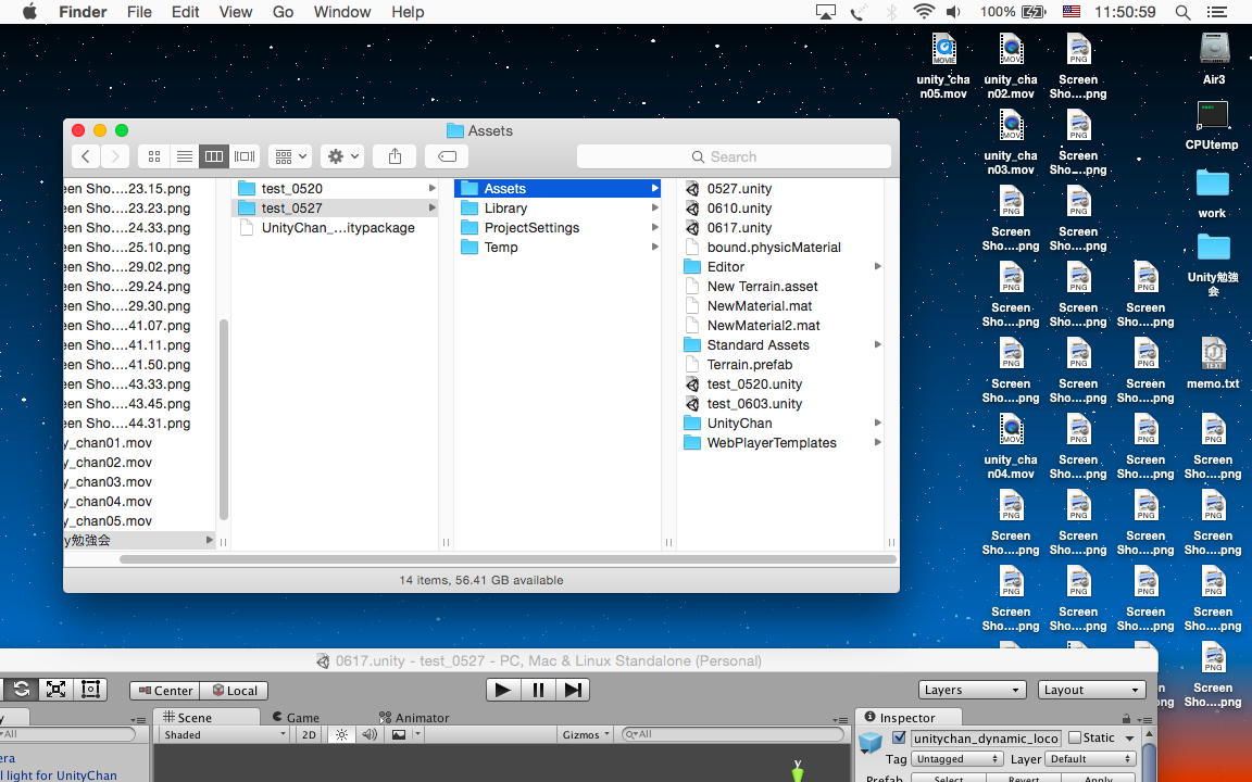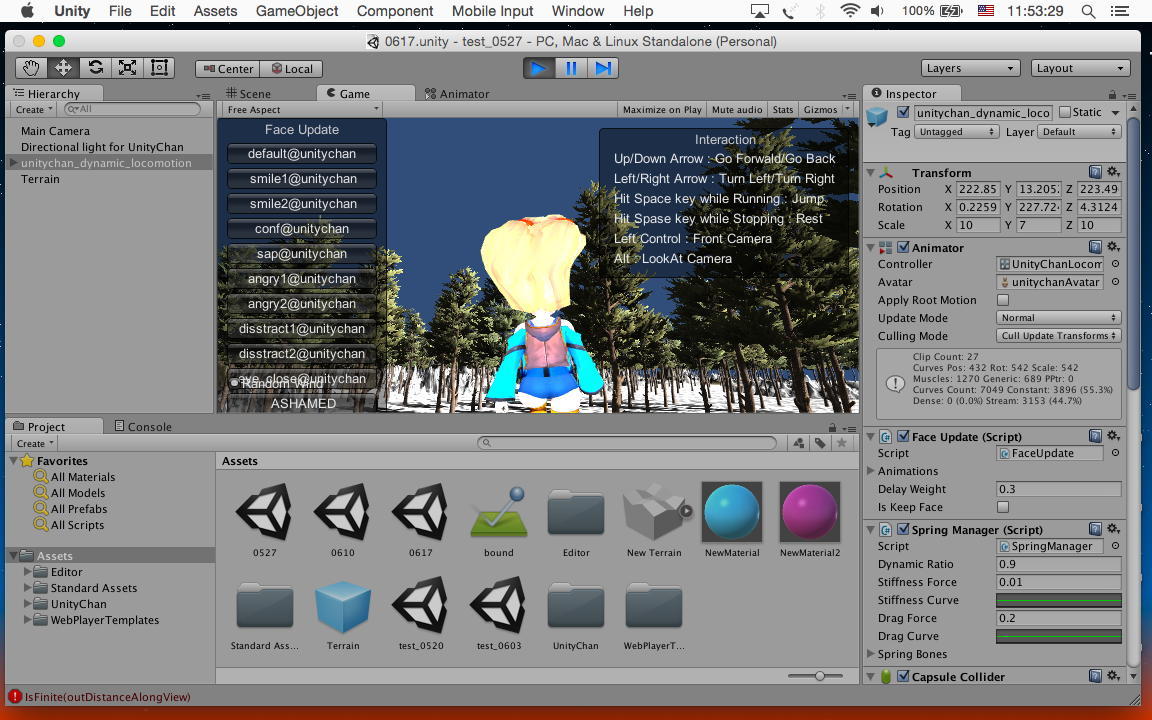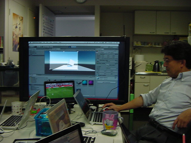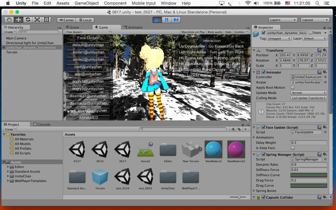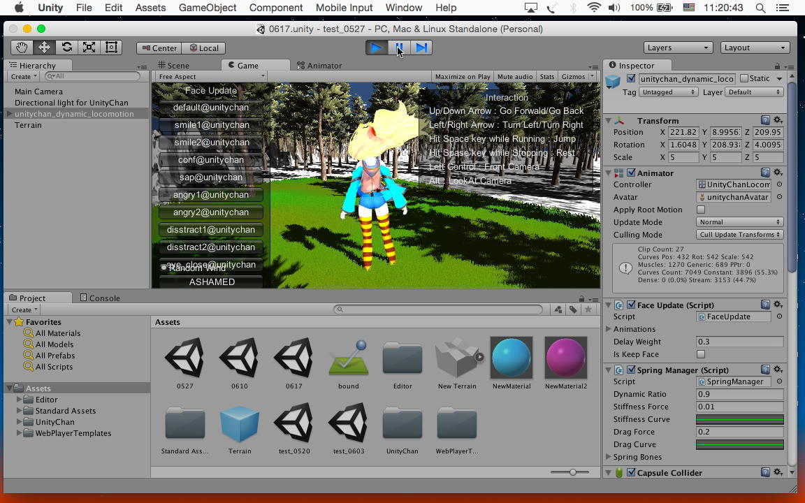 そして1限の「音楽情報科学」では、チーム「うみうし」のために、新たに加速度センサを製作する、と約束した。 続いて2限はゼミである。 上のように、またまた藤石さんを講師としてUnity講座の続きがあり、今日はこれまでに作ったシーンの中で「Unityちゃん」が跳んだり走ったりする、というのをやった。 Unityちゃんの動きの可愛い様子はスクリーン動画の方がよく判るが、 これ と これ と これ と これ と これ である。