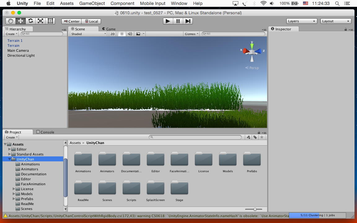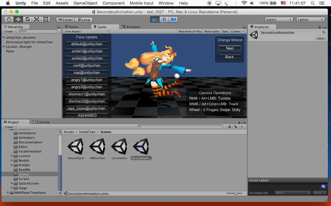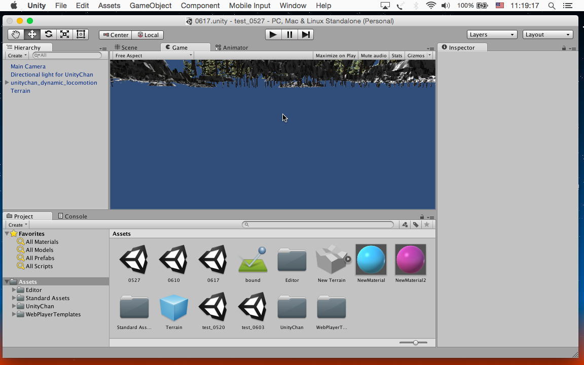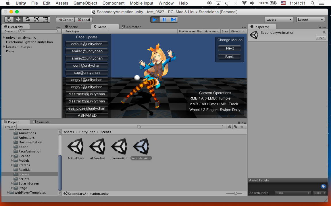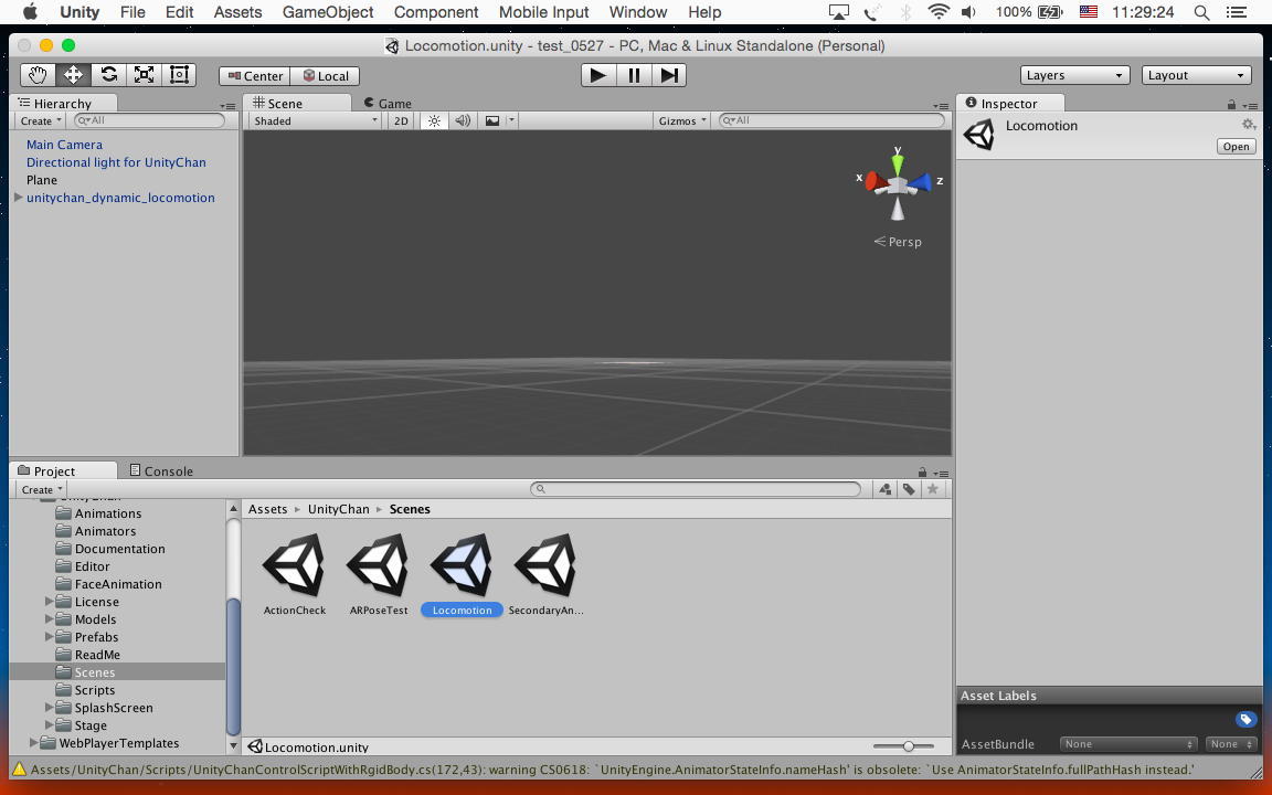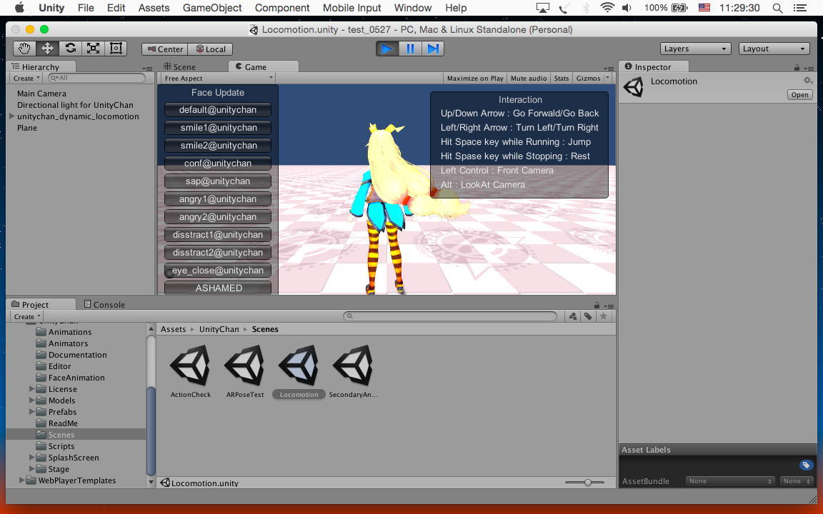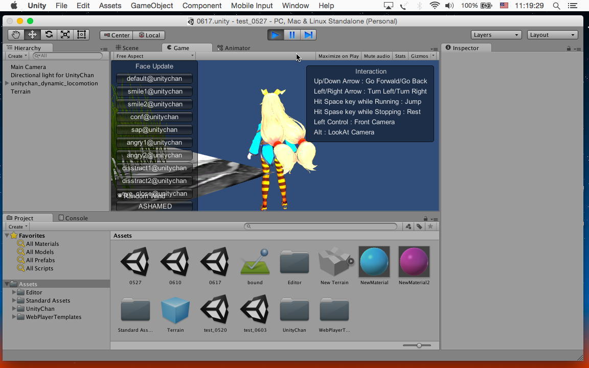 そして1限の「音楽情報科学」では、チーム「うみうし」のために、新たに加速度センサを製作する、と約束した。 続いて2限はゼミである。 上のように、またまた藤石さんを講師としてUnity講座の続きがあり、今日はこれまでに作ったシーンの中で「Unityちゃん」が跳んだり走ったりする、というのをやった。 Unityちゃんの動きの可愛い様子はスクリーン動画の方がよく判るが、 これ と これ と これ と これ と これ である。