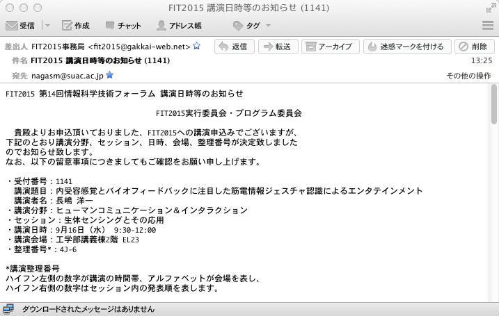 そして午後になって、9月に愛媛大学で開催される FIT2015 から、上のように講演日時の連絡が届いた。 これは、最終原稿の提出期限が近付いている事とリンクしてして、なんと来週6/25だった。 来週はこの6/25から愛知・名古屋方面に2泊の出張なので、ここで原稿提出をやっつけてしまう必要がある。 そこで急遽、チーム「うみうし」の加速度センサの製作は来週月曜の午前にやっつける事にして、今日の午後はこの原稿執筆に没頭、と決まった。 色々と前倒しにやっつけているつもりだが、なかなかに「あらえっさっさ」である。
