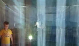 このあと、「Debugging shaders」・「Creating video effects with fragment shaders」・「Passing a float parameter to a shader」と解説が続いて、以下の「02-ShaderHorizDistortion」では、 このように 3次元CGのShaderで、リアルタイムにうねうねと歪ませている。