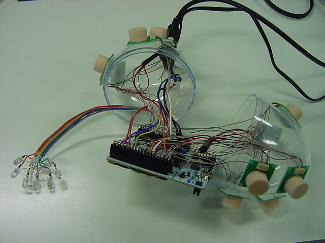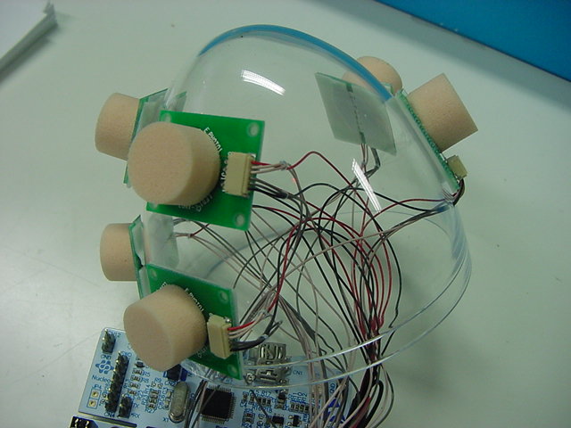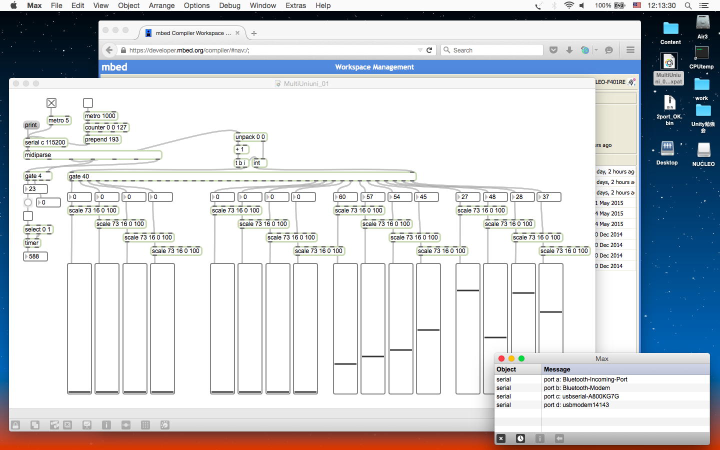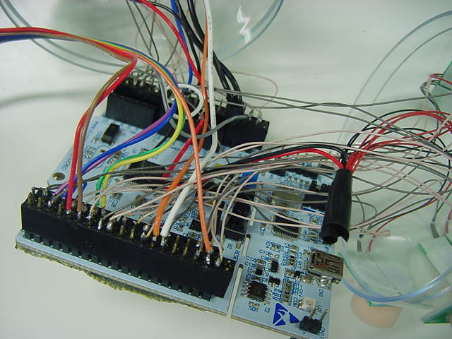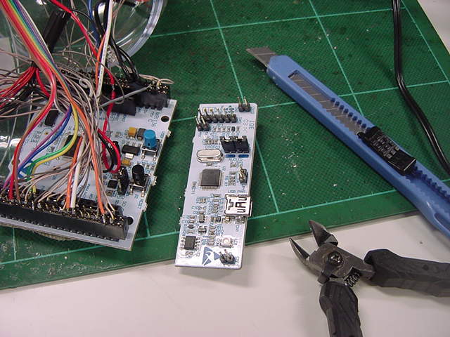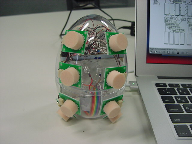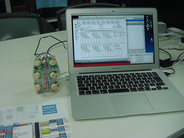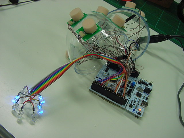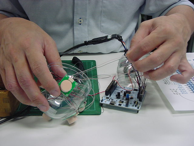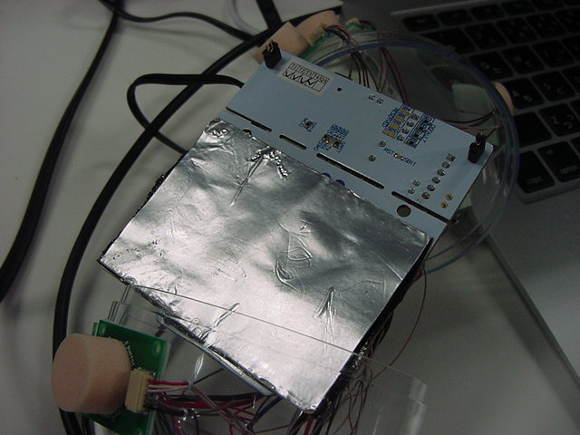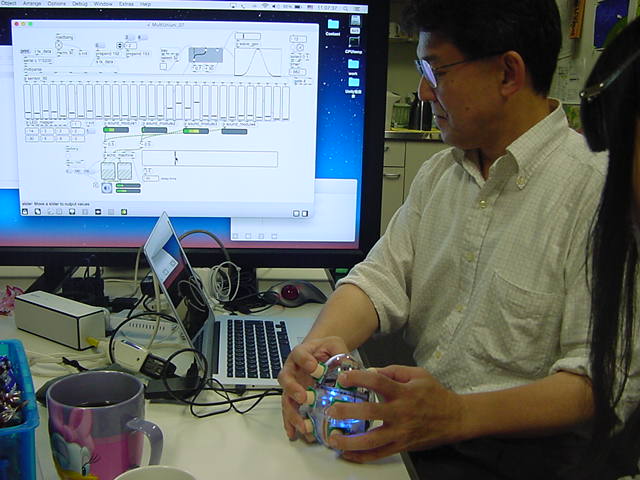 ・・・そしてここから以下のように、午前・昼休み・3限を費やして、4限の「サウンドデザイン」を前にした14:15に、遂に「多重うにうにセンサ」(←これでは海外に持っていけないのでネーミングはこれから考えよう)を完成してしまった(^o^)。 mbedのUSBマウントコントローラ部分をカッターで切ってケースに収めたので、もう修正はナシ、あとはホストのMaxの方で尻拭いするしかない。