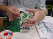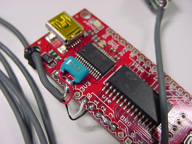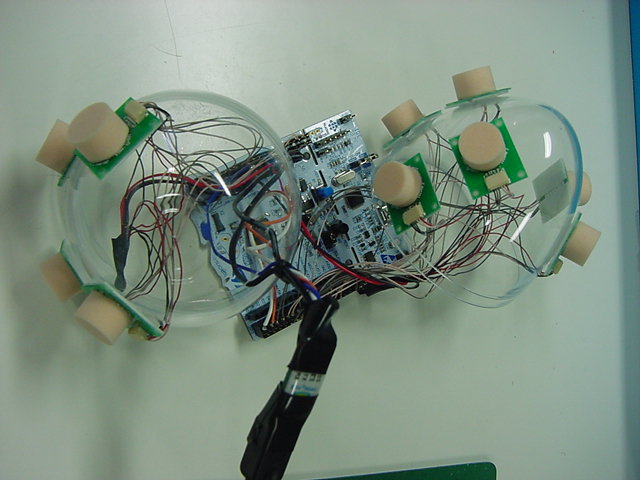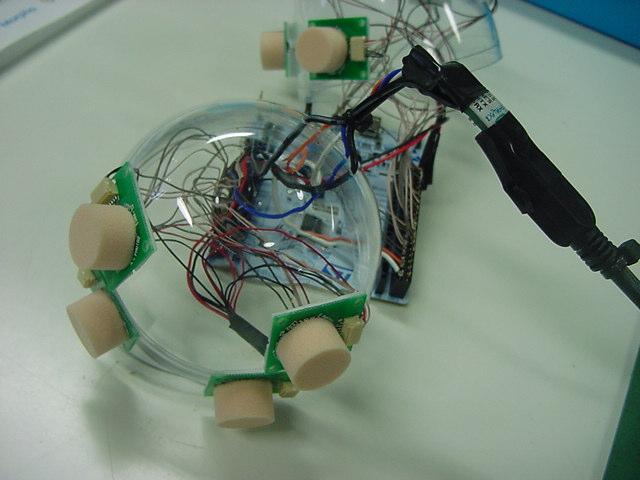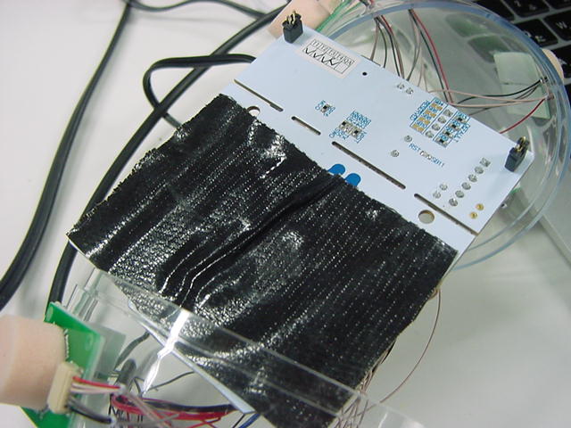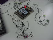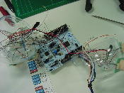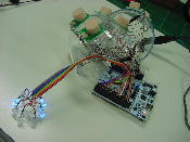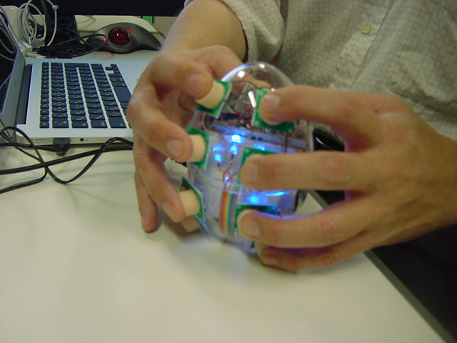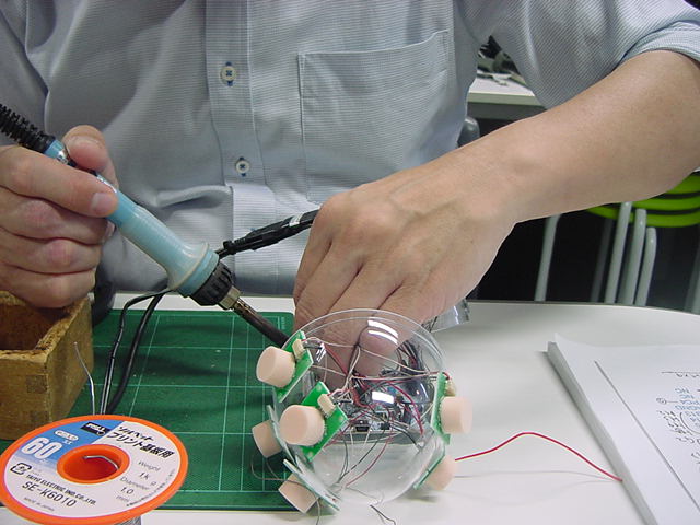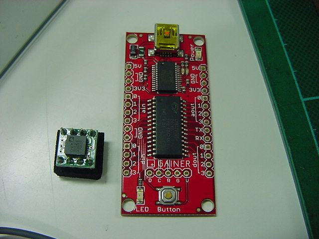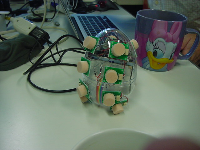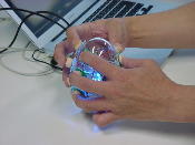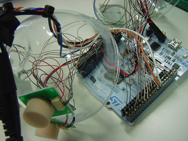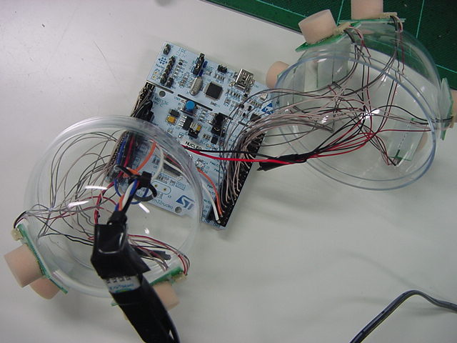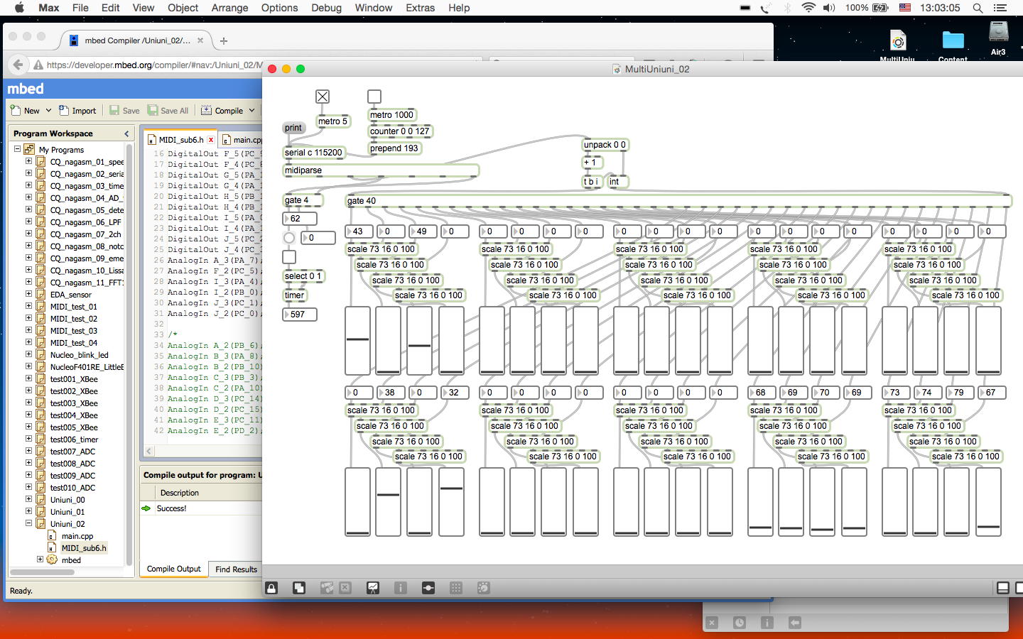 ・・・そしてここから以下のように、午前・昼休み・3限を費やして、4限の「サウンドデザイン」を前にした14:15に、遂に「多重うにうにセンサ」(←これでは海外に持っていけないのでネーミングはこれから考えよう)を完成してしまった(^o^)。 mbedのUSBマウントコントローラ部分をカッターで切ってケースに収めたので、もう修正はナシ、あとはホストのMaxの方で尻拭いするしかない。