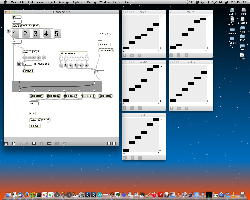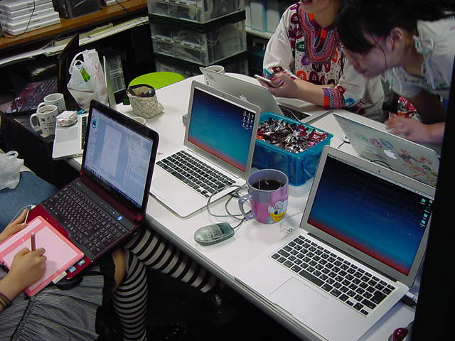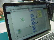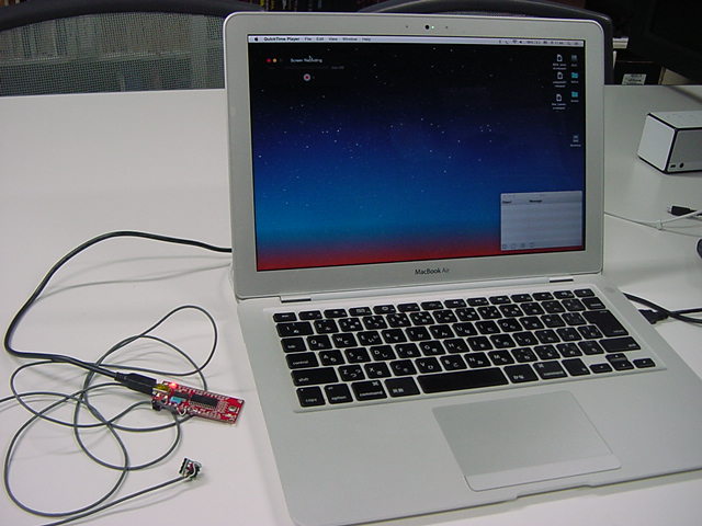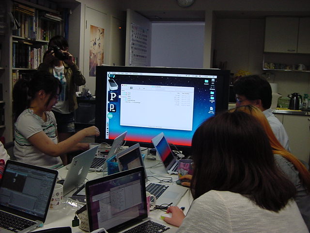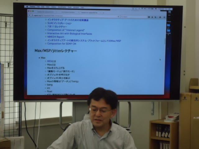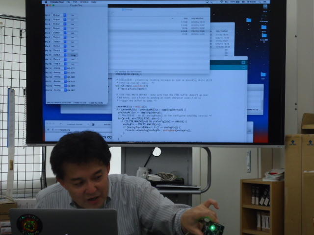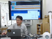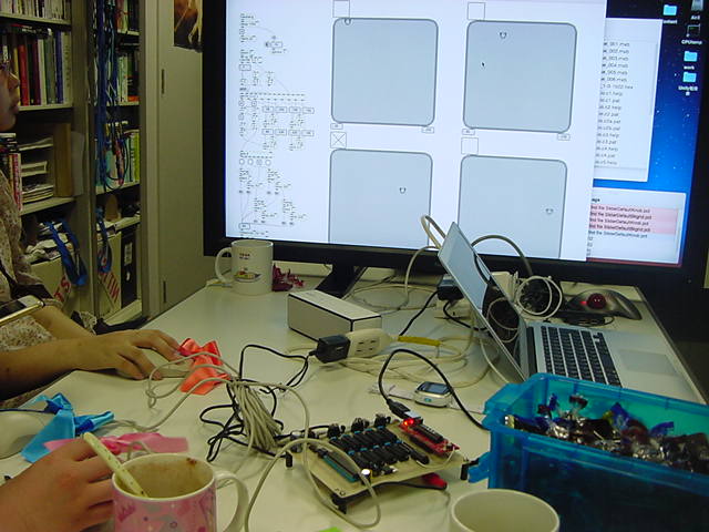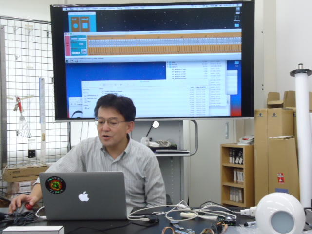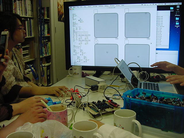 そして1限の「音楽情報科学」で各グループの支援を行った。 さらに2限のゼミでは以下のように、明日からの筑波大ワークショップのデモのリハを兼ねた動作チェックと解説を行った。 いずれもだいぶ昔のことで、やり方とか段取りとかを忘れていたり、新しいMacBookAirにはまだRolandのMIDIインターフェースUM-2のドライバをインストールしていなかったと気付いて慌ててダウンロード/インストールしたり・・・と色々なデバッグを行うことができた。