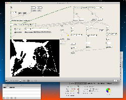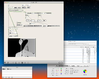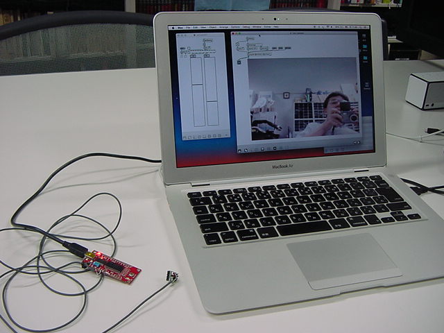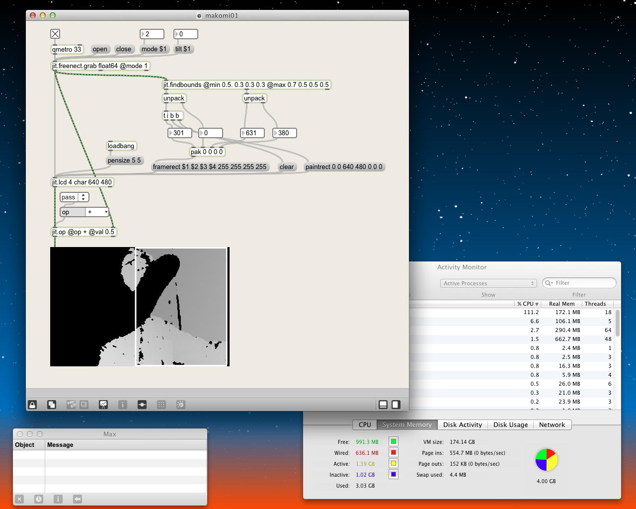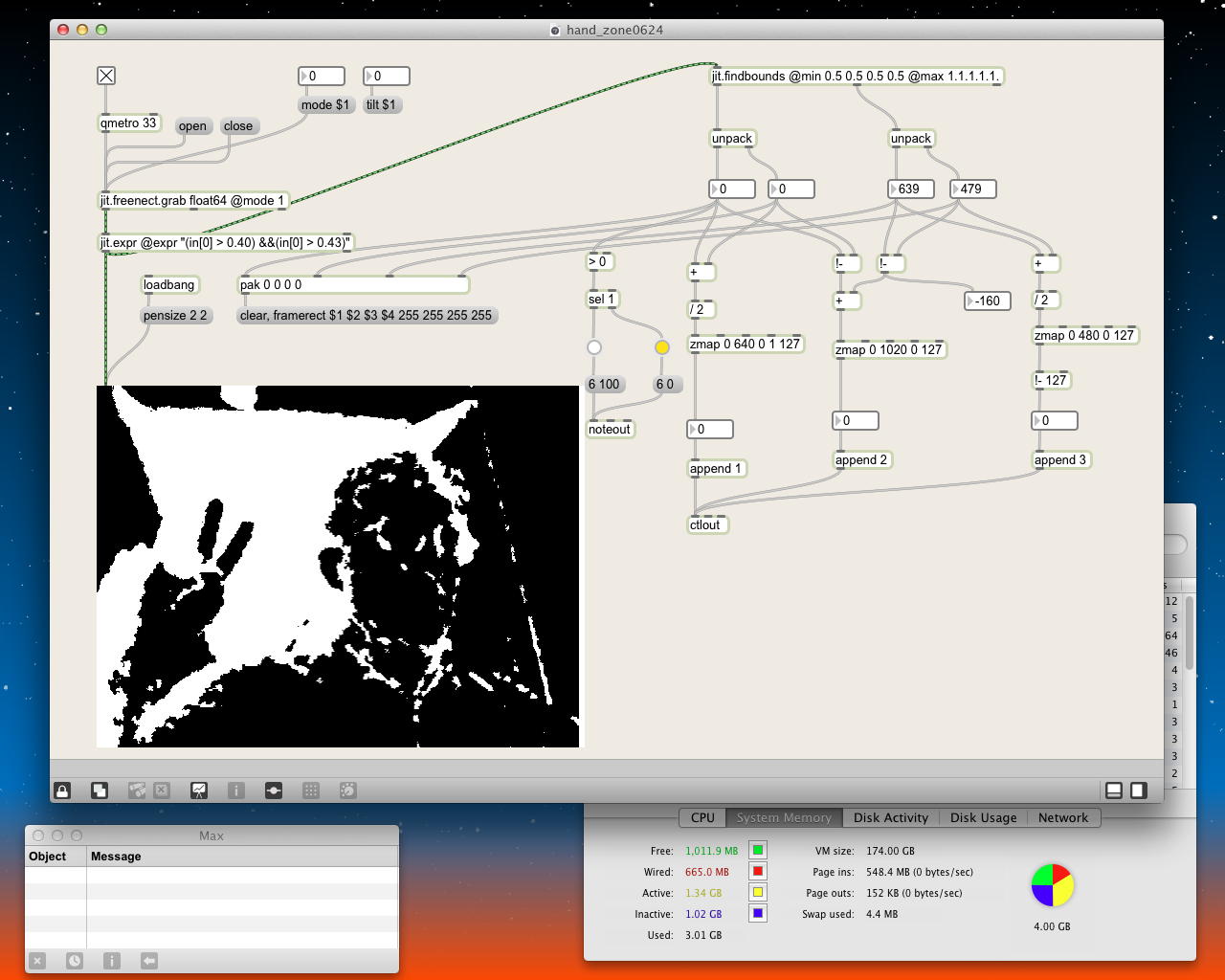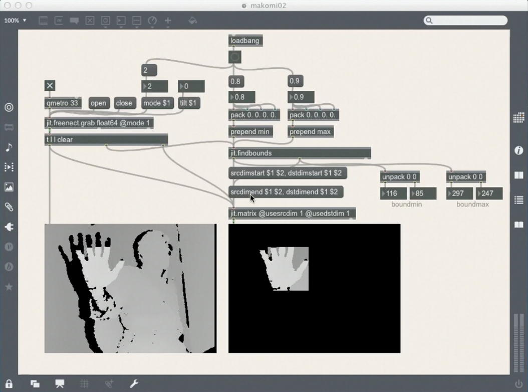 そしてここから、「音楽情報科学」で「まこみ班」からもらっていた宿題をやっつけた。 テーマとして「ある一定の距離深度に物体が入ったら音が出て深度によって音の高さが変わるパッチを作りたい」とのことで、Kinectを使ったfreenectの応用である。 とりあえず上のように、 こんなパッチ を作ってみた。 YouTubeに上げてみたが こんな感じ で、設定した範囲の深度のブロック位置をトラッキングしている。 テストとしてMax7でやってみたのも、筑波大ワークショップでちょっと慣れた故のプチ進歩である。(^_^;)