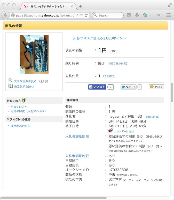 研究室に着くと、届いていたメイルで有効なのは2本だけだった。 1本はヤフオクで、僕は常にジャミネータの中古品が出るとメイルが来るようにしていて、3000円とかふっかけたのはシカトするが、安い不良品は必ず入札することにしている。 1本1000円台で、スタイリッシュな改造用スイッチ付き筐体が入手できるなら、安いものなのだ。 どういうわけか、先週の京都行きあたりからたまたまジャミネータの中古品が出ていて既に2本に入札している(越えられたけどどうする?のメイルが来ないのであと数日で落札予定)が、また新しいのが「1円」から出てきたので、とりあえず入札しておいた。