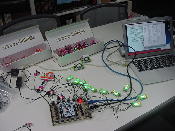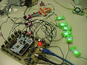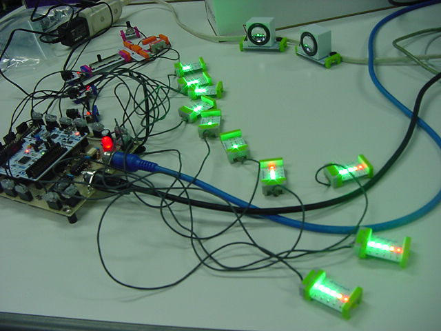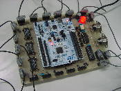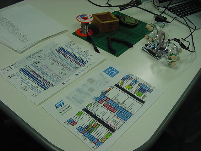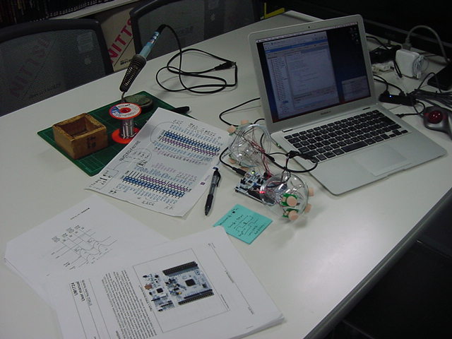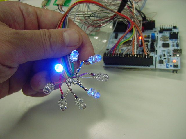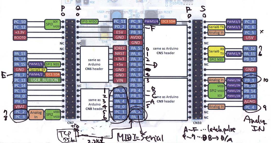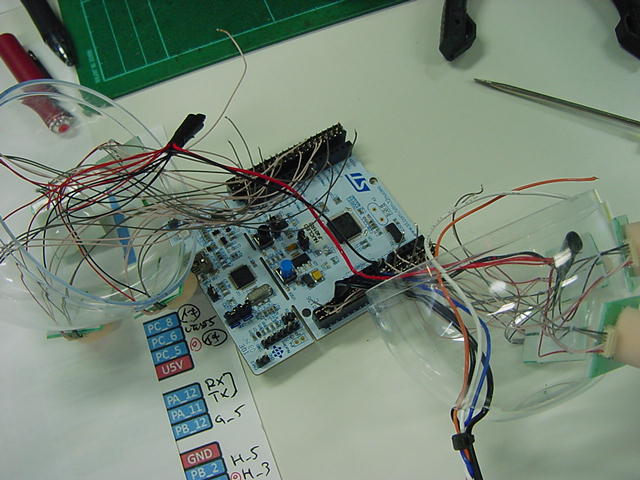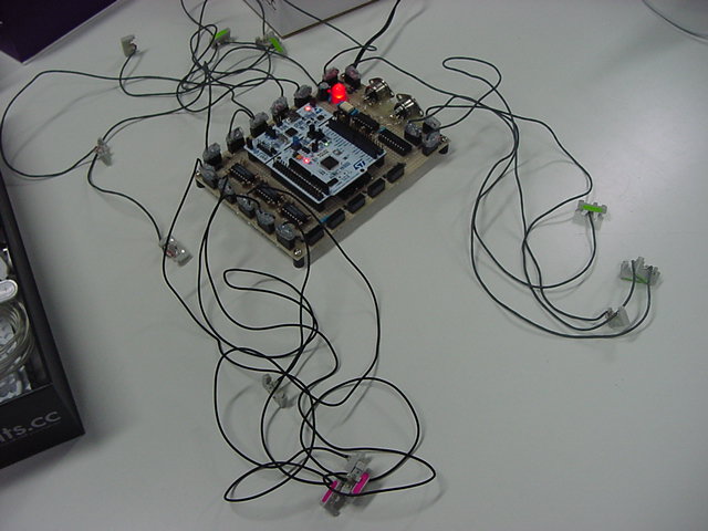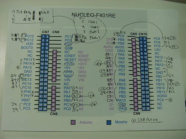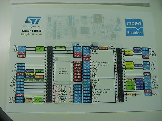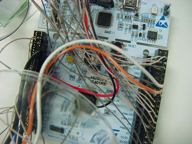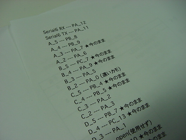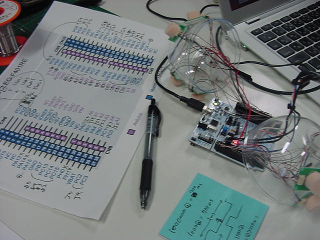 そして4限「サウンドデザイン」、5限に院生の杉浦さんと打合せをして、充実の一日が終った。 筑波大の内山先生からは、参加者が全部で12人になった、との連絡も届いた。 まだセンサのチューニングとサウンド生成の試作が残っているので、続きは明日である。unsigned char rxFIFO[256], txFIFO[256], adc_old[40]; unsigned char rx_top, rx_end, tx_top, tx_end, status, keyno, dcb; int midi_message, adc_no, PWM_channel, PWM_speed, PWM_phase; int PWM_data[8], PWM_counter[8]; RawSerial MIDI(PA_11, PA_12); DigitalOut A_5(PB_8); DigitalOut A_4(PB_9); DigitalOut B_5(PC_7); DigitalOut B_4(PA_9); DigitalOut C_5(PB_4); DigitalOut C_4(PB_5); DigitalOut D_5(PB_7); DigitalOut D_4(PC_13); DigitalOut E_5(PC_10); DigitalOut E_4(PC_12); DigitalOut F_5(PC_9); DigitalOut F_4(PC_8); DigitalOut G_5(PB_12); DigitalOut G_4(PB_6); DigitalOut H_5(PB_2); DigitalOut H_4(PB_15); DigitalOut I_5(PA_15); DigitalOut I_4(PC_14); DigitalOut J_5(PC_15); DigitalOut J_4(PC_11); AnalogIn A_3(PA_7); AnalogIn A_2(PA_6); AnalogIn B_3(PA_5); AnalogIn B_2(PA_0); AnalogIn C_3(PA_2); AnalogIn C_2(PA_3); AnalogIn D_3(PA_1); AnalogIn E_3(PB_0); AnalogIn F_3(PC_0); AnalogIn F_2(PC_5); AnalogIn G_3(PC_2); AnalogIn G_2(PC_3); AnalogIn H_3(PB_1); AnalogIn H_2(PC_4); AnalogIn I_3(PA_4); AnalogIn J_3(PC_1); DigitalOut blue_0(PD_2); DigitalOut blue_1(PA_8); DigitalOut blue_2(PB_10); DigitalOut blue_3(PB_3); DigitalOut blue_4(PA_10); DigitalOut blue_5(PC_6); DigitalOut blue_6(PB_14); DigitalOut blue_7(PB_13); void blue_set(int num, int value){ switch(num){ case(0): blue_0 = value; break; case(1): blue_1 = value; break; case(2): blue_2 = value; break; case(3): blue_3 = value; break; case(4): blue_4 = value; break; case(5): blue_5 = value; break; case(6): blue_6 = value; break; case(7): blue_7 = value; break; } return; } void LED_set(int num, int value){ switch(num){ case(0): A_5 = value; break; case(1): A_4 = value; break; case(2): B_5 = value; break; case(3): B_4 = value; break; case(4): C_5 = value; break; case(5): C_4 = value; break; case(6): D_5 = value; break; case(7): D_4 = value; break; case(8): E_5 = value; break; case(9): E_4 = value; break; case(10): F_5 = value; break; case(11): F_4 = value; break; case(12): G_5 = value; break; case(13): G_4 = value; break; case(14): H_5 = value; break; case(15): H_4 = value; break; case(16): I_5 = value; break; case(17): I_4 = value; break; case(18): J_5 = value; break; case(19): J_4 = value; break; } return; } unsigned char ADC_get(int num){ unsigned short data = 0; switch(num){ case(0): data = A_3.read_u16(); break; case(1): data = A_2.read_u16(); break; case(2): data = B_3.read_u16(); break; case(3): data = B_2.read_u16(); break; case(4): data = C_3.read_u16(); break; case(5): data = C_2.read_u16(); break; case(6): data = D_3.read_u16(); break; case(8): data = E_3.read_u16(); break; case(10): data = F_3.read_u16(); break; case(11): data = F_2.read_u16(); break; case(12): data = G_3.read_u16(); break; case(13): data = G_2.read_u16(); break; case(14): data = H_3.read_u16(); break; case(15): data = H_2.read_u16(); break; case(16): data = I_3.read_u16(); break; case(18): data = J_3.read_u16(); break; } return(data>>9); } int rx_fifo_check(void){ unsigned char data; if(rx_top != rx_end){ data = rxFIFO[rx_end]; ++rx_end &= 255; if (data > 127){ status = data; dcb = 0; return(0); } else if(status > 0xEF){ return(0); } else if( (status > 0xBF) && (status < 0xE0) ){ midi_message = (status<<16) + (data<<8); dcb = 0; return(1); } else if(dcb==0){ keyno = data; dcb++; return(0); } else{ midi_message = (status<<16) + (keyno<<8) + data; dcb = 0; return(1); } } return(0); } void rx_fifoset(void){ rxFIFO[rx_top] = MIDI.getc(); ++rx_top &= 255; return; } void tx_fifo_check(void){ if(MIDI.writeable() == 1){ if(tx_top != tx_end){ MIDI.putc(txFIFO[tx_end]); ++tx_end &= 255; } } return; } void tx_fifoset(unsigned char data){ txFIFO[tx_top] = data; ++tx_top &= 255; return; }