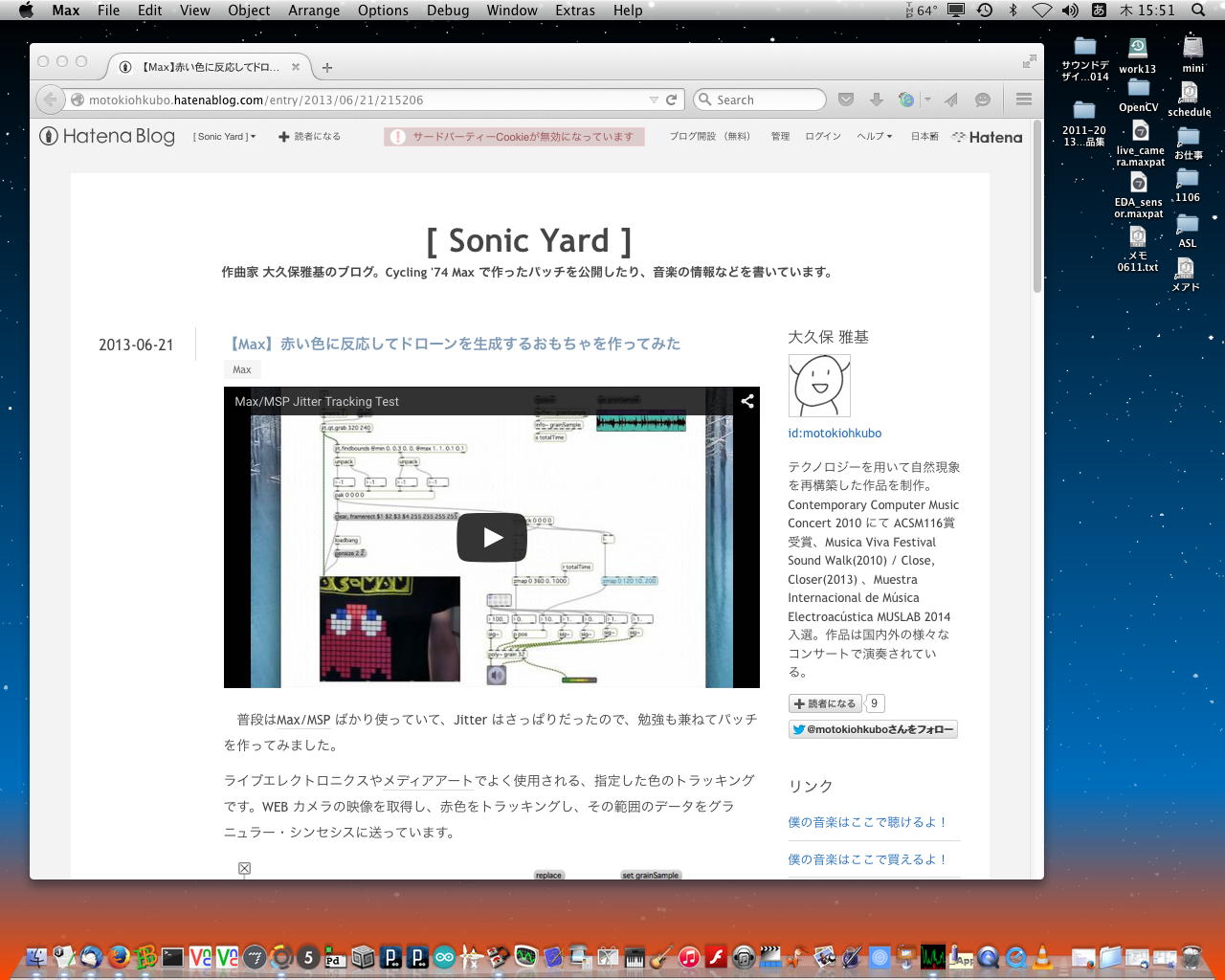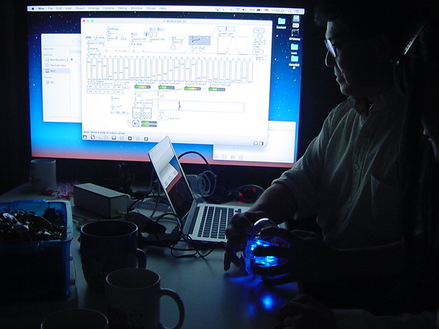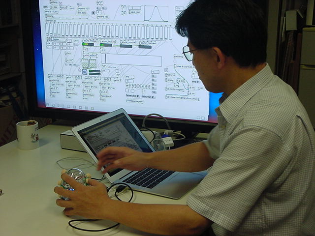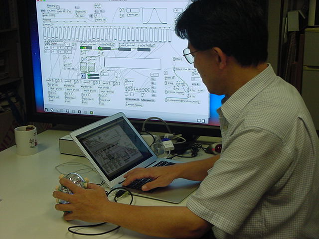 そして昨日の午後には焼津に行き、 またまた焼津・山村知世 個展2015 に行って、個展を見て、山村さんと焼津の御馳走を美味しくいただいて飲んで、焼津に泊まって、今日、浜松に朝帰りしてきた。 午前には「お触りセンサ」のデモのためにjitterサンプルから厳選したグラフィックと合体させて、なんとかそれっぽいものが出来た。 これは音情研・夏シンポでの発表の際にアドリブでデモるまでは、YouTubeに上げずに秘密にしておくことにしよう。 さらに頑張って、午後じゅうかかって、なんと「お触り楽器」の予稿をゼロから全5ページ、一気に完成させてしまった(^_^)。 今晩、プリントアウトを持ち帰ってミスをチェックしたら、もう明日には学会に送ってしまおう。