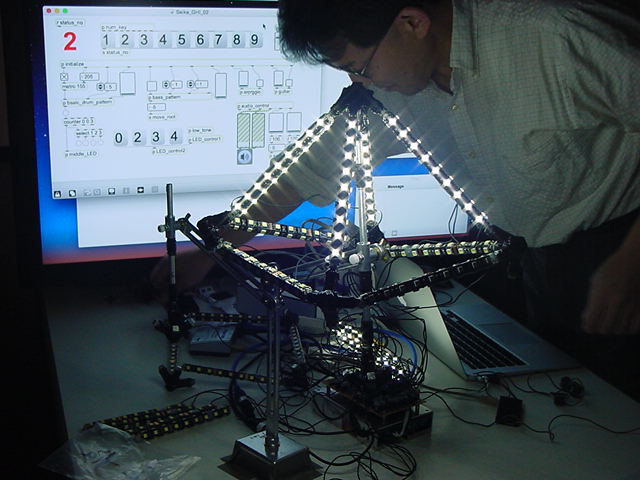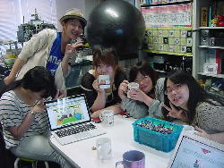 そして、この日記の「2015年7月2日(木)」のところに写真がある、東名高速のパーキングエリアのコーヒー自販機(ドリップしている様子をライブカメラで見せる)の動画版を帰途に撮ったのが この動画 である。次は、 筑波大ワークショップ の2日目、 2015年7月3日(金) の最後に、3グループそれぞれが成果をプレゼンした様子の動画である。 特筆すべきポイントは、「グループ2」の作品で、4人のパフォーマーがそれぞれアルミ箔を両面テープで貼り付けた軍手をはめて、4人のうち、ある2人がハイタッチすると、それぞれの組み合わせに割り当てられた音階のサウンドが鳴る、というものである。