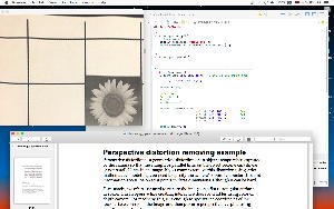 続く「Geometrical transformations of images」はサンプルが無くて、次に出てきたのは、上の「09-OpenCV」の「03-PerspectiveRemoving」だった。 Webカメラの動画を「undistort( radialDistX, radialDistY, tangentDistX, tangentDistY, focalX, focalY, centerX, centerY )」で歪ませる、というのをやってみたかったので、ここはちょっと寄り道して、サンプルに無いものをテストしてみたくなったが、残念ながらぼちぼち出発の準備ということで、今日はここまでである。