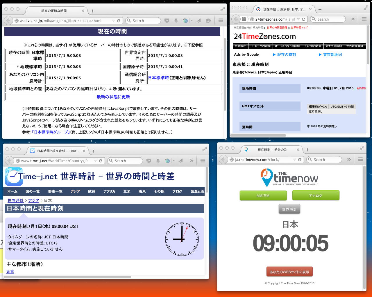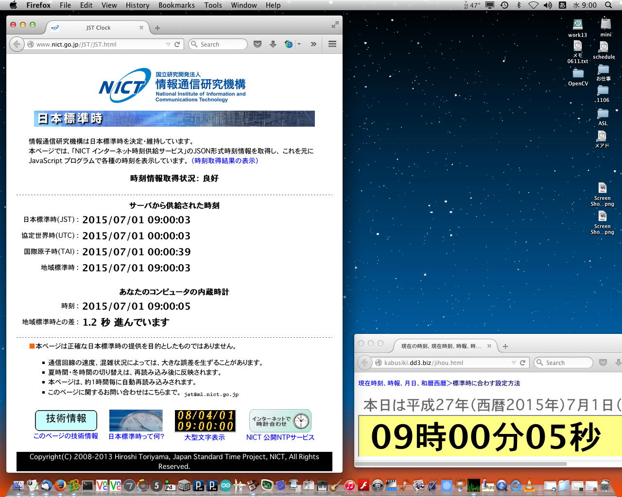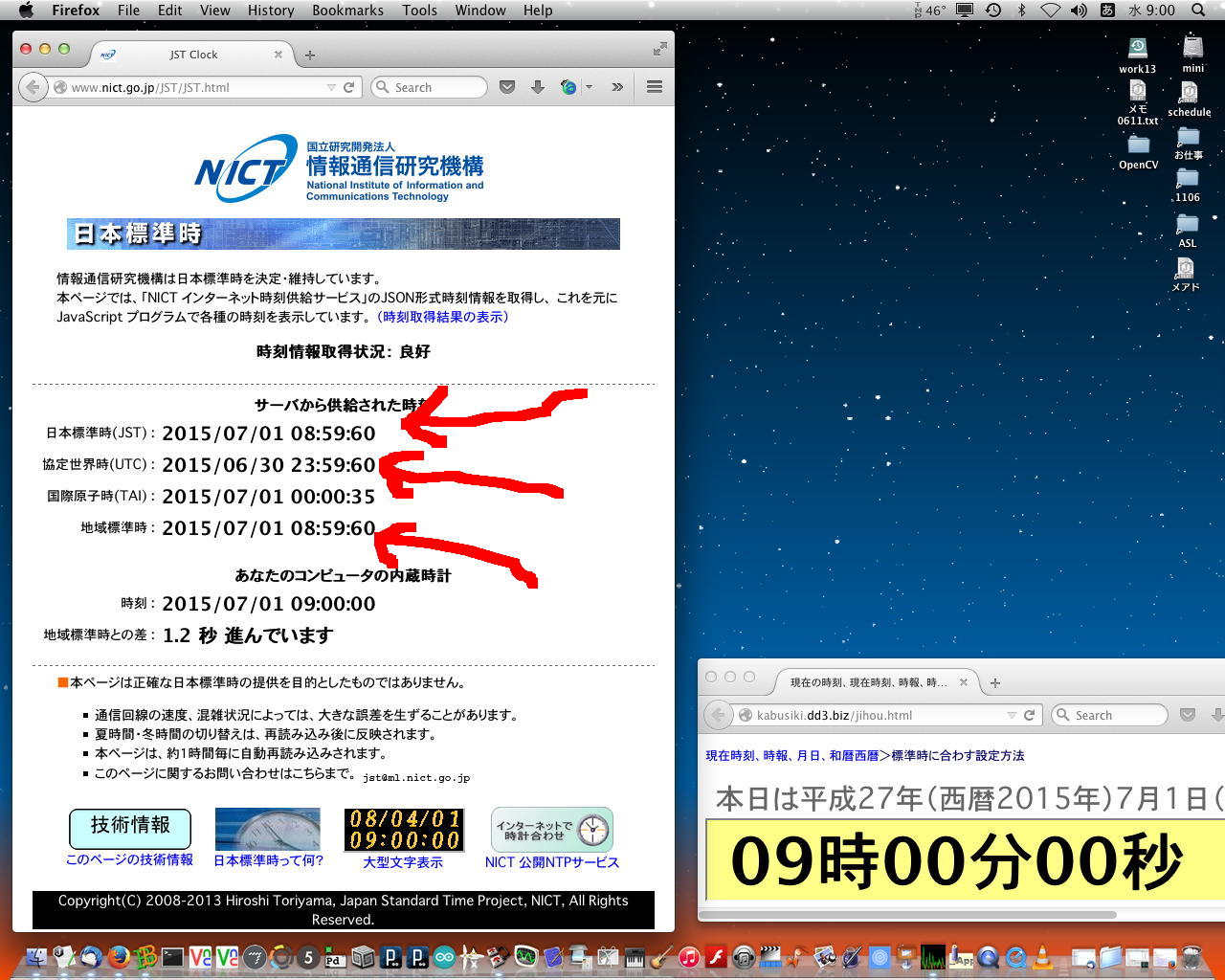 今日は朝8時50分あたりに「うるう秒」が09:00の直前に入る、という情報をネットニュースで知って、あわてて3分間ほどでセッティングして撮ったのが、以下の画面である。 これを撮ってからマルチメディア室の「音楽情報科学」の講義に向かったので、数分間、珍しく遅刻した。