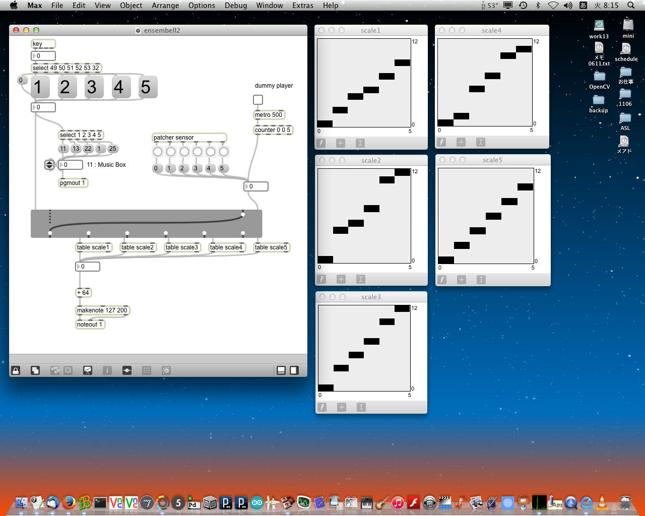 昨日はシンガポールから、early registrationした 参加者リスト が届いたり、Sketching2015の直前連絡が届いたりしたが、それに目もくれずに午前中も原稿執筆に没頭してカラオフの時間を削った。 そして今日、さらに午前中かかって、遂に完成した(^o^)。 まだ秘密だが これ である。 夏シンポのチュートリアルは、多数のICMCとかNIMEとかのコンサート風景動画がそのまま新楽器の紹介となるので、1時間あっても何ということもなく話せるだろう。 maxの18ページというボリュームでこんな形にまとめられて、大変だったが大きな収穫である。今週は、今日の4限の「サウンドデザイン」で最終課題の合評、水曜日には1限の「音楽情報科学」で最終課題の合評、さらに2限から21時あたりまでかかって、メディア造形総合演習IIの最終合評があり、その翌日の木曜日の午前には成田に向かってSketching2015である。 ちょうどこのHTMLも180kBになろうとしている区切りなので、ここで「Xcode日記」は終了することにした。 まだopenFrameworksは続いているが、続きは夏〜秋あたりに、Denisとのやりとりが再開したところかな。 この夏休みには、まったく別に1本、気合いの論文執筆の懸案もあり、日記シリーズどころではなくなるのだ。 Sketching2015、SI15、夏シンポ、FIT、EC2015、と夏休み期間中にこれから5本の出張シリーズがあるが、その模様は個別にフォトレポートとすることにしよう。