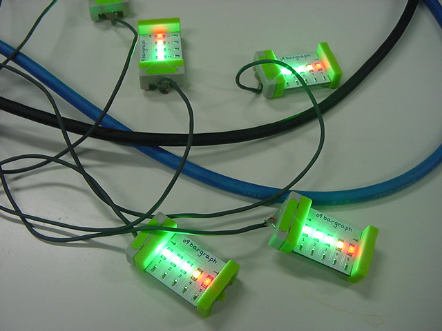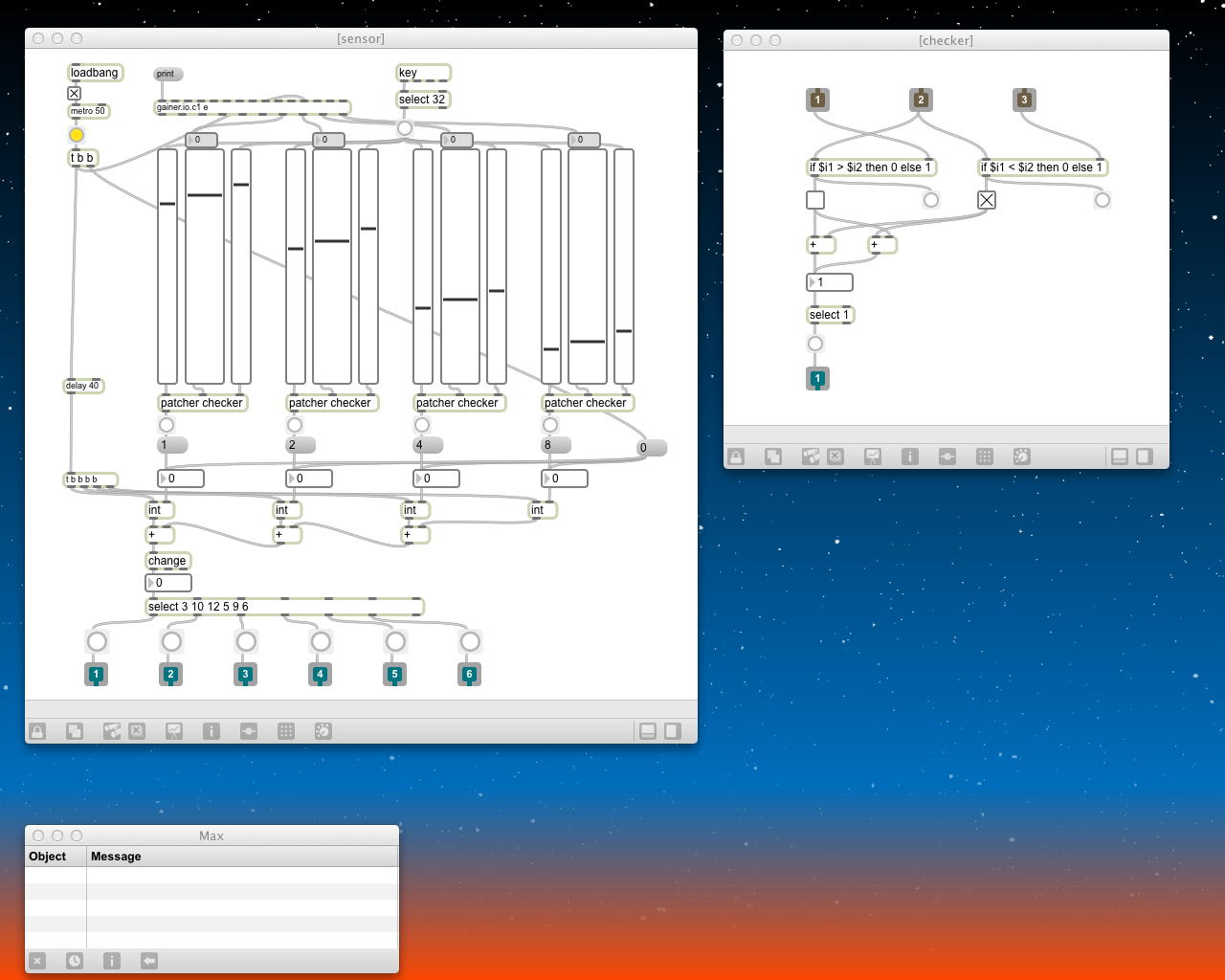 ここで使ったテクニックはその場でアドリブで考えたもので、Gainerのアナログ電圧4入力にそれぞれスライドボリューム(+5V〜0V)を入力して、そこから4人の軍手にシールドケーブルで延長して接続しているだけなのだ。 Gainerの4チャンネルのアナログ電圧として、ホワイトボードの写真にあるように、+5V〜0Vの範囲内を6分割して、相互に0.9Vほど離れた電位に設定した。 ある2人がハイタッチすると、この電圧はわずかに上下いずれかに変化するので、それを検出しよう、という作戦である。 Gainerからの出力を表示するスライダーの左右にある細いスライダーで、基準電圧の上下の境界を設定して、ここから上下いずれかに超えたことをイベントとして検出した。 さらに、イベントが起きた2人を4ビット2進数の重み付けで加算することで、「この2人の組み合わせに対応した音階番号」をデコードしている。 これまで、このようなトリッキーなセンサ回路はやった事が無かったので、なかなかに新鮮だった。 現場でアドリブで作ったMaxパッチは、その後、このグループのメンバーの佐藤さんからメイルで届き、ホテルでちょっと改訂して送ったのが、以下のようなものである。 このグループは今後、この作品をコンペに向けてブラッシュアップするとのことで、期待していよう。(^_^)