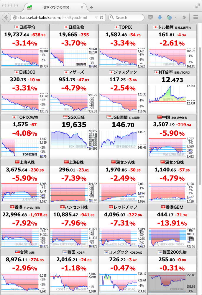 ネットの 中国バブル崩壊? のスレは相変わらず盛り上がっているが、日本のニュースは昨日の中国政府のテコ入れ(1600社の売買停止+米国債売却による資金投入)の持ち直しで「安泰」と報道している。 一体どうなるのか、まったく読む時間は無いが、とりあえず記録としてログだけ落とし続けていこう。