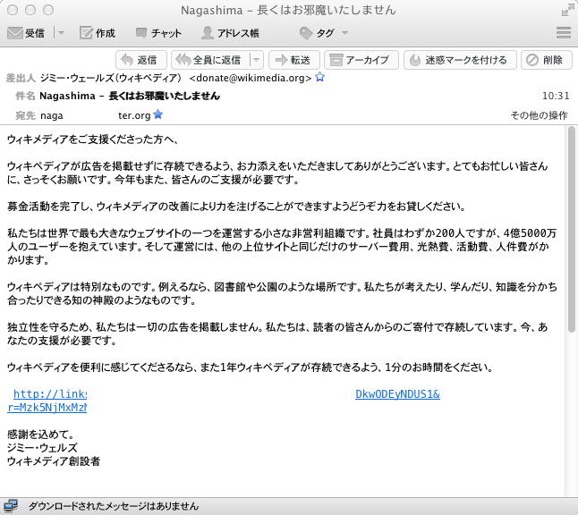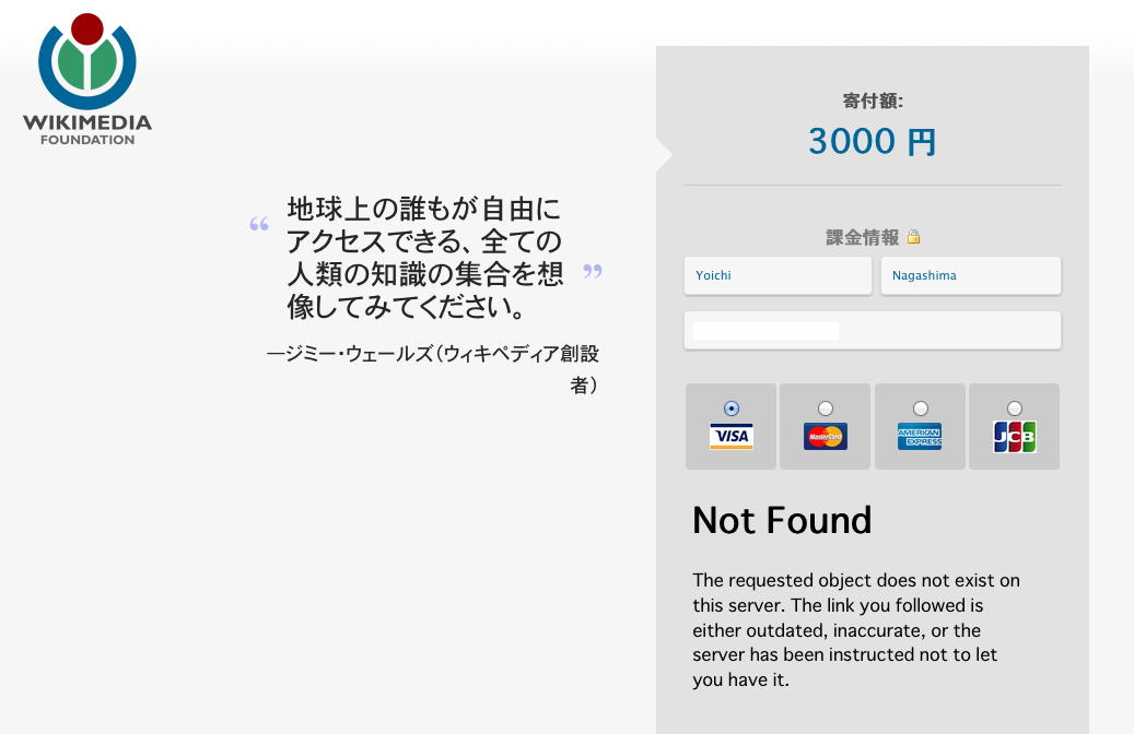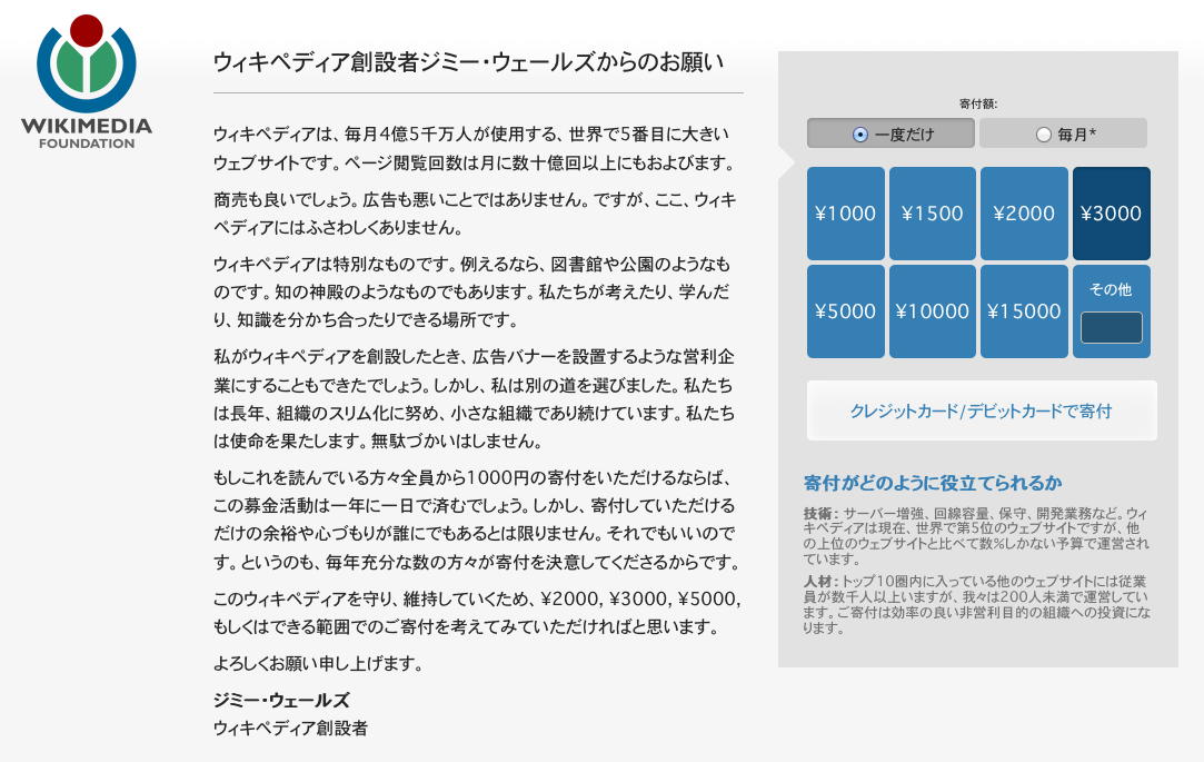 ここから一念発起、実はけっこう大変な作業だと気付きつつ、EC2015の原稿執筆に取りかかっていたところに、上のような「Nagashima - 長くはお邪魔いたしません」という高飛車なメイルが届いた。 去年のどこかで、初めてWikiPediaに寄付をしたのだが、こういう風に続くとは知らなかった(^_^;)。 しかし、常日頃、WikiPediaにはお世話になっているし、世界のオーブンソース文化のリーダーでもあるので、年に一度ぐらい寄付してもいいかな、と思って以下のようにクレジットカードで手続きしたが、何故かエラーで受け付けられなかった。 FAQの「なぜ私のクレジットカード/デビットカードの寄付が拒否されたのですか?」を見ると、「カード発行元が取引を留保する場合があります。ウィキメディア財団へ初めて寄付をされる場合、特にその可能性が高くなります。ウィキメディア財団への今後のお取引に関するブロックを解除するようにカードの発行元に連絡し、今後の寄付が正常に処理されるようにしてください。」とのことだった。 まぁ、これは面倒なのでパスした。 どうやらWikiPediaはVISAから白い目で見られているようだが、これは僕の知らない事なので、受け付けられないなら寄付はナシである。