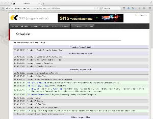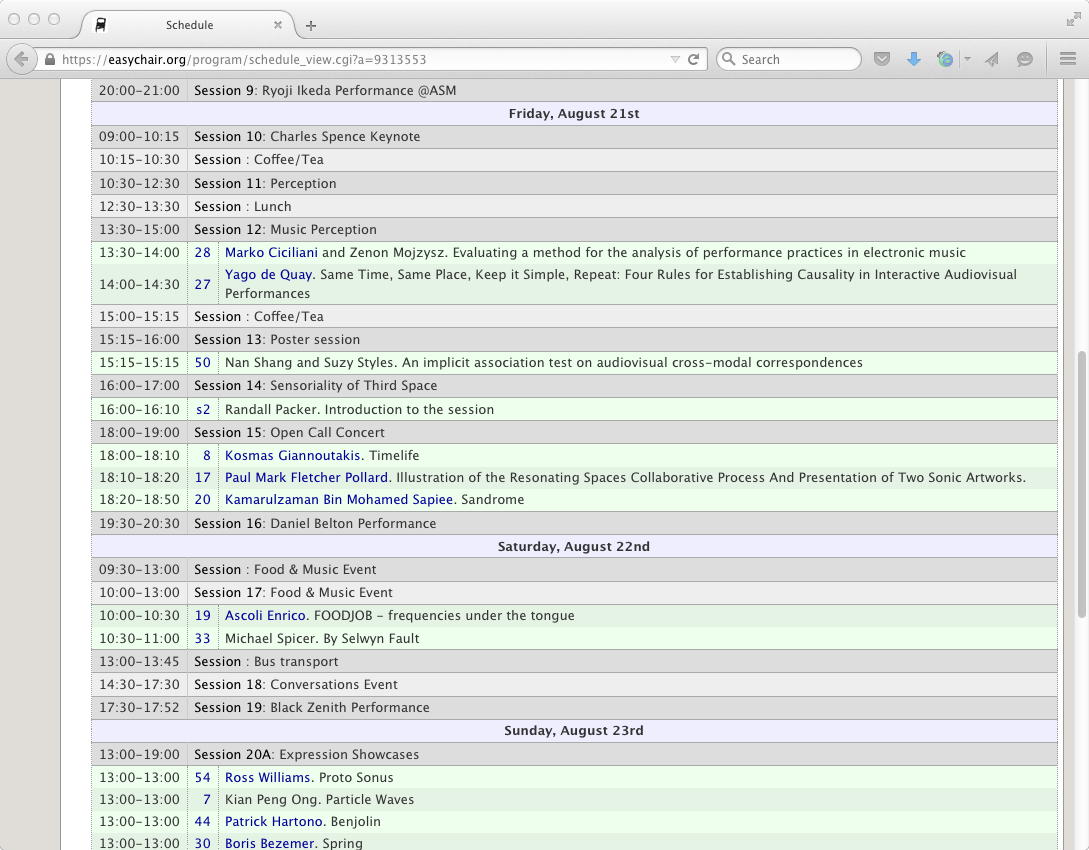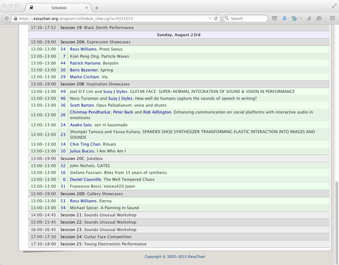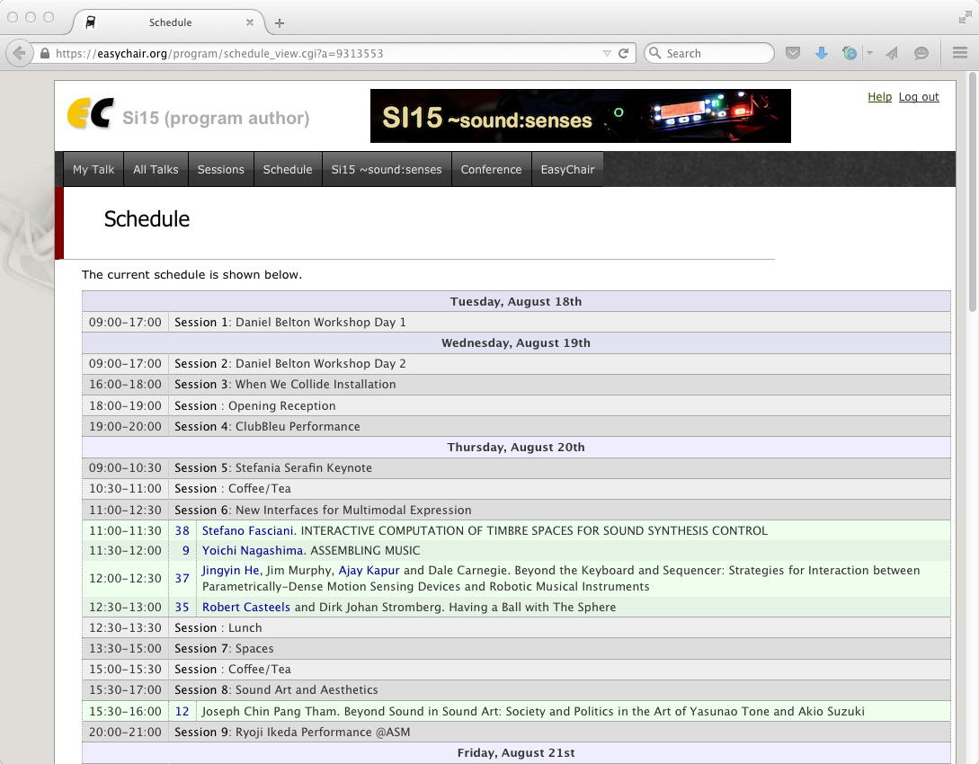 そして、昨日からやりとりしている 2nd International Symposium on Sound and Interactivity との情報交換から、どうやら僕が日曜日にArtScienceMuseumで行うDEMOとは、SI2015のデモセッションとして募集したものに加えることらしい・・・と判明してきた。 久しぶりにEasyChair(論文を投稿するオープンソースのサイト。最近ではほとんどの国際会議がこれを利用している)のページに行くと、まだ暫定らしいが、上のようにプログラムが出てきた。 あちこち未定のセッションだらけなのがやや不安だが(^_^;)、僕のセッションの座長はなんと電機大の小坂さんだった(^_^)。
