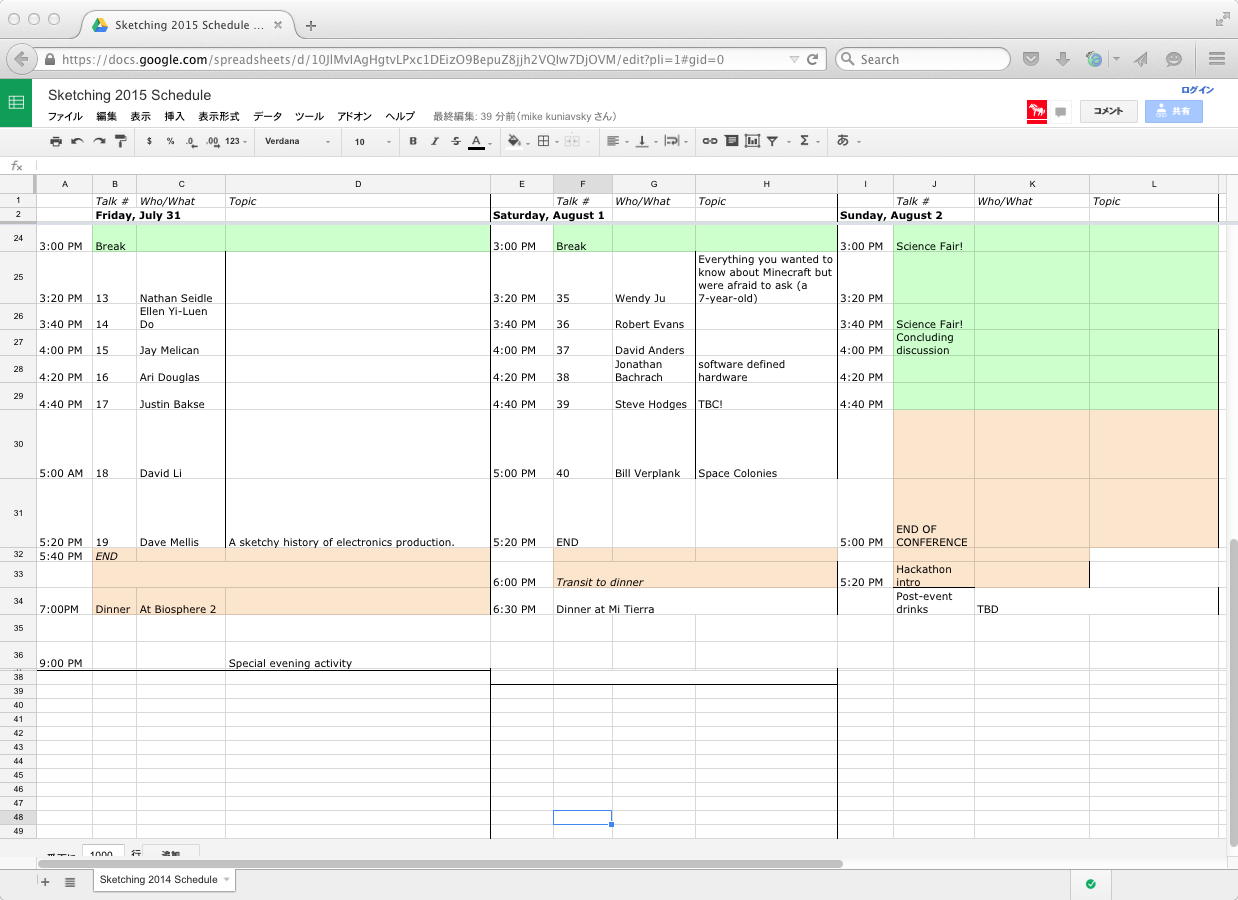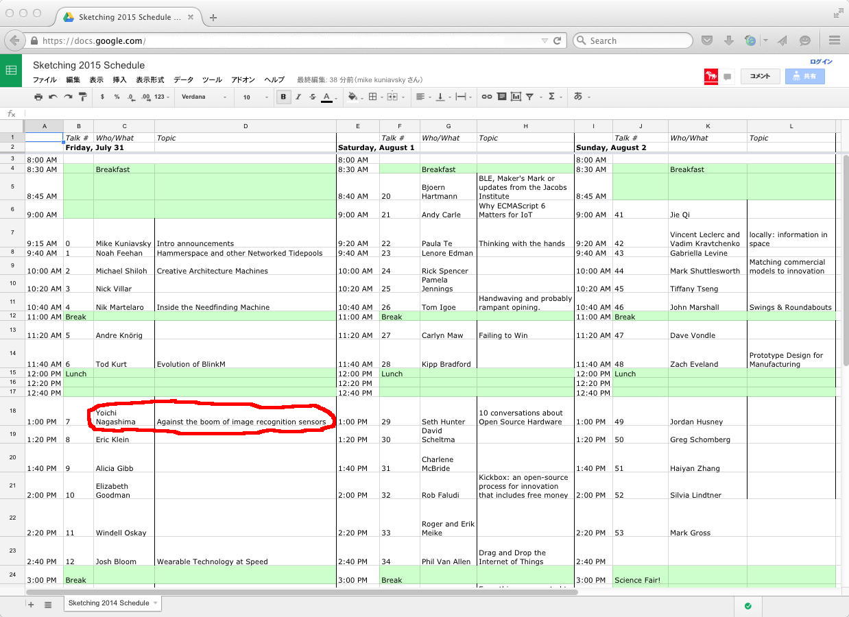そして、Sketching2015の暫定プログラムが上のように届いた。 僕はどういうタイトルで出していたか忘れていたが、「Against the boom of image recognition sensors」とは、なかなかに挑戦的なものだった。 ちょうど、「お触りセンサ(MRTI2015)」が完成したので、これと「ダブルMyo」でデモし倒すことにしよう。 Maxのプログラミングに気合いを入れていきたい。