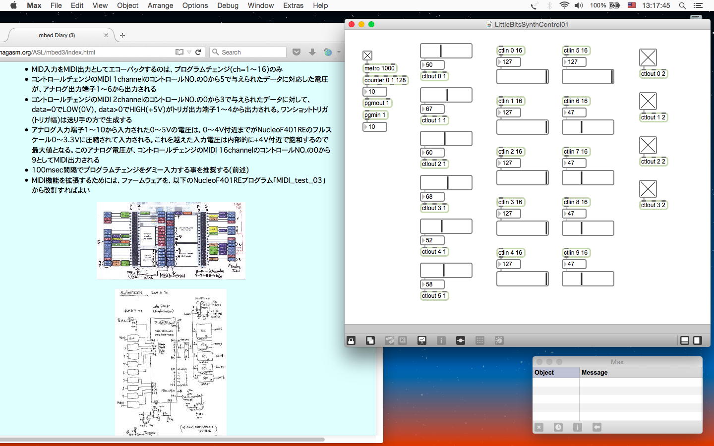 そして午後になり、「企画立案演習」のクラス内発表会に向かうまでに・・・と、凄く久しぶりにLittleBitsSynthとLittleBitsSynthControllerを開けてみた。 アリゾナでのSketching2015では、「お触り楽器」とともにこれを持参して、さりげにNucleoF401REの紹介をするためである。 ところが、探しても探しても、肝心のMaxパッチが発掘できなくて困った(^_^;)。 あちこち探して判明したのは、 mbed日記 (3) の「2014年11月20日(木)」の最後のところでNucleoF401REのファームウェアは完成して、以下のような仕様となっていたのだが、なんとその時に実験で作ったMaxパッチは保存していなかったのだった。 LittleBitsSynthController「NucleoMIDI_1」のシステム仕様と回路図をここに再録すると以下である。
