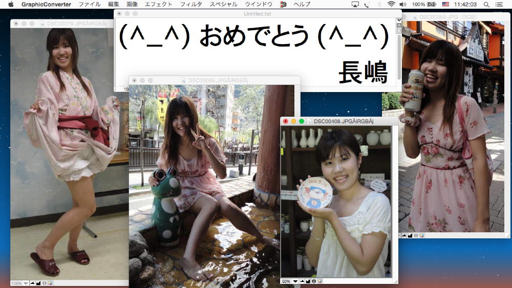 そこで、手描きもナンなので、かつて ゼミ合宿・下呂温泉 に一緒に行った時の写真から金子さんが写っているものを並べて、以下のようなものを作って写真に撮ってもらった。 ただし結婚式までは秘密ということで、サムネイルをクリックしても「Not Found」となるのであしからず。(^_^;)