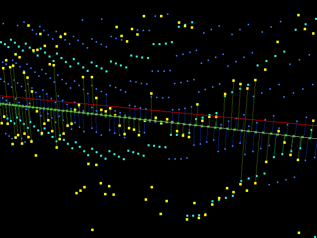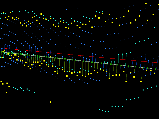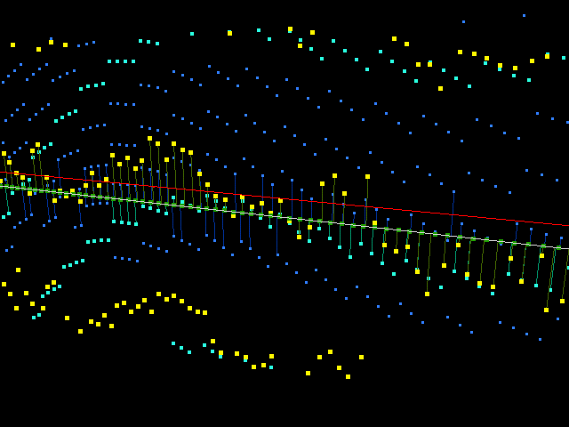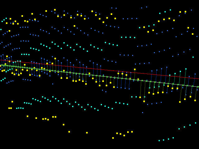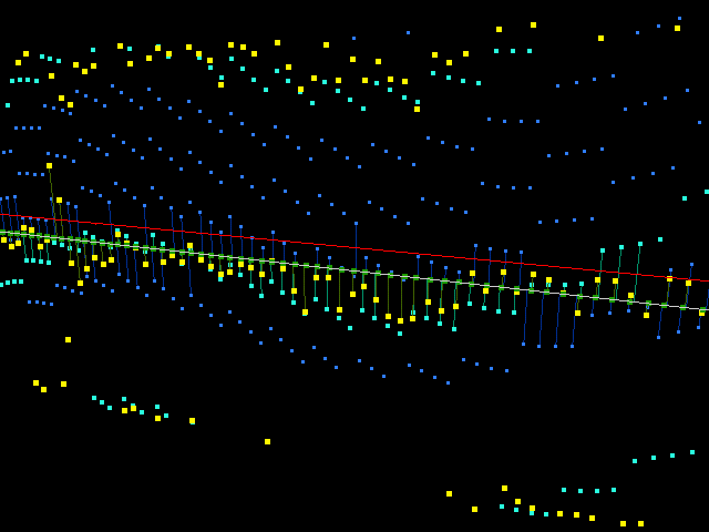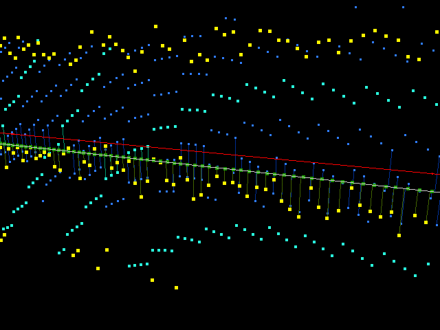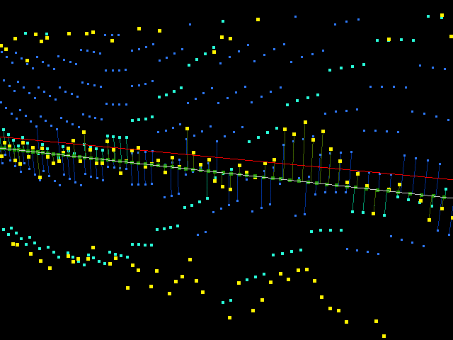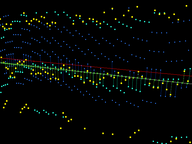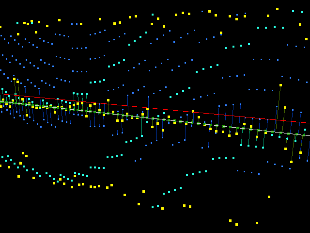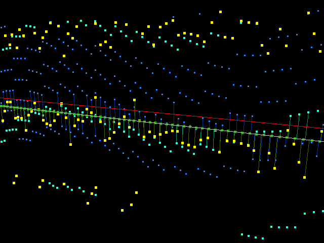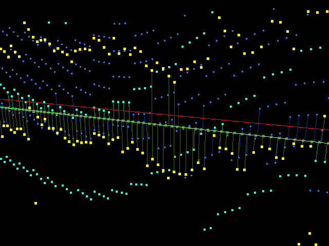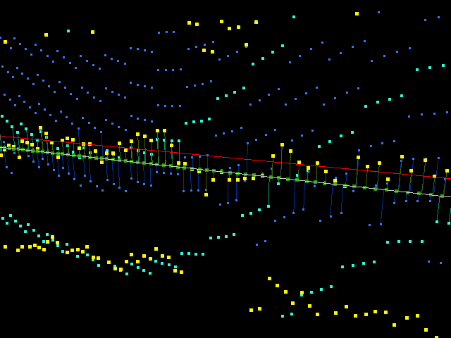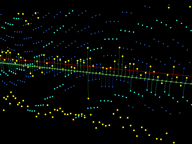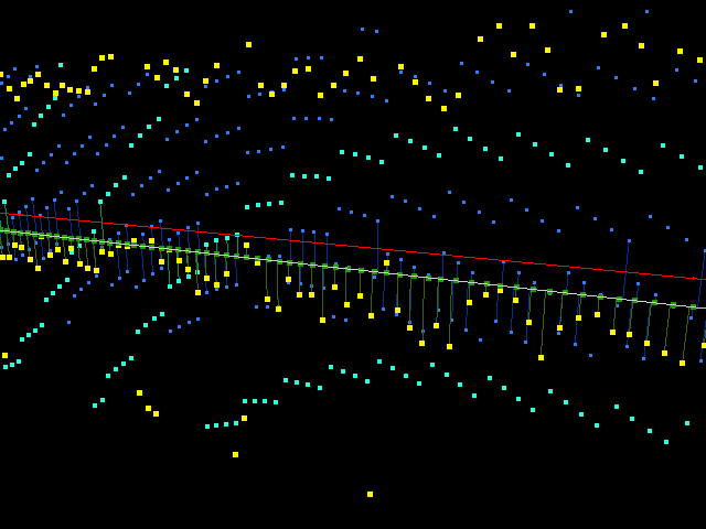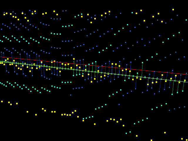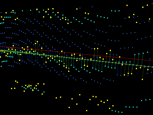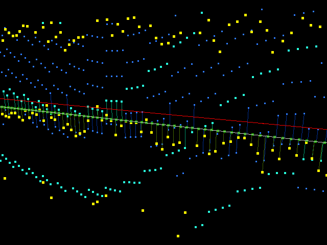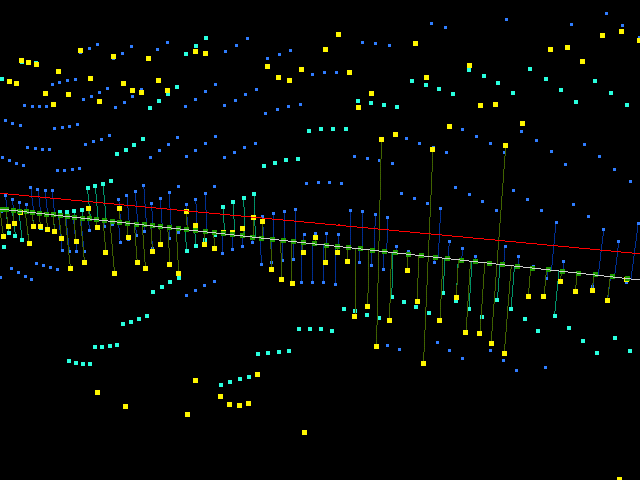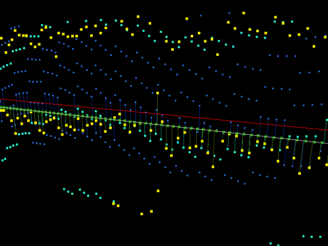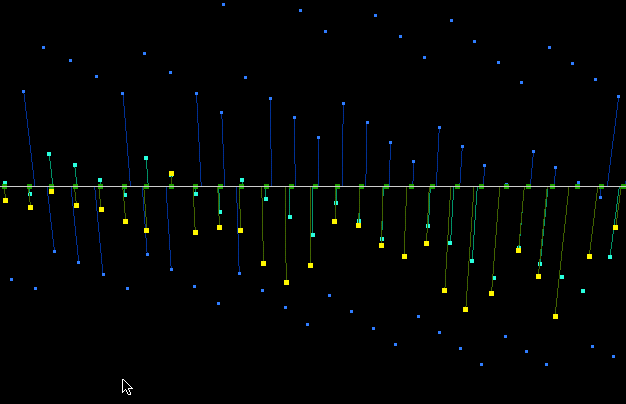 モーフィングによる映像素材では、タッピングのデータはデータ軸のわずか上方にあるために、映像ビートの単位だけずれた同じデータ群は画面下方にだけ出現した。 これは、この被験者が映像ビートに対して、ほぼ一律にわずかに遅れた時点をタッピングの「ヒット点」として認識していることの証しである。 これに対して、上図のように上下にほぼ同等に出現するのは、タッピングのデータが完全にデータ軸の中央に平均を持っているからであるが、モーフィング素材ではこれはほとんど見られない現象なのである。