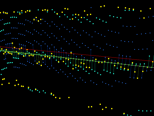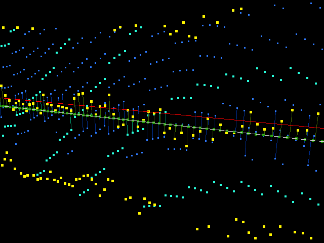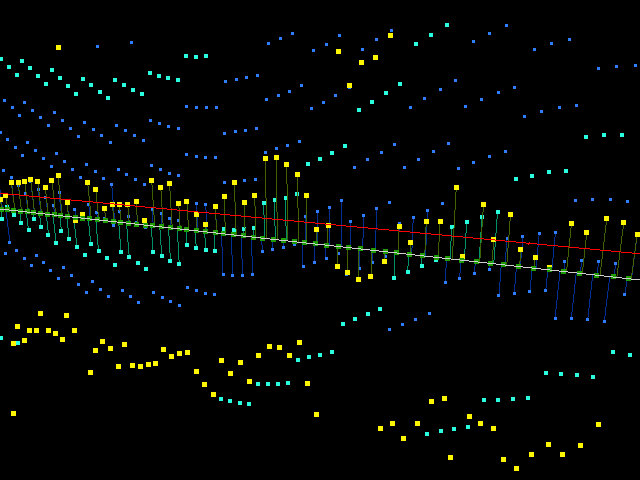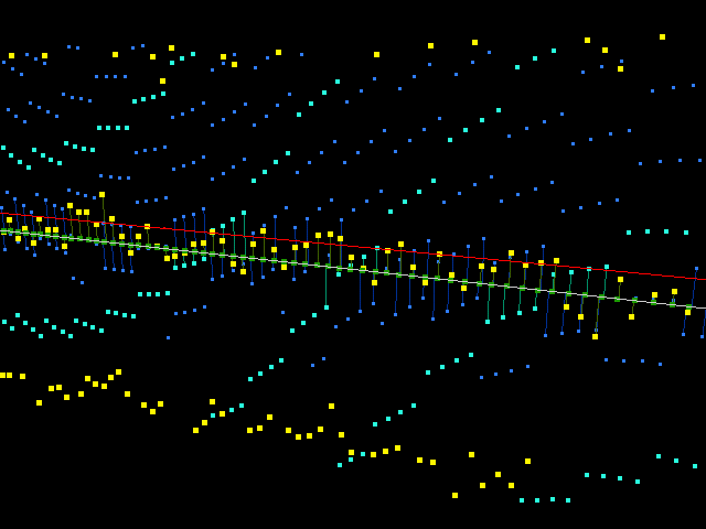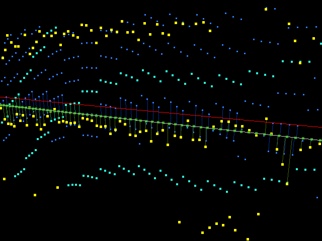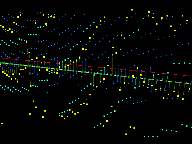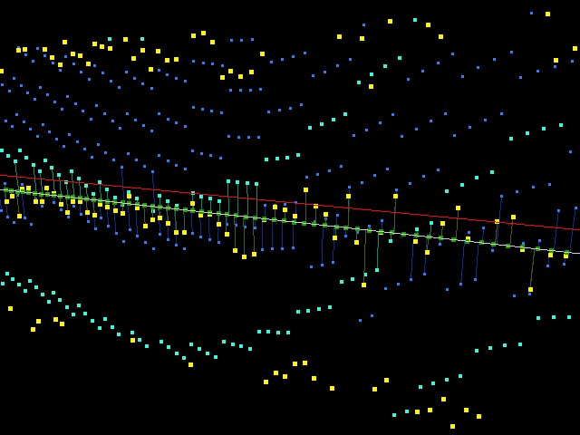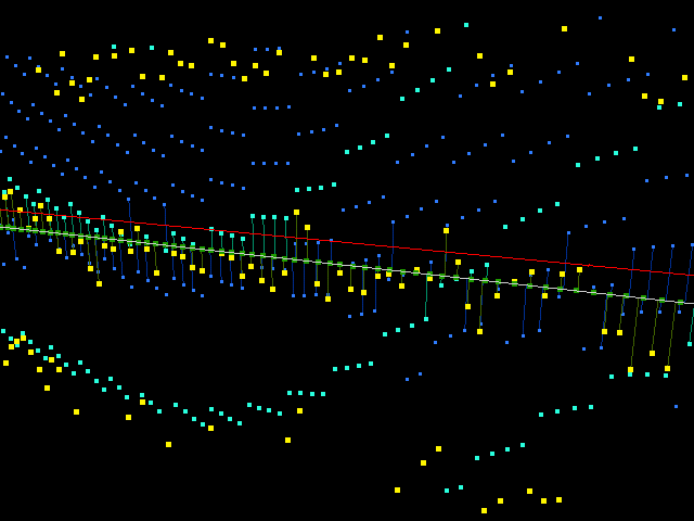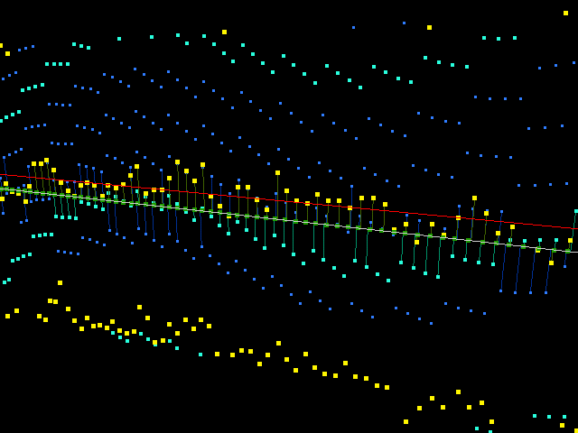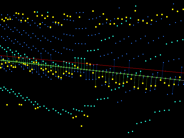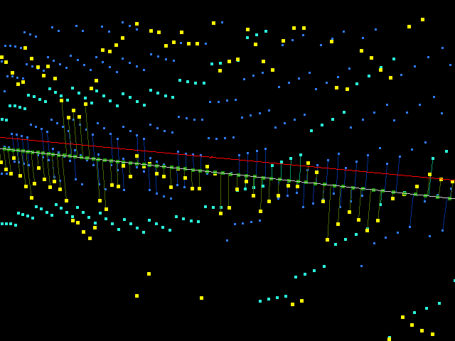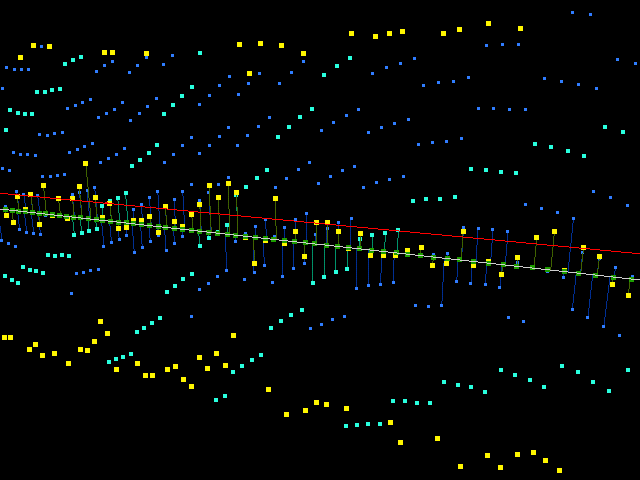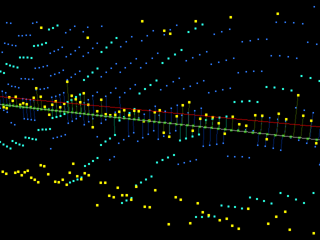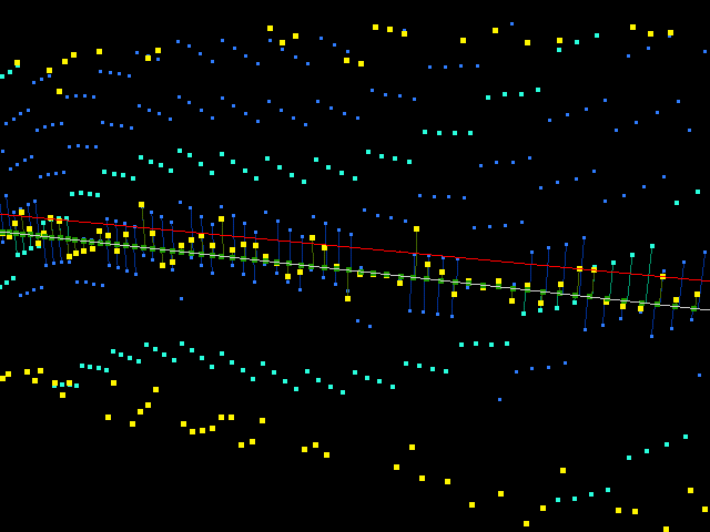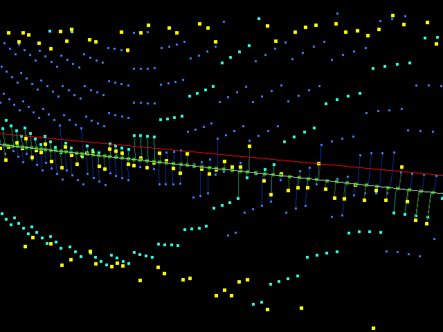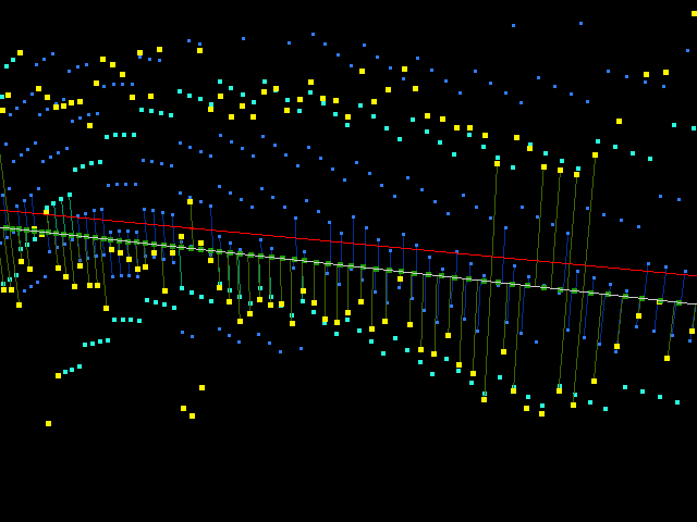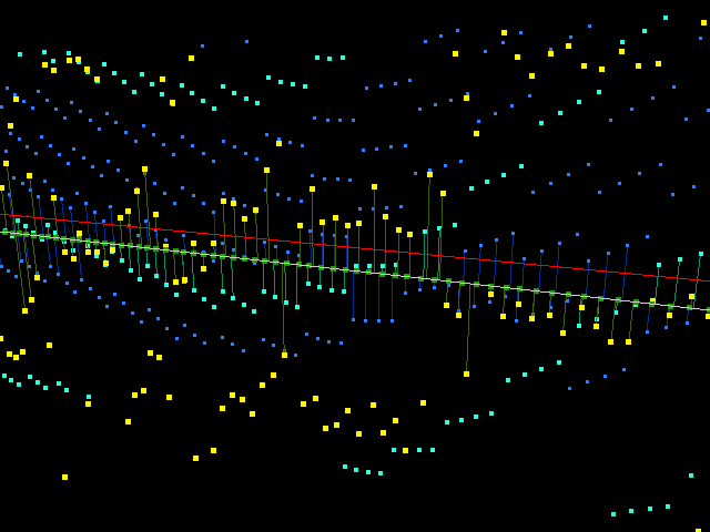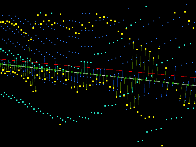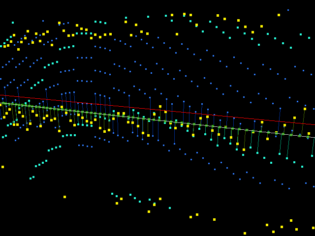 モーフィングによる映像素材では、タッピングのデータはデータ軸のわずか上方にあるために、映像ビートの単位だけずれた同じデータ群は画面下方にだけ出現した。 これは、この被験者が映像ビートに対して、ほぼ一律にわずかに遅れた時点をタッピングの「ヒット点」として認識していることの証しである。 これに対して、上図のように上下にほぼ同等に出現するのは、タッピングのデータが完全にデータ軸の中央に平均を持っているからであるが、モーフィング素材ではこれはほとんど見られない現象なのである。