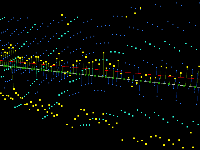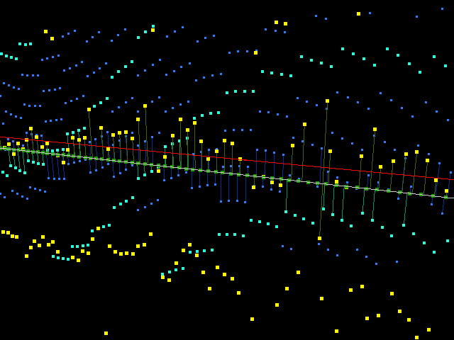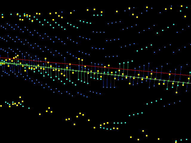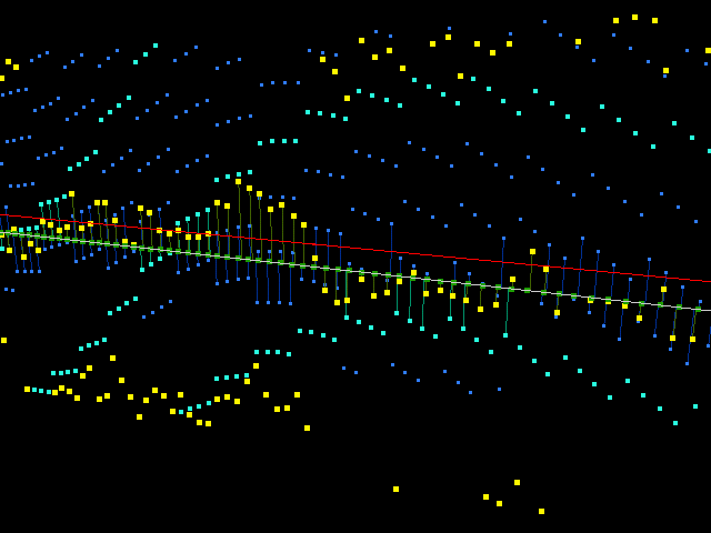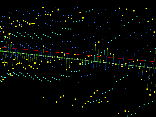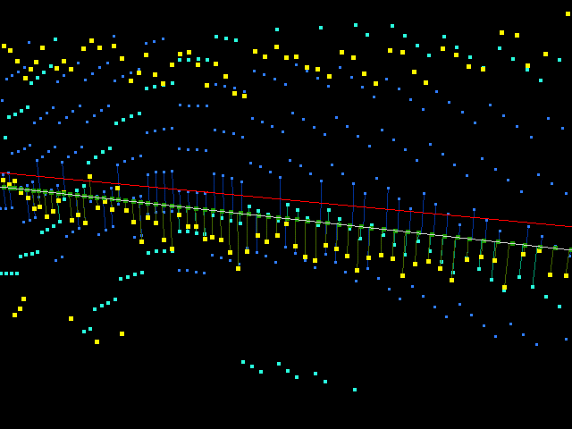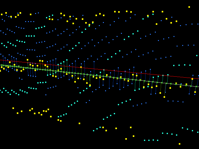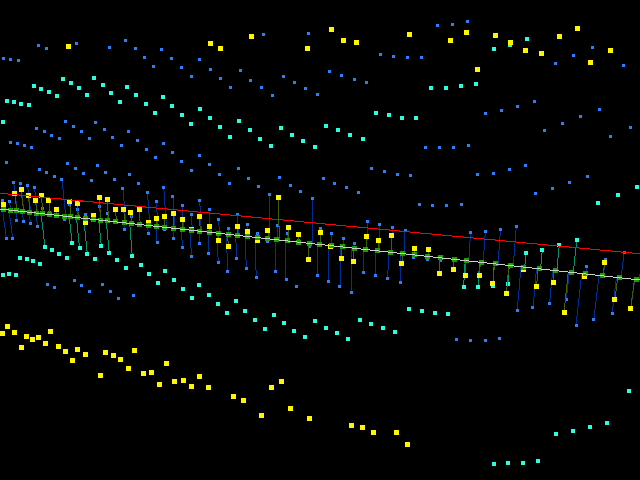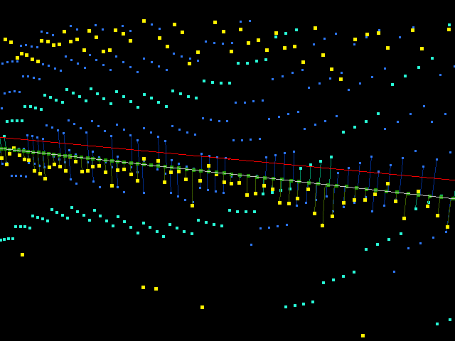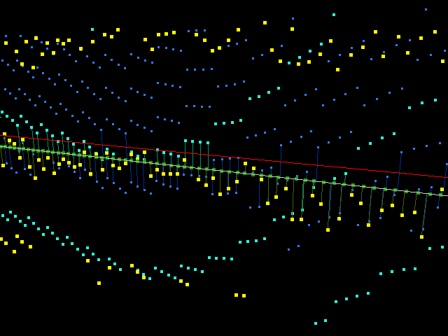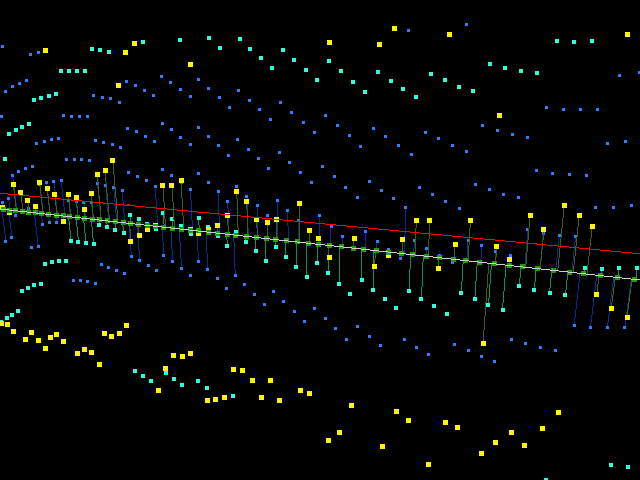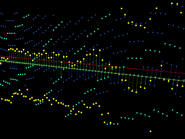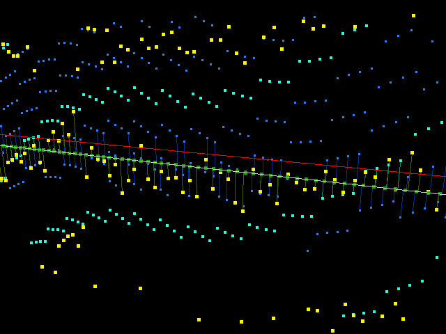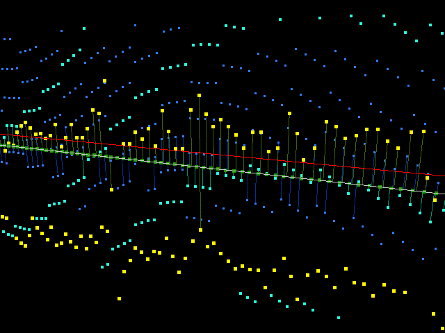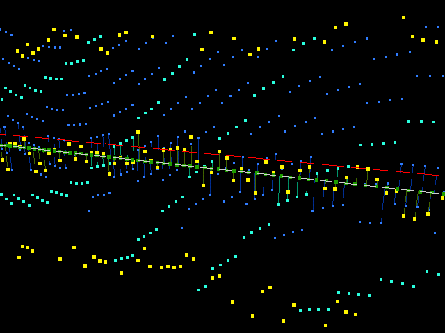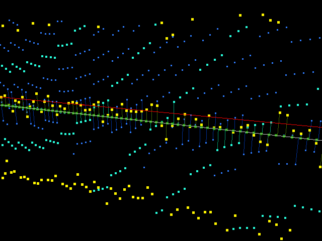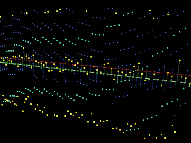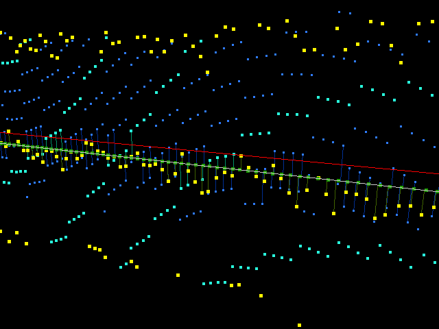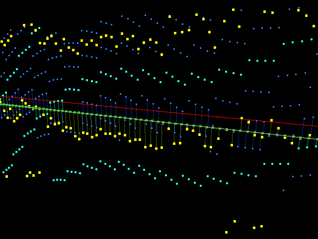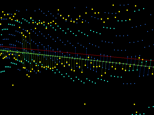 モーフィングによる映像素材では、タッピングのデータはデータ軸のわずか上方にあるために、映像ビートの単位だけずれた同じデータ群は画面下方にだけ出現した。 これは、この被験者が映像ビートに対して、ほぼ一律にわずかに遅れた時点をタッピングの「ヒット点」として認識していることの証しである。 これに対して、上図のように上下にほぼ同等に出現するのは、タッピングのデータが完全にデータ軸の中央に平均を持っているからであるが、モーフィング素材ではこれはほとんど見られない現象なのである。