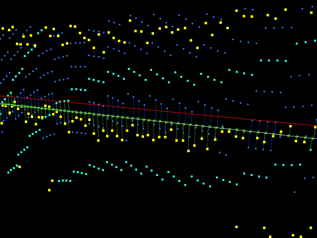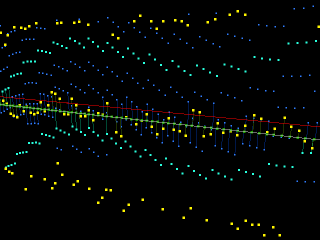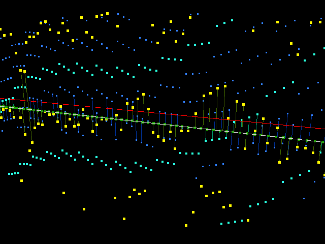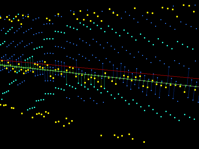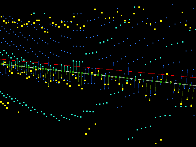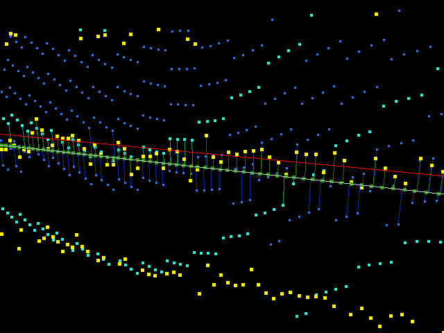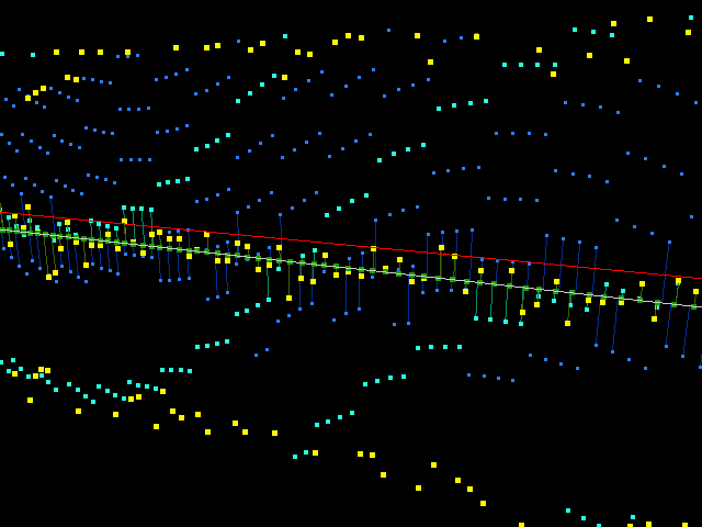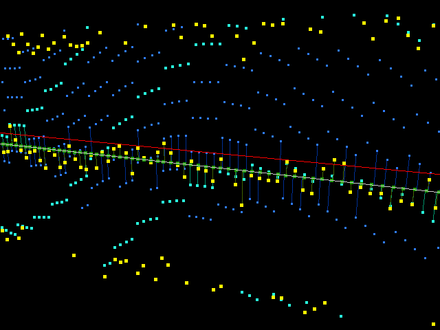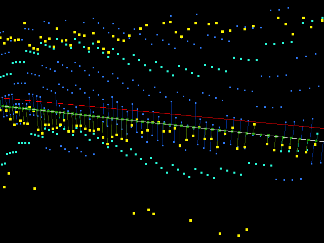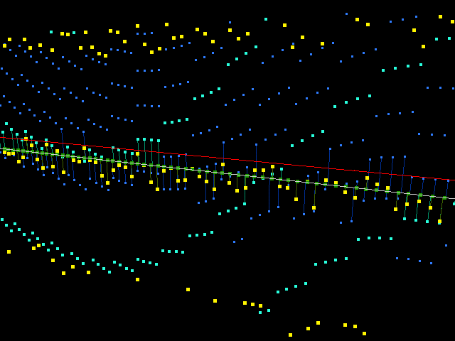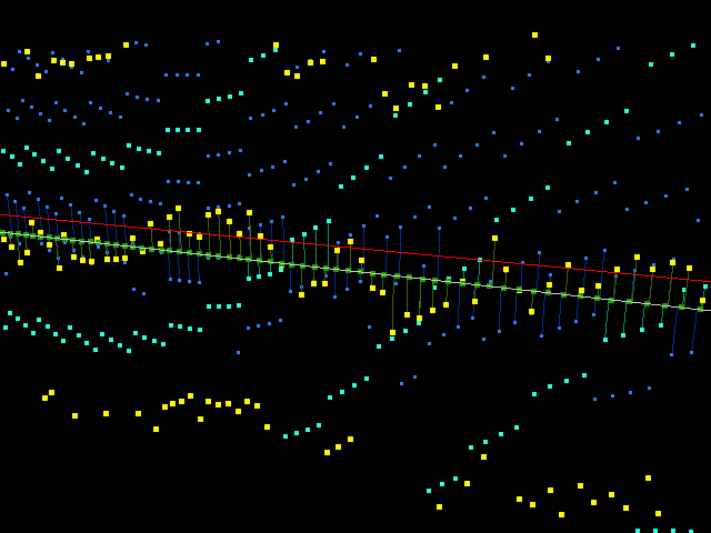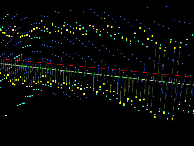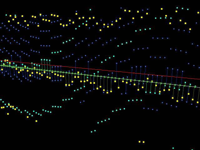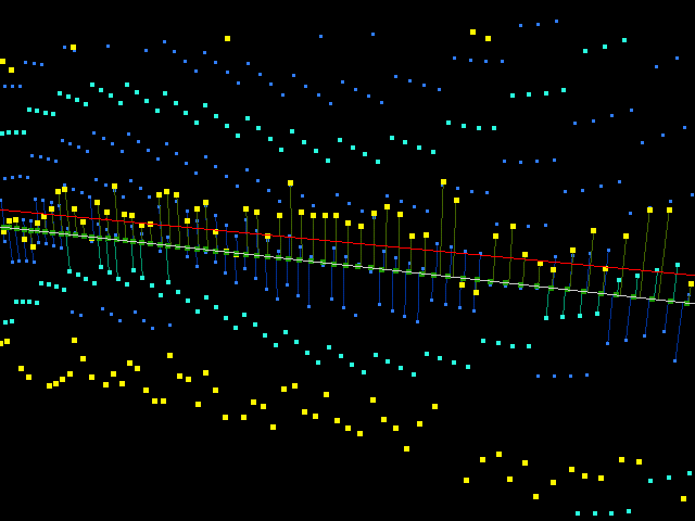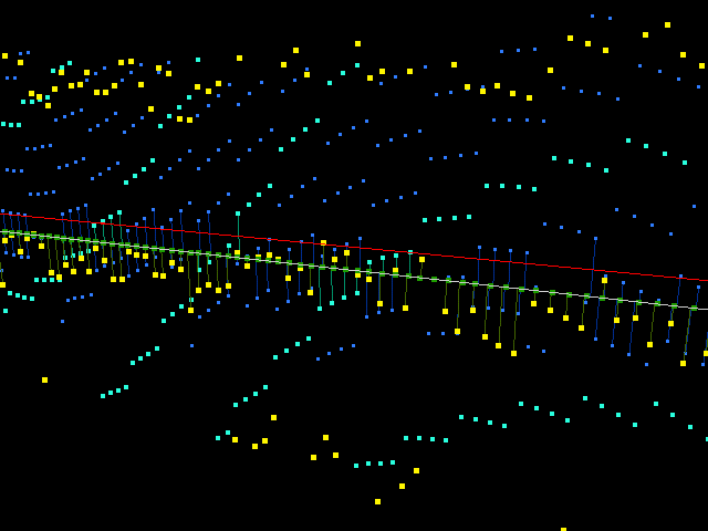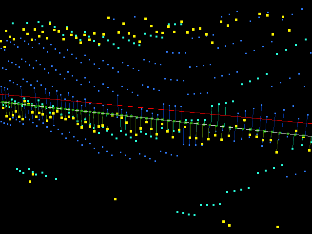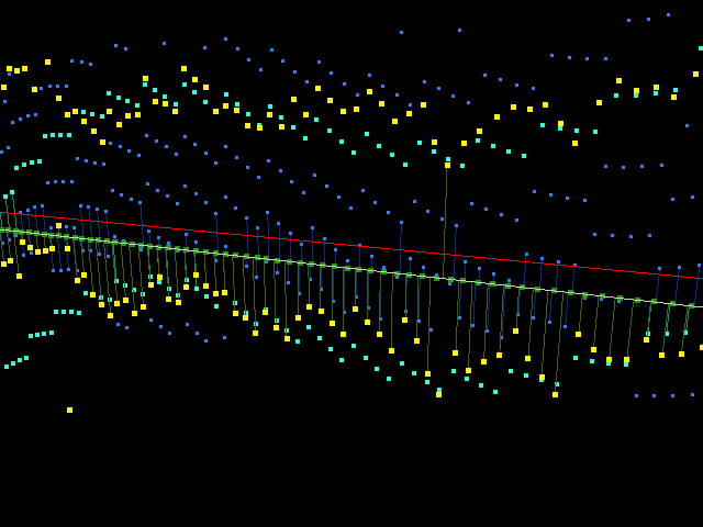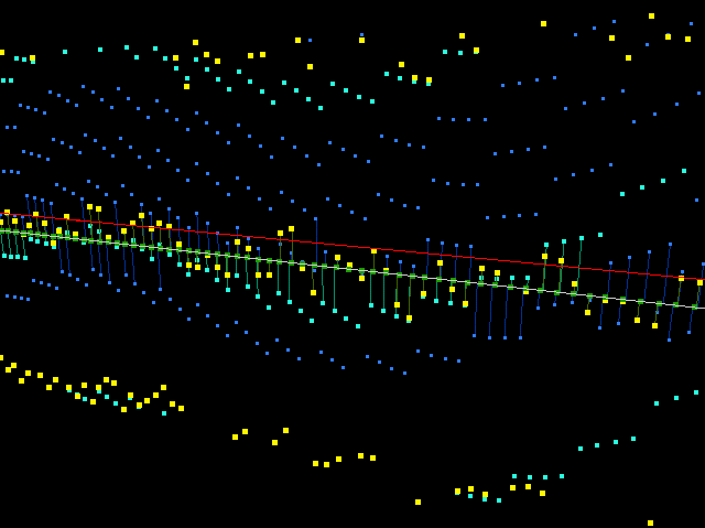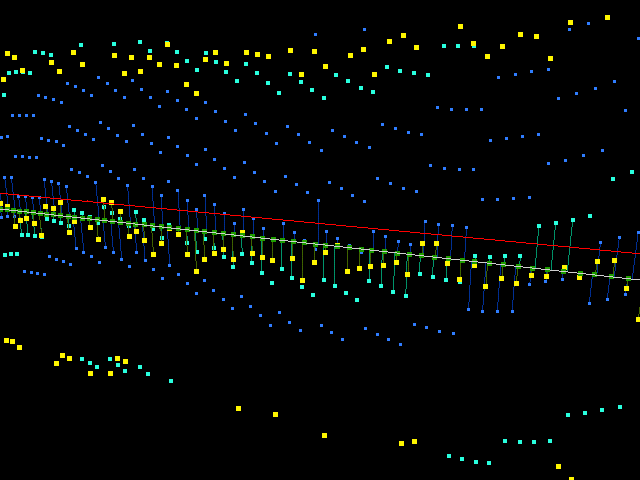 モーフィングによる映像素材では、タッピングのデータはデータ軸のわずか上方にあるために、映像ビートの単位だけずれた同じデータ群は画面下方にだけ出現した。 これは、この被験者が映像ビートに対して、ほぼ一律にわずかに遅れた時点をタッピングの「ヒット点」として認識していることの証しである。 これに対して、上図のように上下にほぼ同等に出現するのは、タッピングのデータが完全にデータ軸の中央に平均を持っているからであるが、モーフィング素材ではこれはほとんど見られない現象なのである。