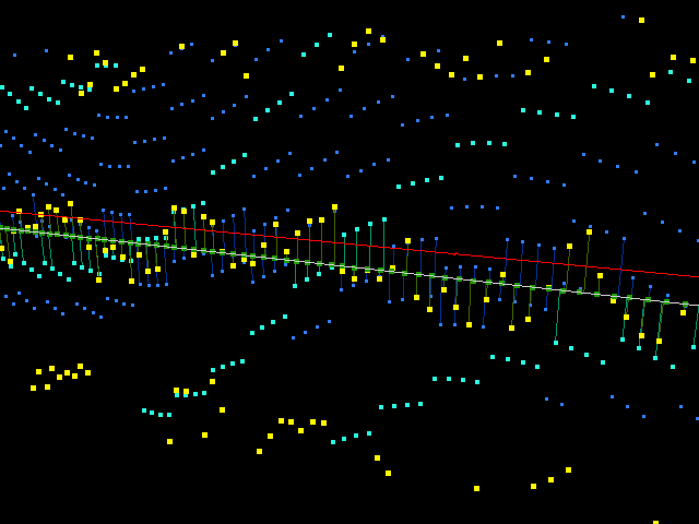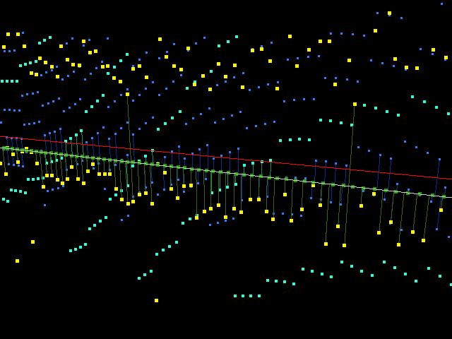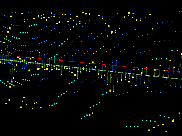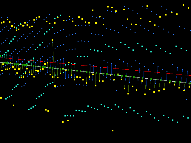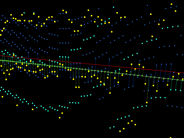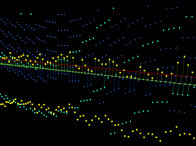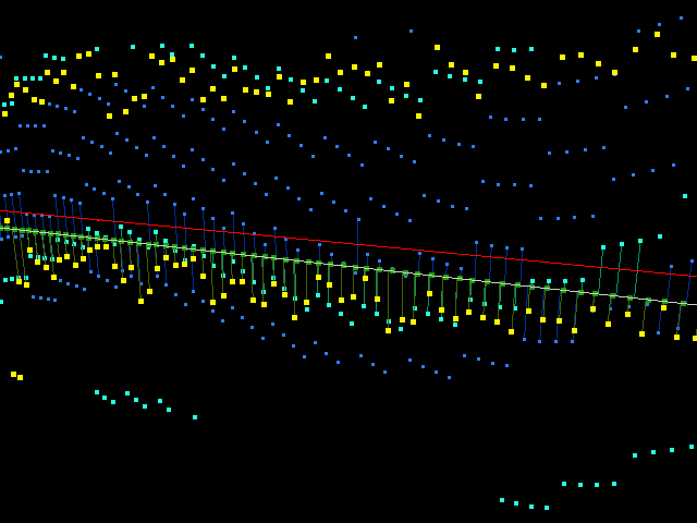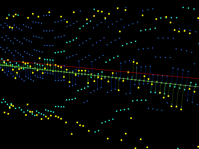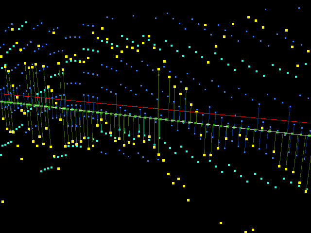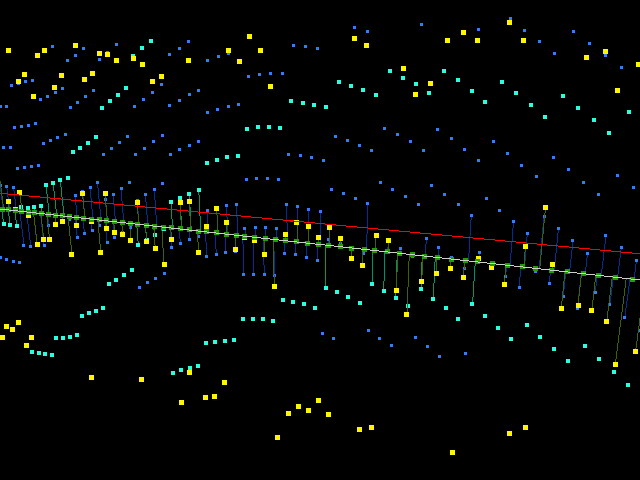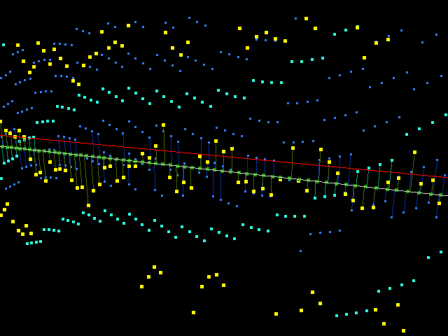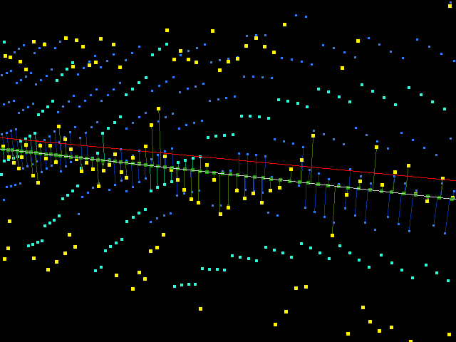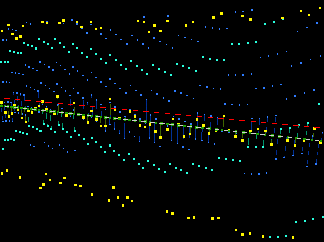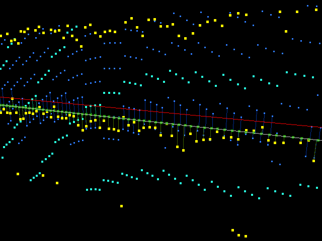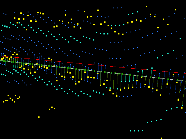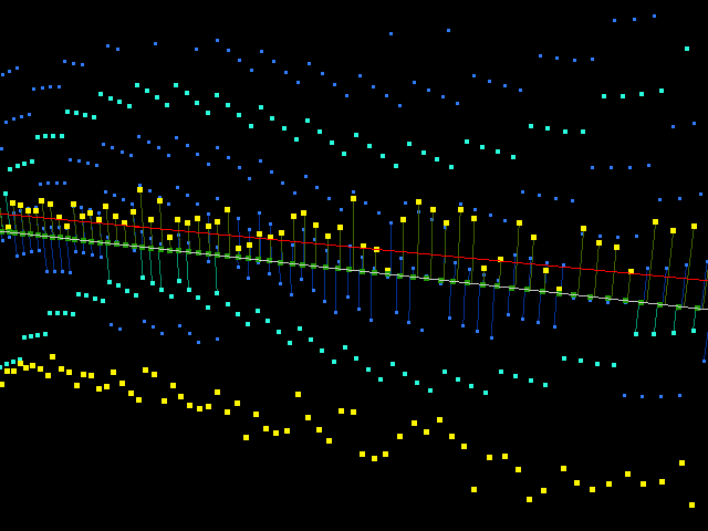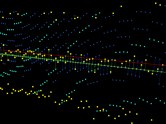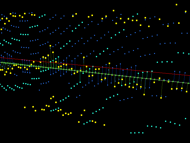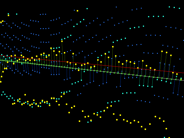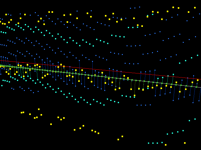 モーフィングによる映像素材では、タッピングのデータはデータ軸のわずか上方にあるために、映像ビートの単位だけずれた同じデータ群は画面下方にだけ出現した。 これは、この被験者が映像ビートに対して、ほぼ一律にわずかに遅れた時点をタッピングの「ヒット点」として認識していることの証しである。 これに対して、上図のように上下にほぼ同等に出現するのは、タッピングのデータが完全にデータ軸の中央に平均を持っているからであるが、モーフィング素材ではこれはほとんど見られない現象なのである。