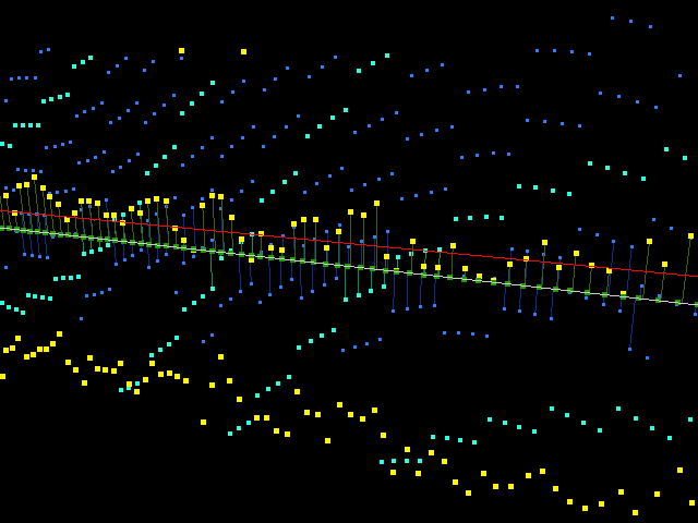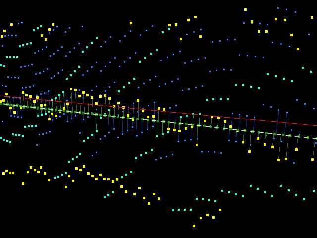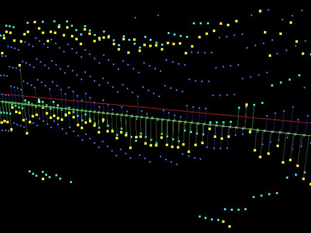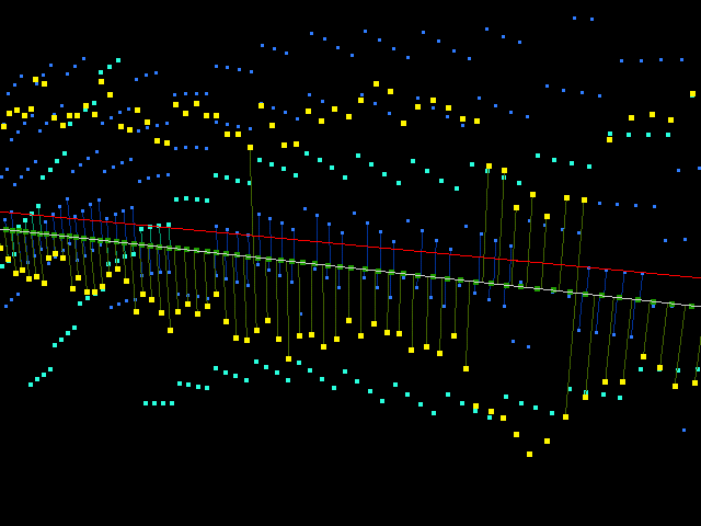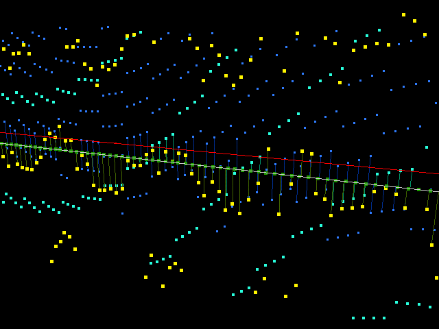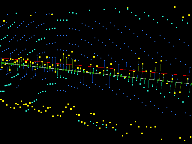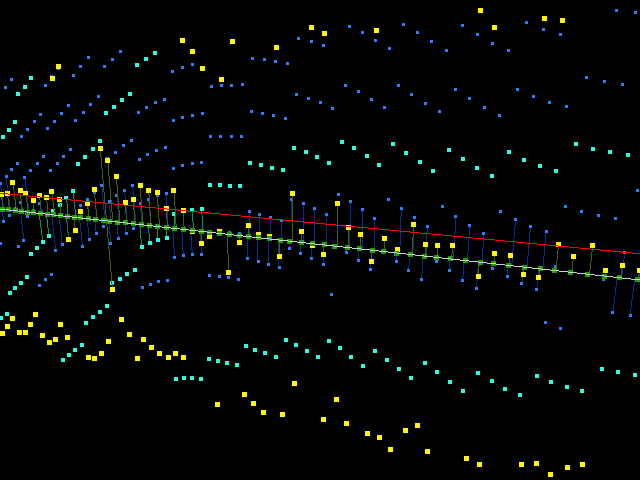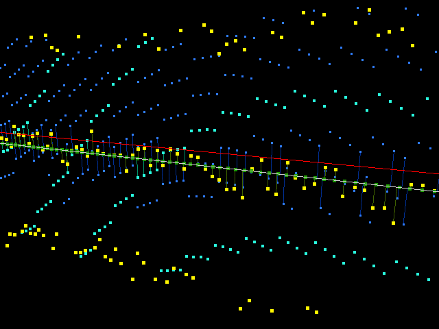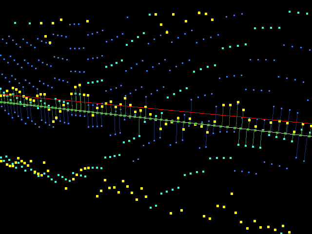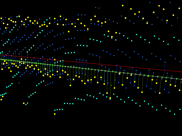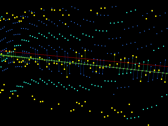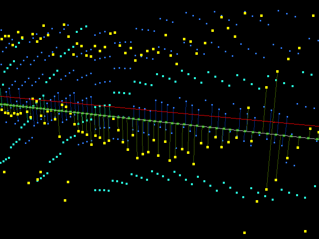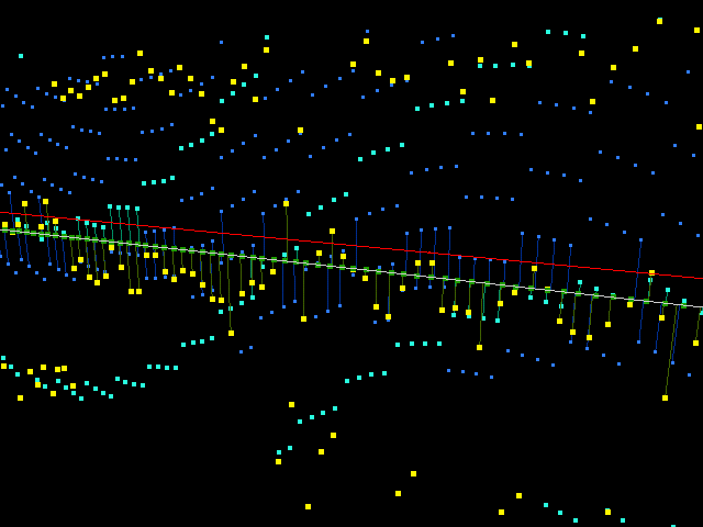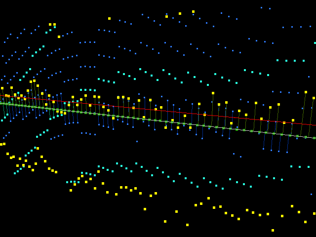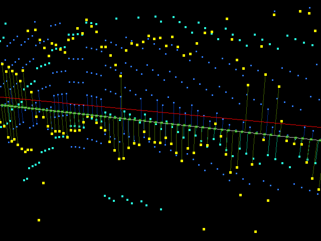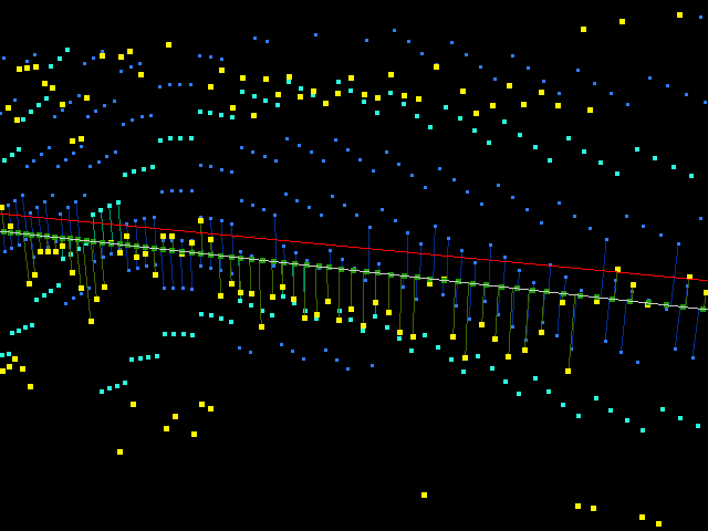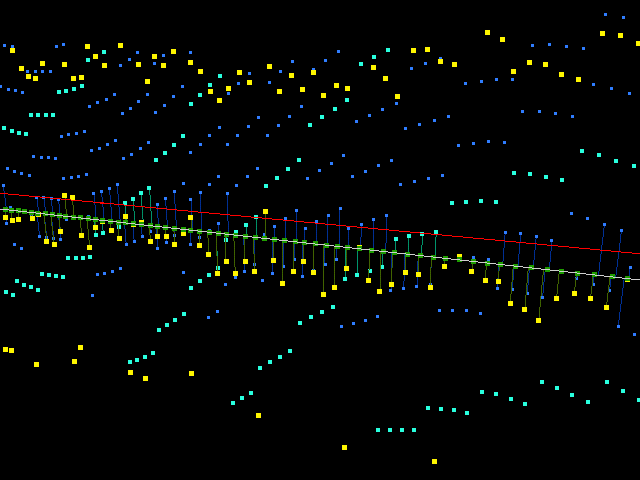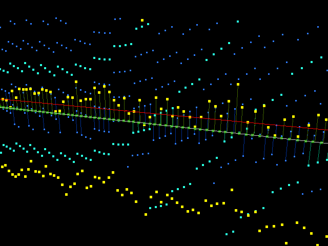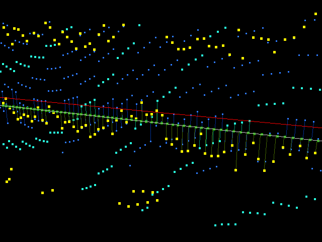 モーフィングによる映像素材では、タッピングのデータはデータ軸のわずか上方にあるために、映像ビートの単位だけずれた同じデータ群は画面下方にだけ出現した。 これは、この被験者が映像ビートに対して、ほぼ一律にわずかに遅れた時点をタッピングの「ヒット点」として認識していることの証しである。 これに対して、上図のように上下にほぼ同等に出現するのは、タッピングのデータが完全にデータ軸の中央に平均を持っているからであるが、モーフィング素材ではこれはほとんど見られない現象なのである。