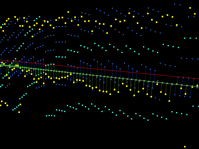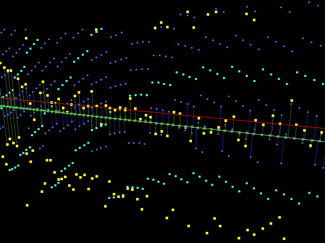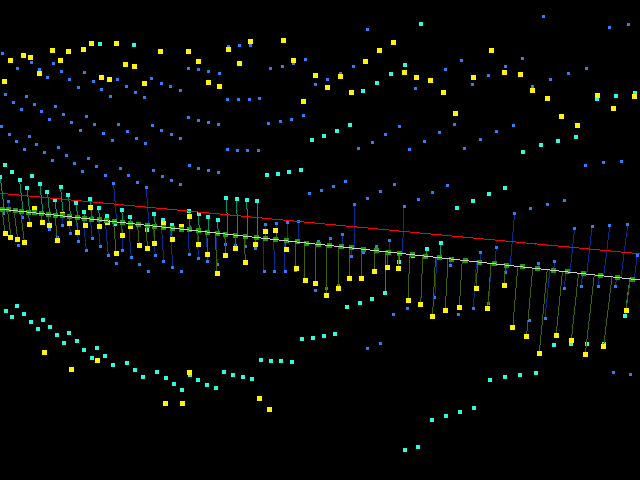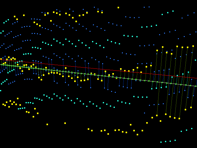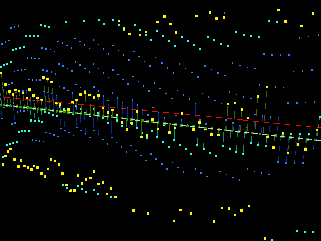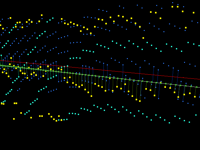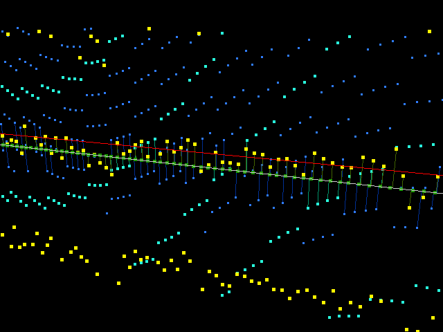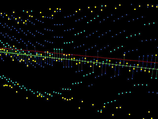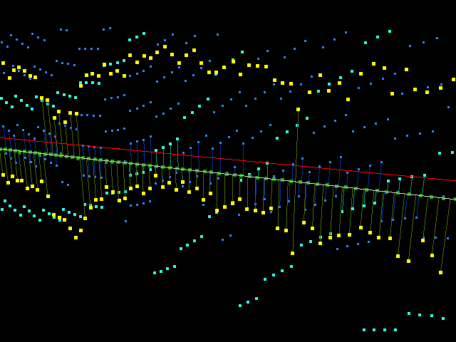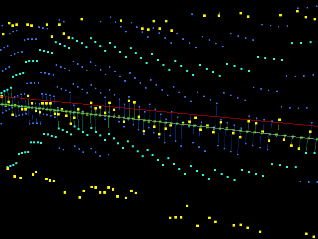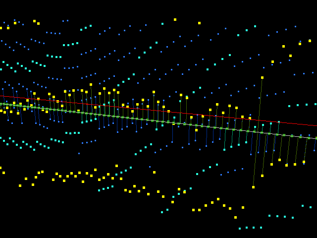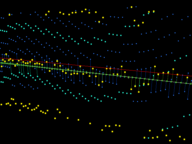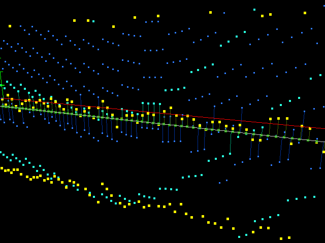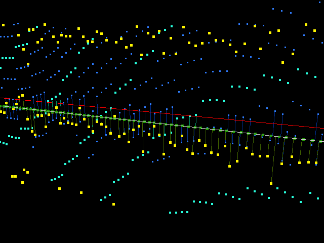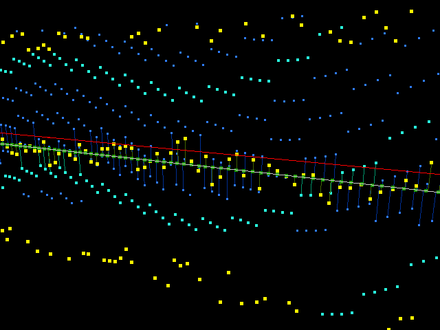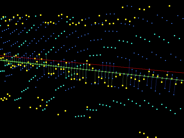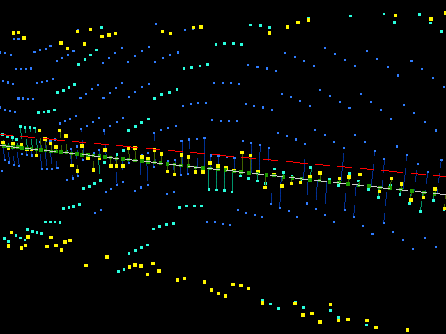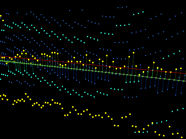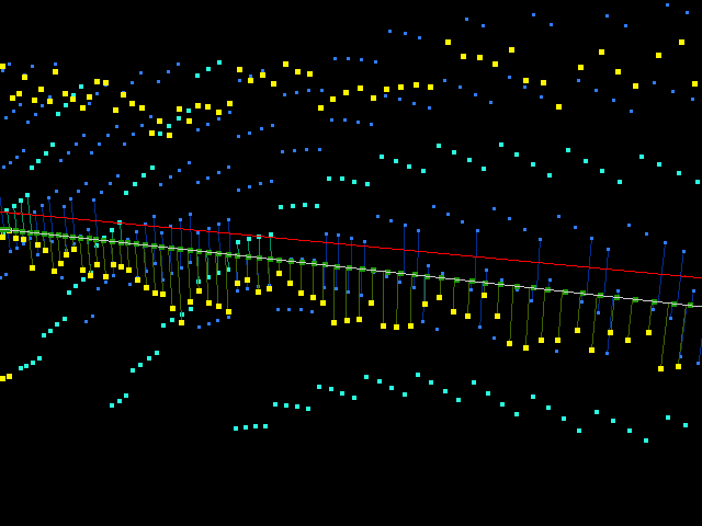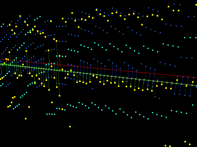 モーフィングによる映像素材では、タッピングのデータはデータ軸のわずか上方にあるために、映像ビートの単位だけずれた同じデータ群は画面下方にだけ出現した。 これは、この被験者が映像ビートに対して、ほぼ一律にわずかに遅れた時点をタッピングの「ヒット点」として認識していることの証しである。 これに対して、上図のように上下にほぼ同等に出現するのは、タッピングのデータが完全にデータ軸の中央に平均を持っているからであるが、モーフィング素材ではこれはほとんど見られない現象なのである。