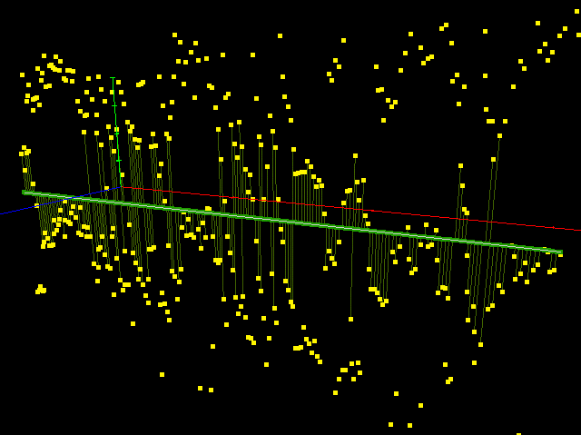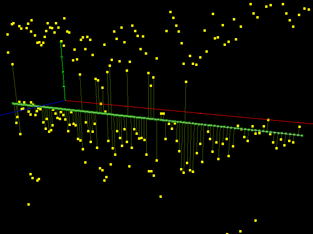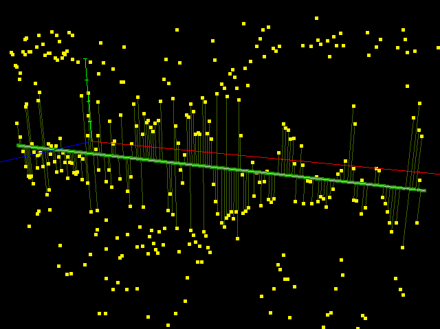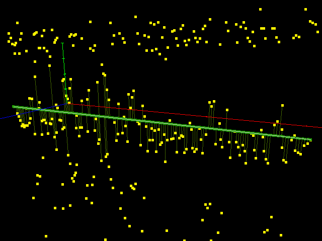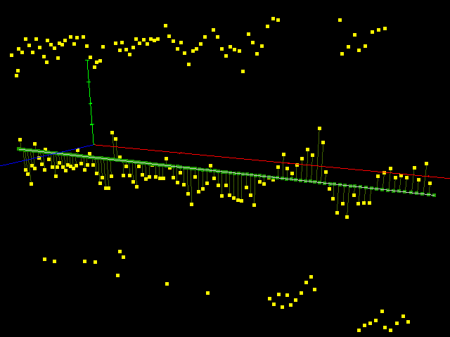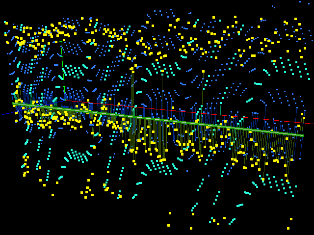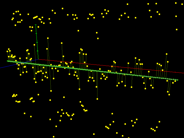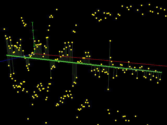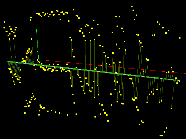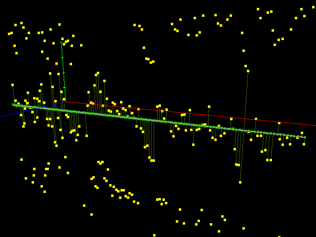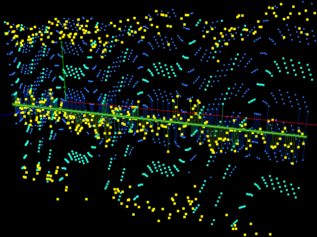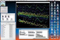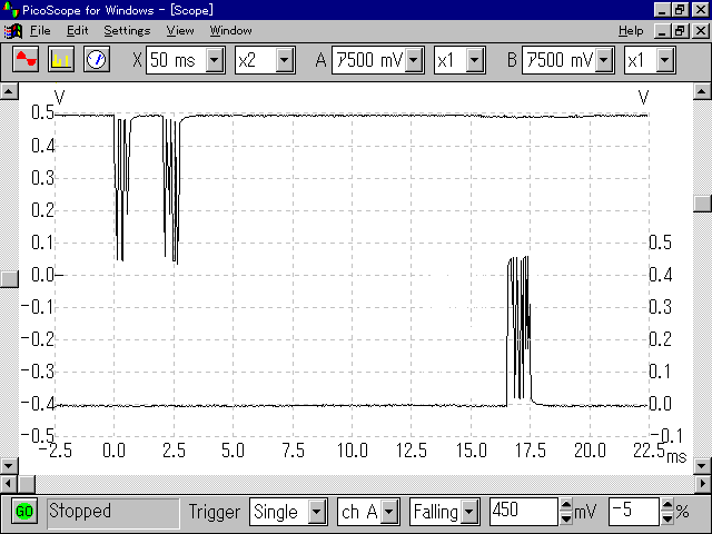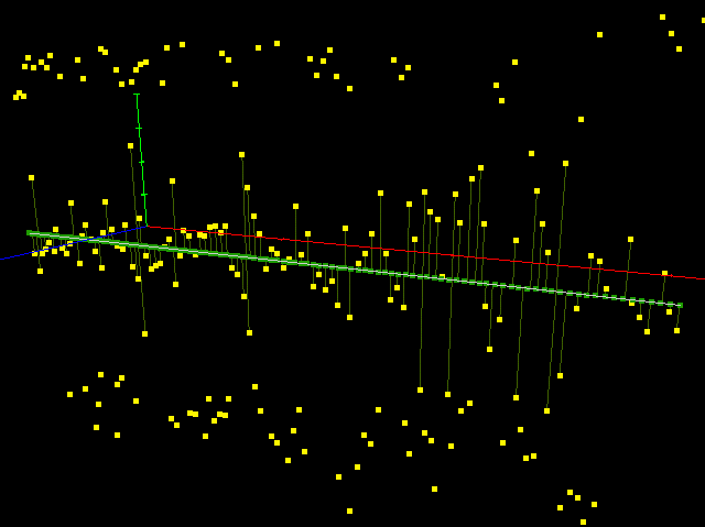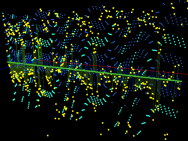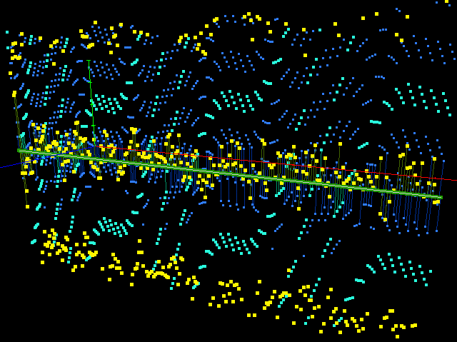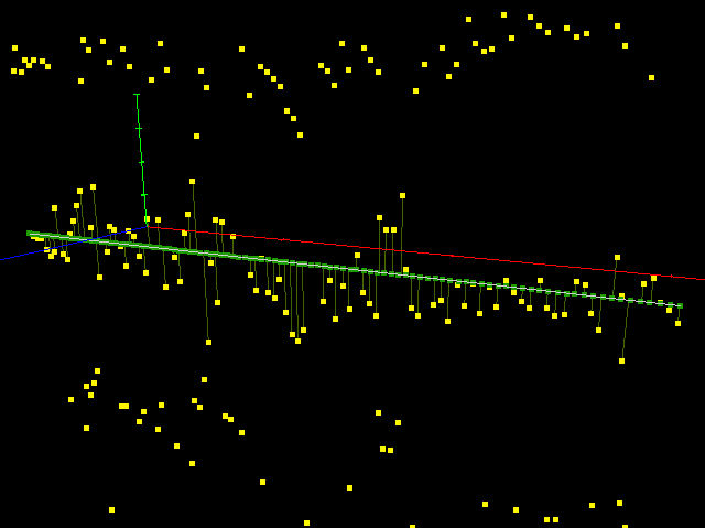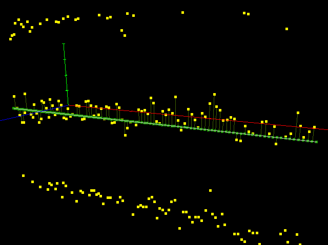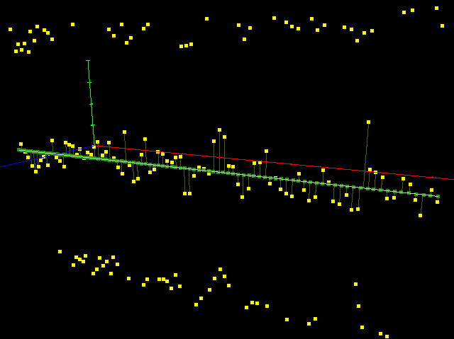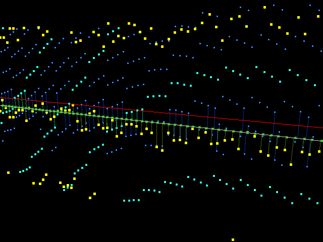 モーフィングによる映像素材では、タッピングのデータはデータ軸のわずか上方にあるために、映像ビートの単位だけずれた同じデータ群は画面下方にだけ出現した。 これは、この被験者が映像ビートに対して、ほぼ一律にわずかに遅れた時点をタッピングの「ヒット点」として認識していることの証しである。 これに対して、上図のように上下にほぼ同等に出現するのは、タッピングのデータが完全にデータ軸の中央に平均を持っているからであるが、モーフィング素材ではこれはほとんど見られない現象なのである。