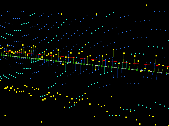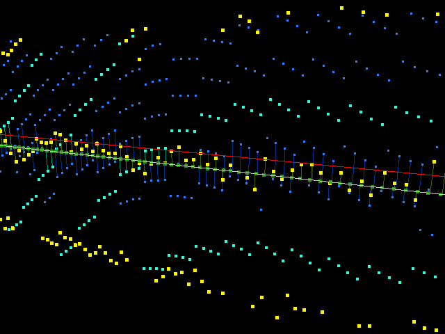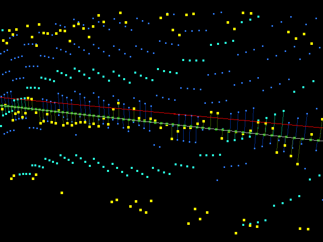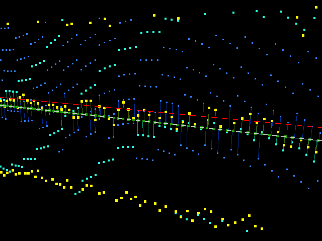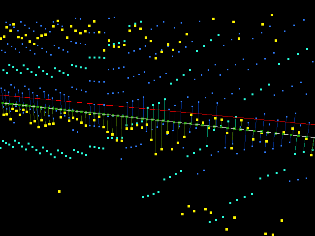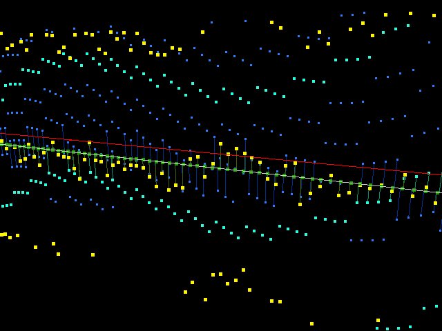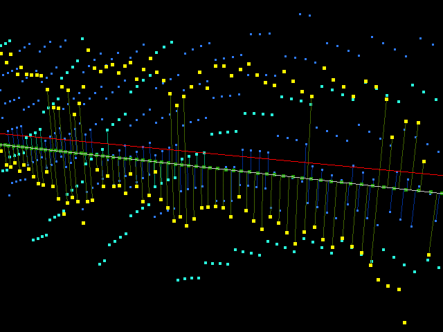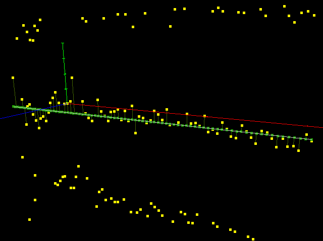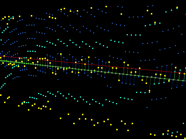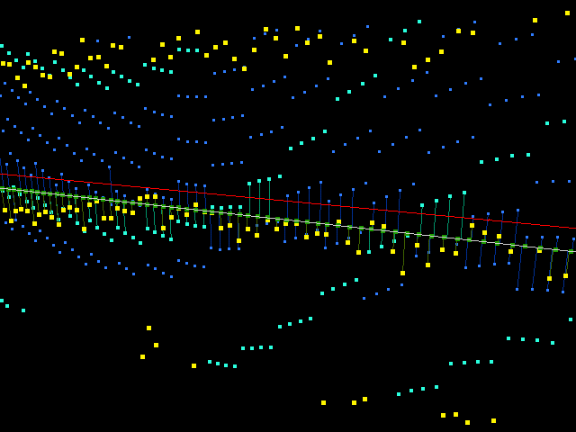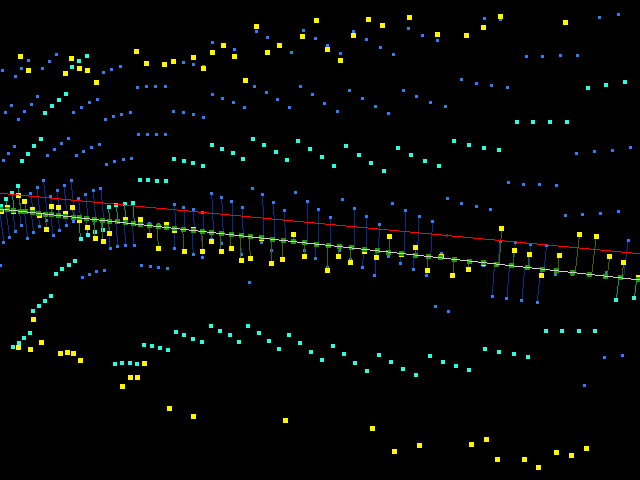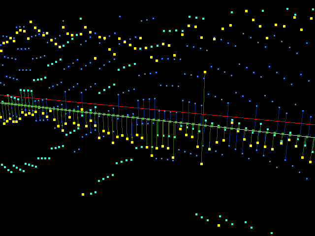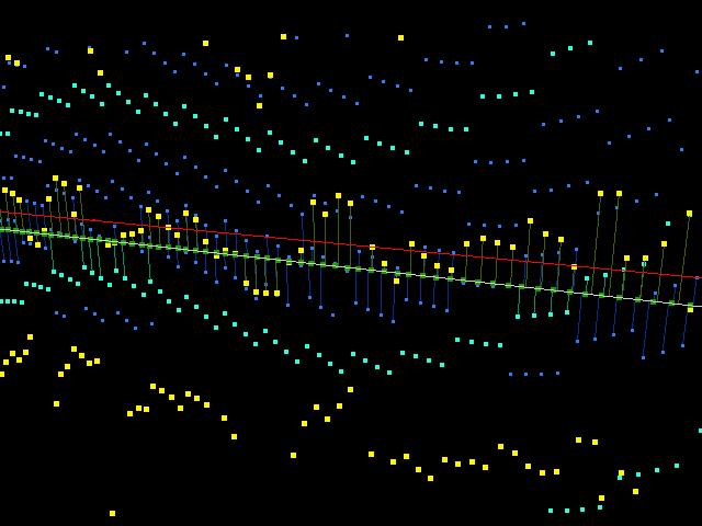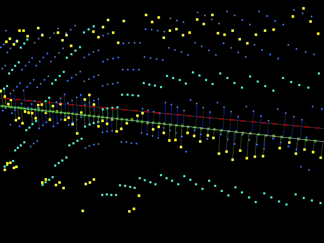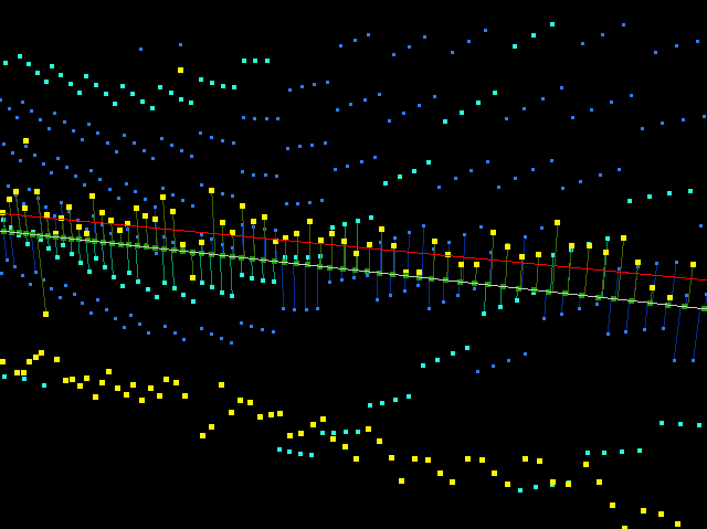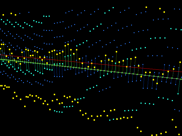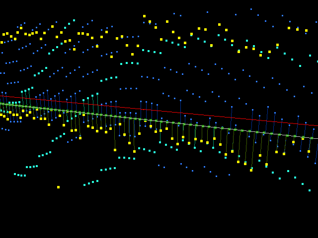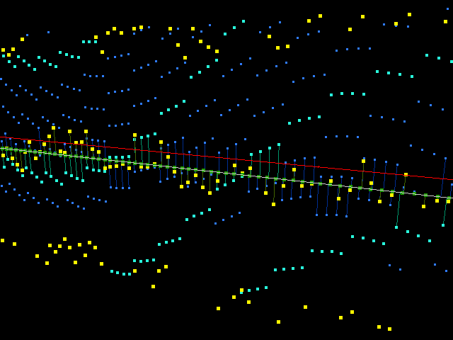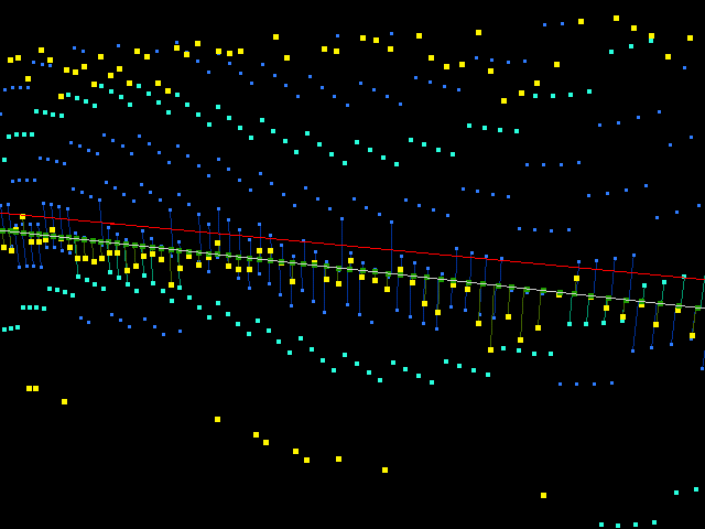 下図はこの全体図のいちばん最初の部分を、データ軸方向(X軸方向)に拡大表示した例である。 実験の冒頭はいきなり映像も音楽も始まるので、、最初のあたりは映像ビートとタッピングデータとがばらばらに離れている。