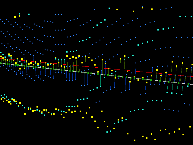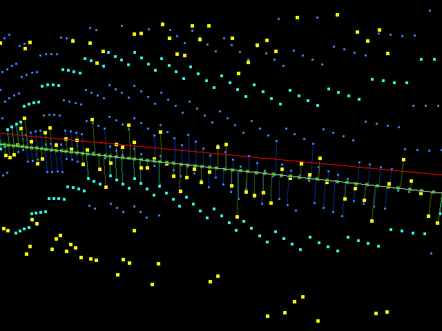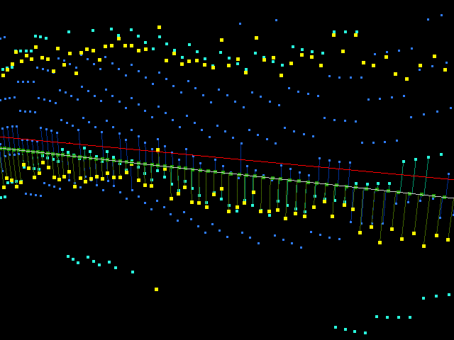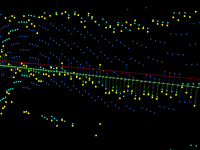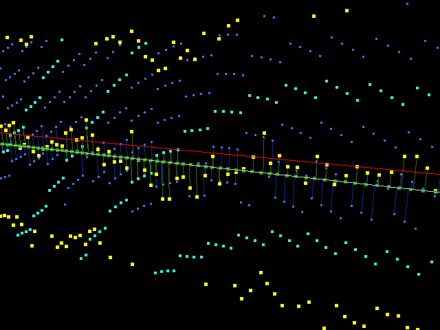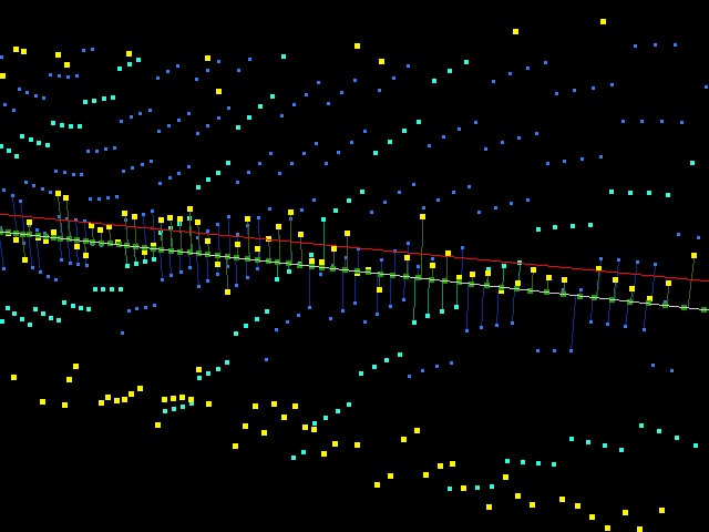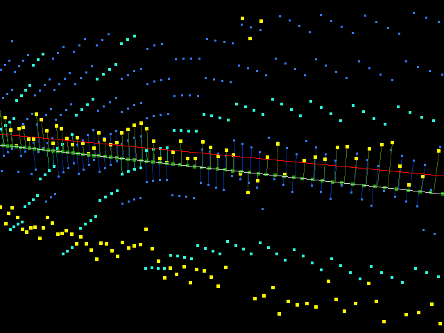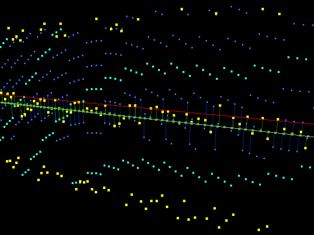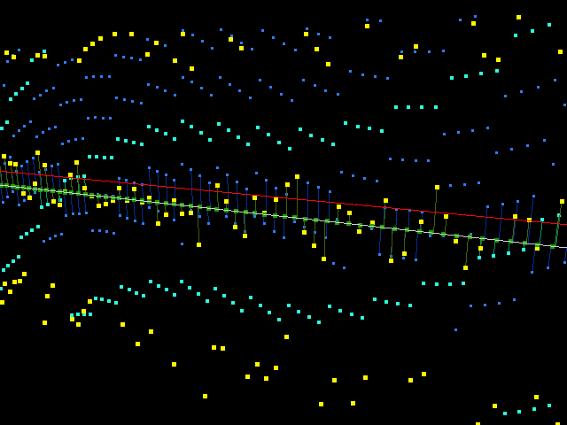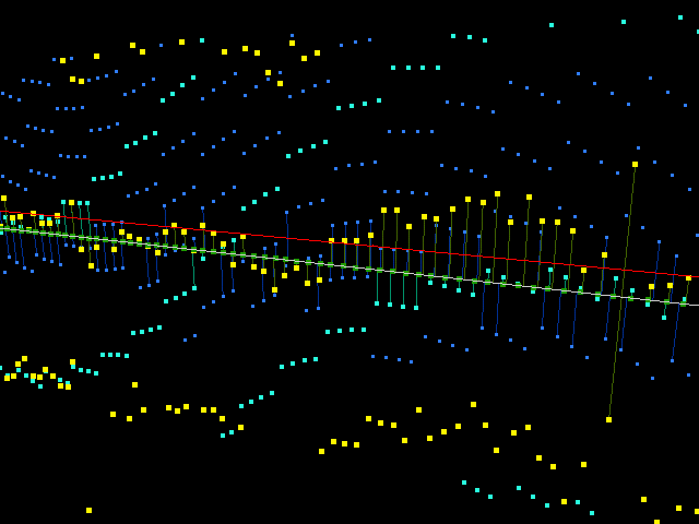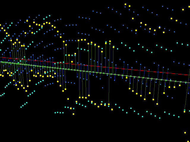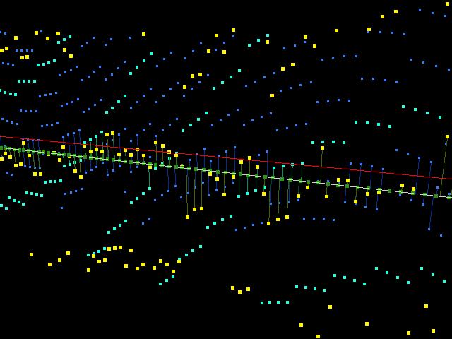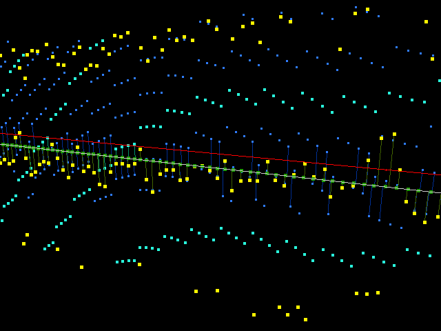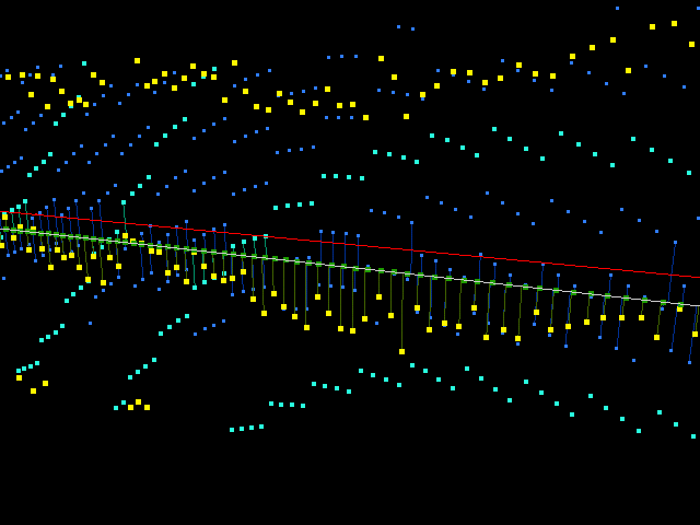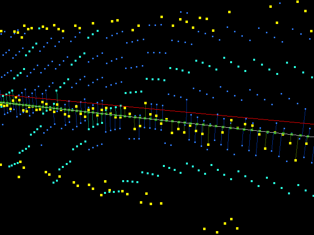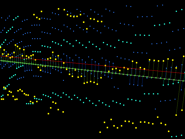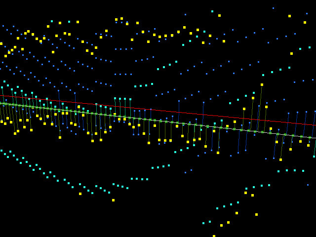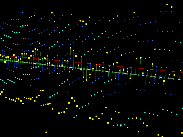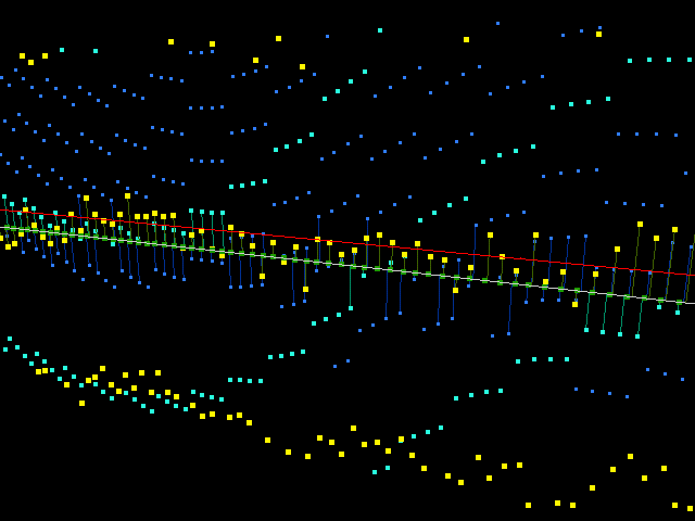 下図はこの全体図のいちばん最初の部分を、データ軸方向(X軸方向)に拡大表示した例である。 実験の冒頭はいきなり映像も音楽も始まるので、、最初のあたりは映像ビートとタッピングデータとがばらばらに離れている。