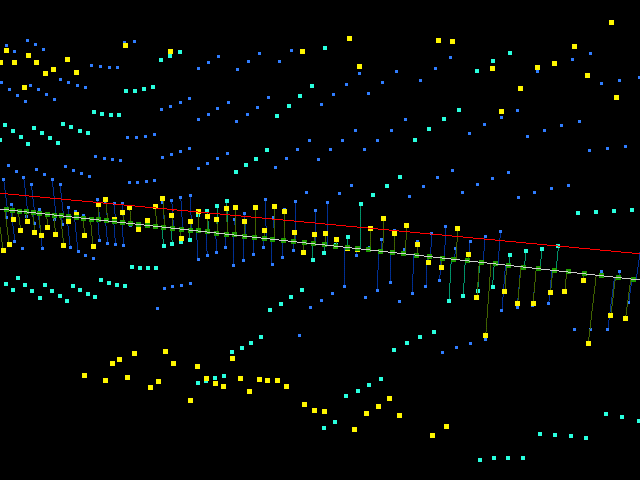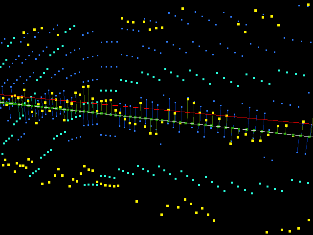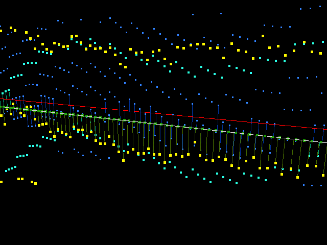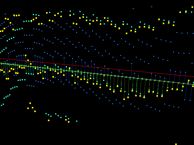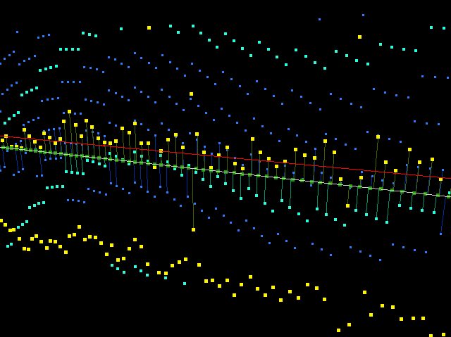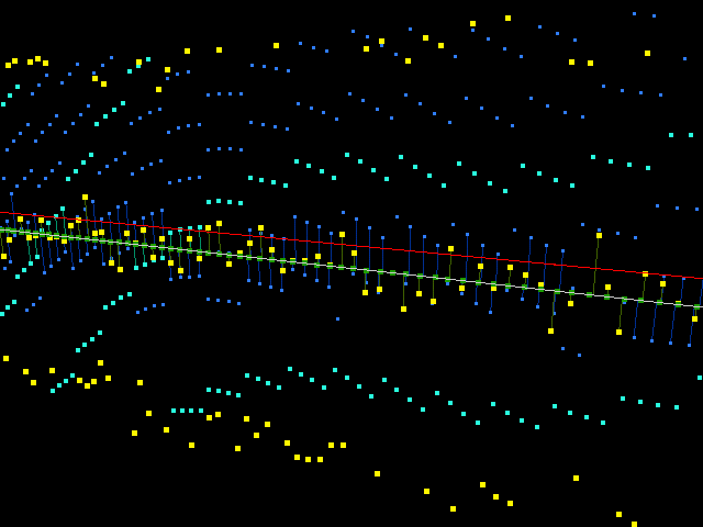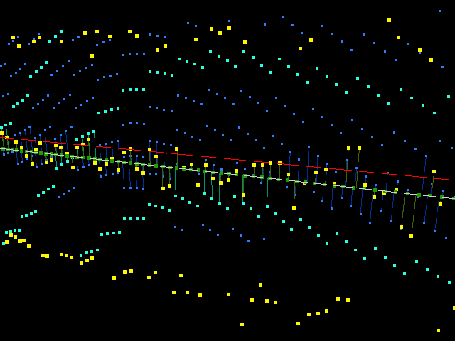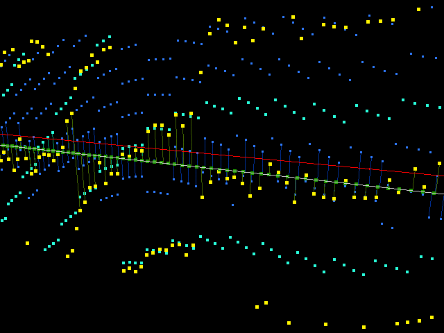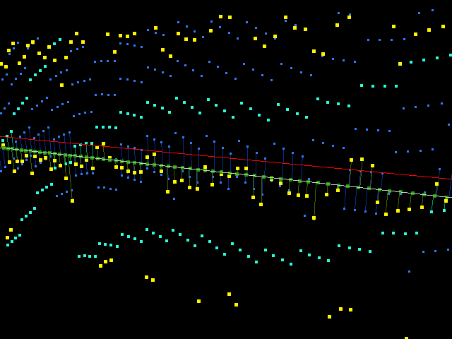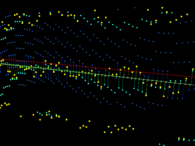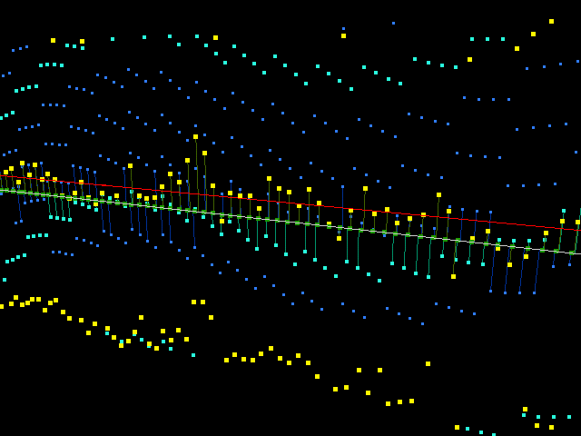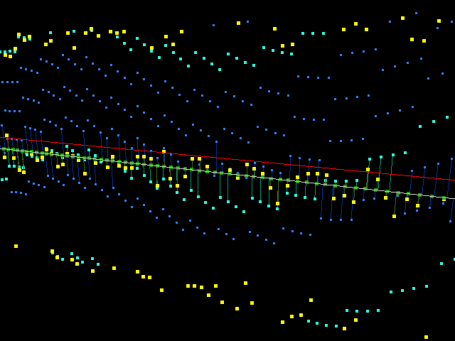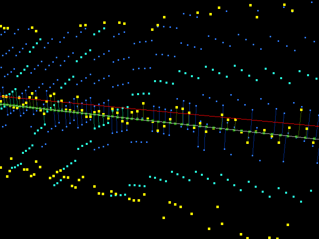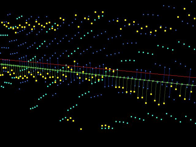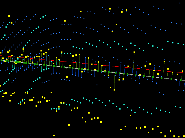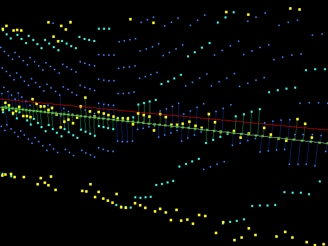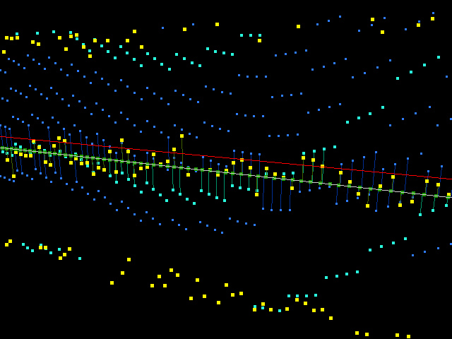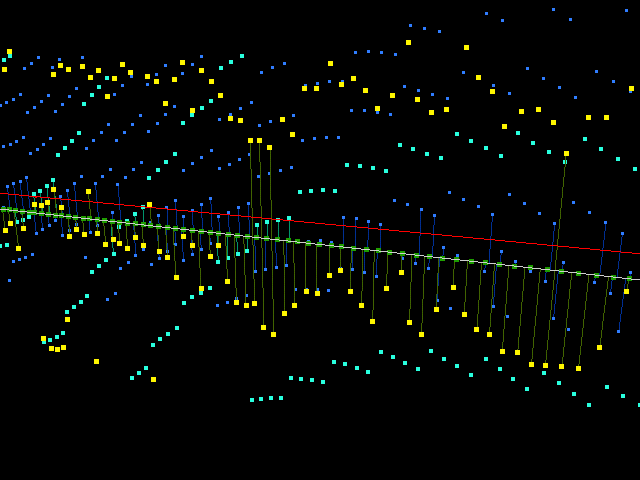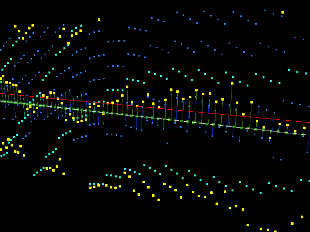 下図はこの全体図のいちばん最初の部分を、データ軸方向(X軸方向)に拡大表示した例である。 実験の冒頭はいきなり映像も音楽も始まるので、、最初のあたりは映像ビートとタッピングデータとがばらばらに離れている。